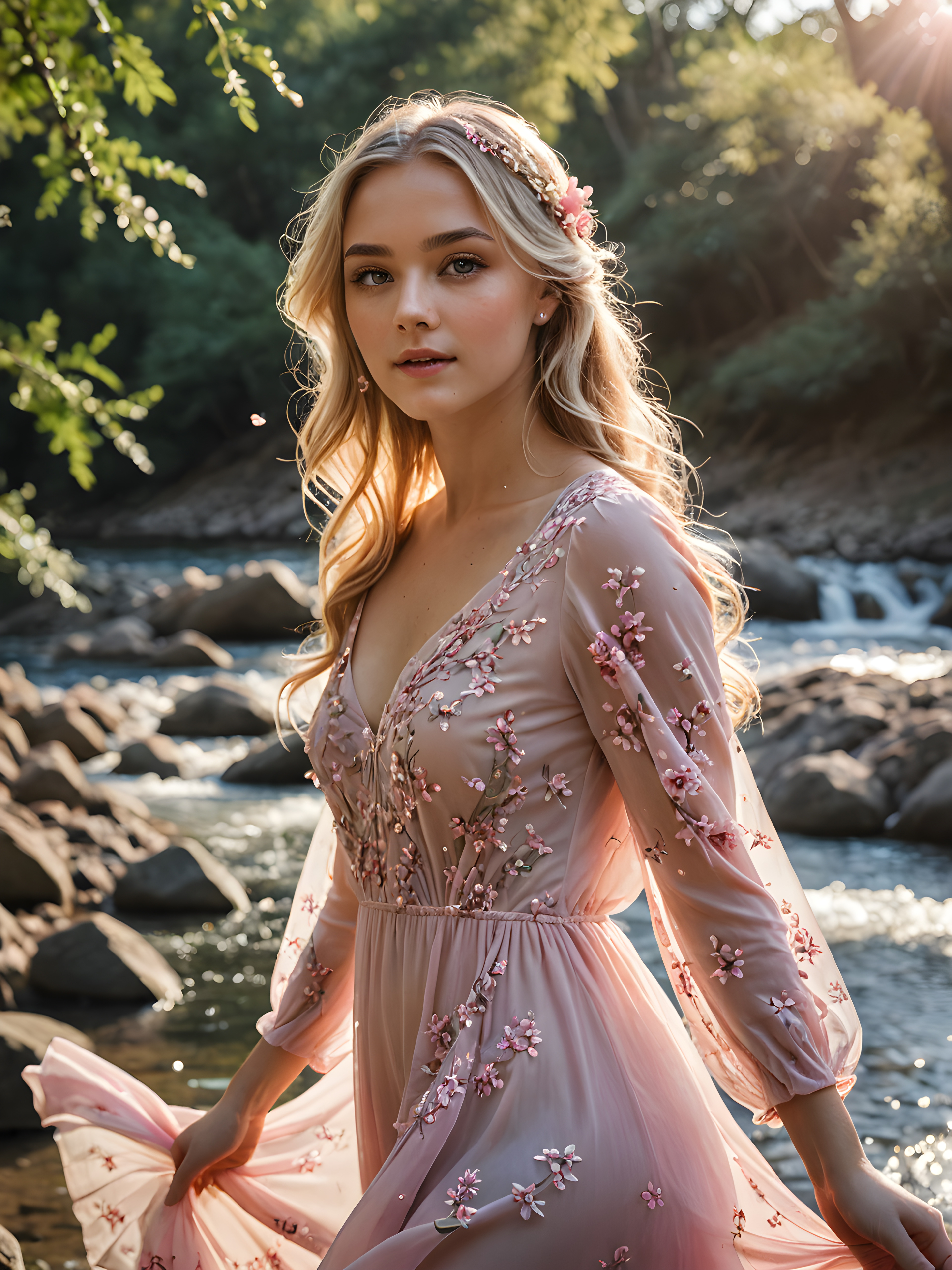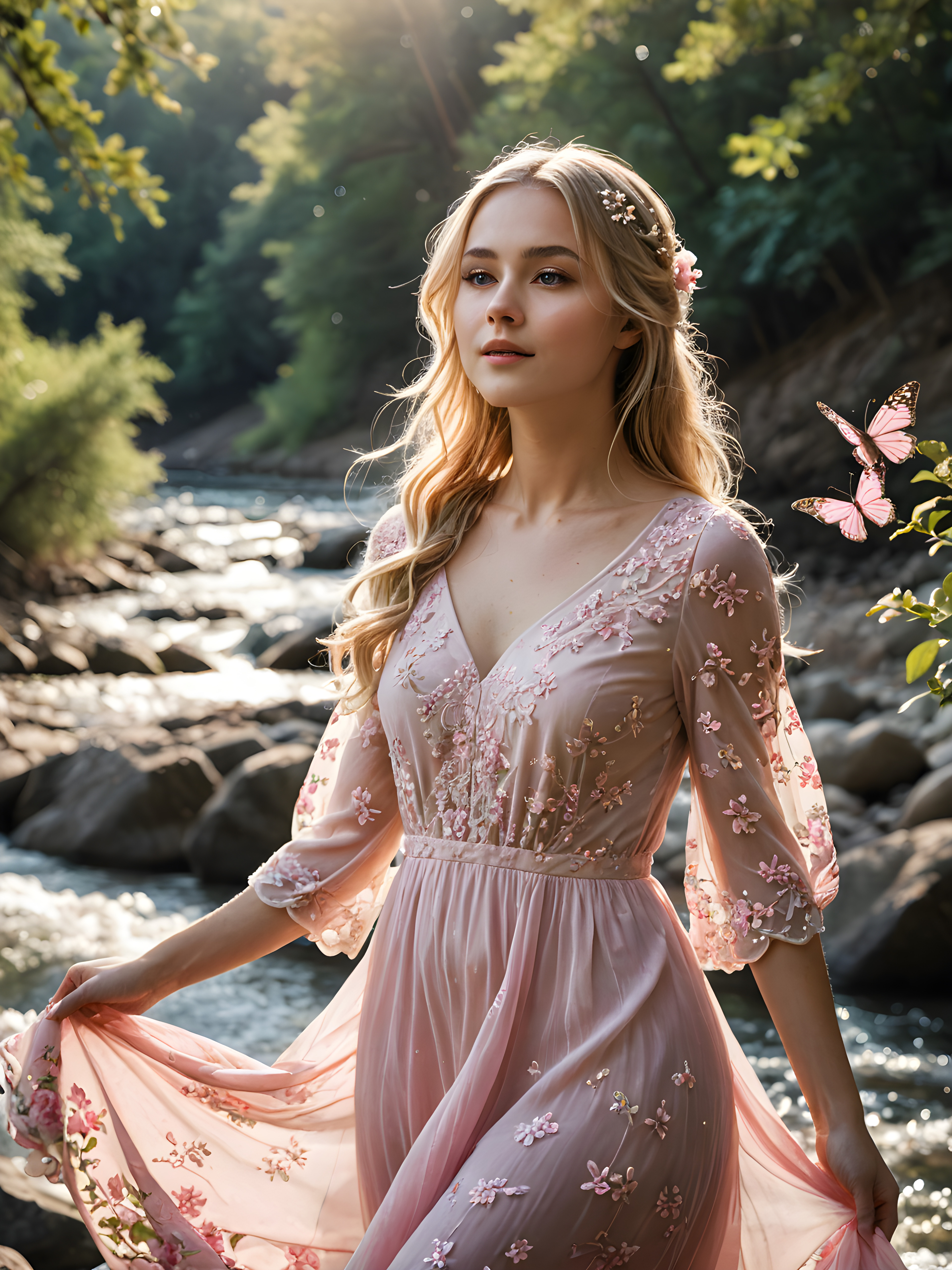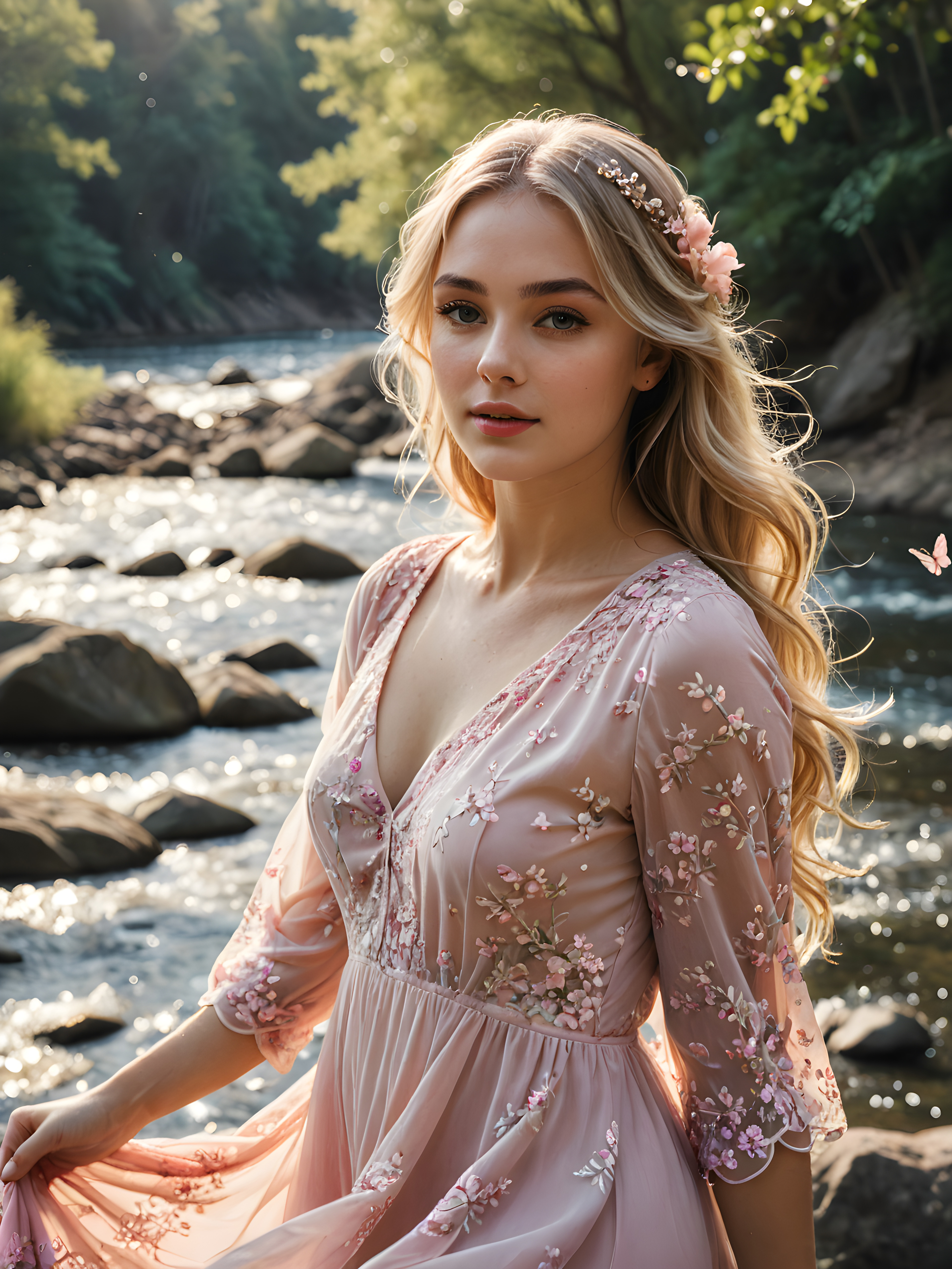 a (((breathtakingly beautiful girl))), with a (((soft, melancholic expression))), standing serenely by a (((flowing river))), where her long, blonde locks gracefully dance with the current, framed by a delicate, flowing dress adorned with a ((delicate pink floral pattern)) that shimmers in the sunlight, with tiny droplets of sparkling water reflecting off her face and flowing hair and butterflies fluttering around