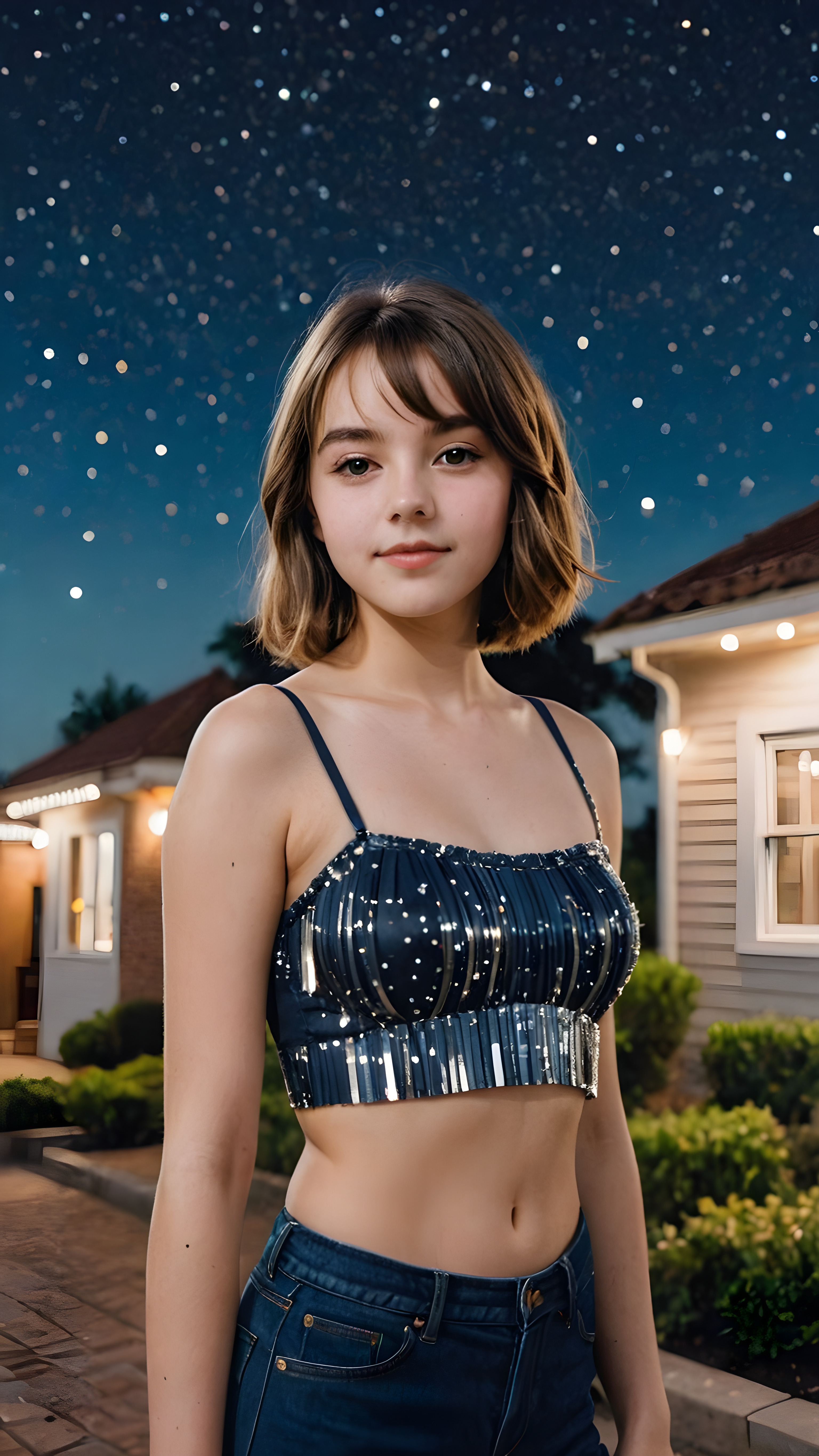 a (((vividly detailed advanced portrait))) of a (((sweetly teen girl))) with flowing, shoulder-length hair styled in bob-cut fringe patterns, dressed in a sleek, party crop top, revealing a gorgeously proportioned, softly curved figure, captured in a full-body scene under a starry night backdrop