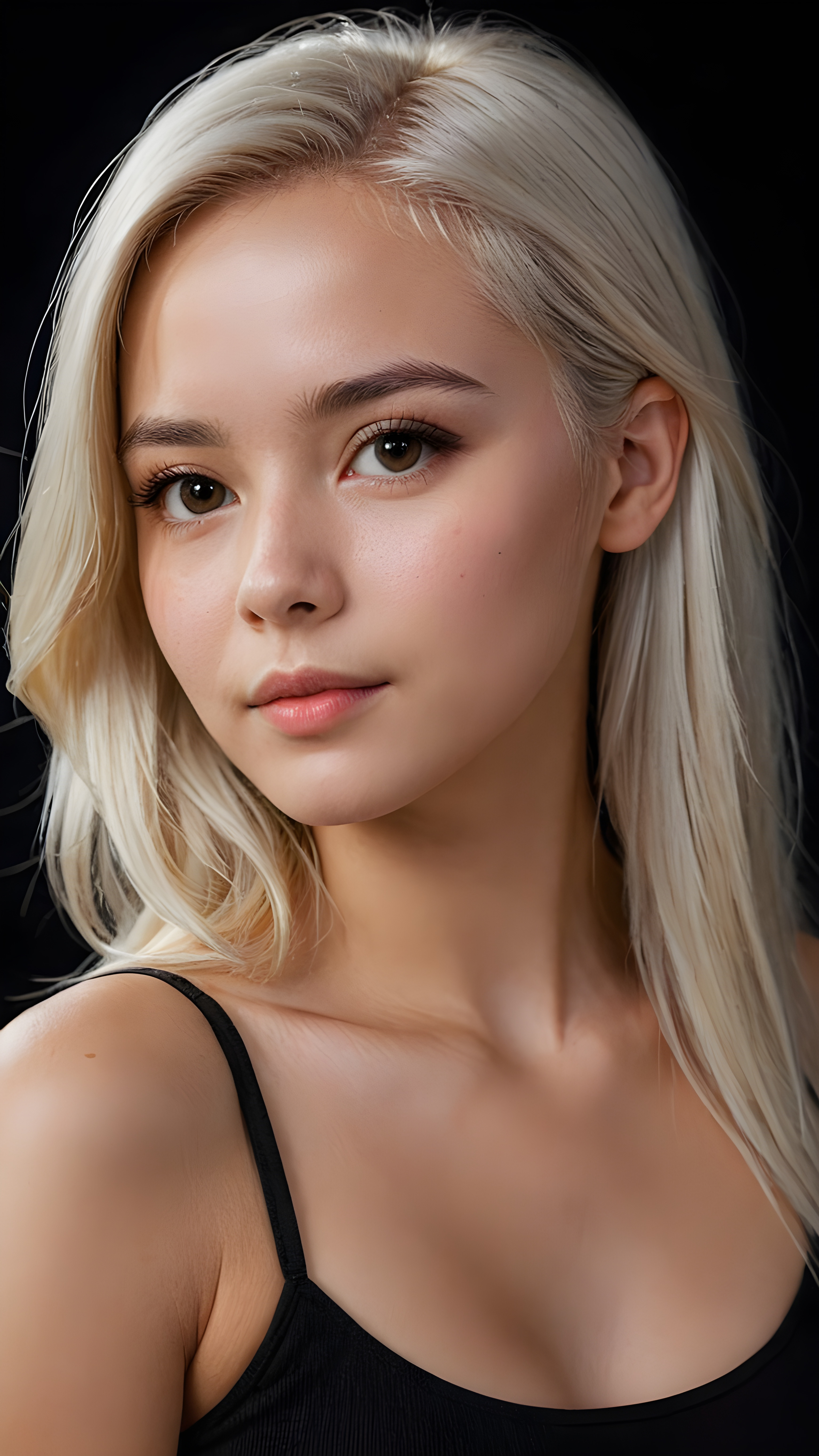 ((side view portrait)) a cute young woman, platinum white straight hair, night, looks at viewer and dim light falls on her face, dark background. cinematic light, perfect shadow