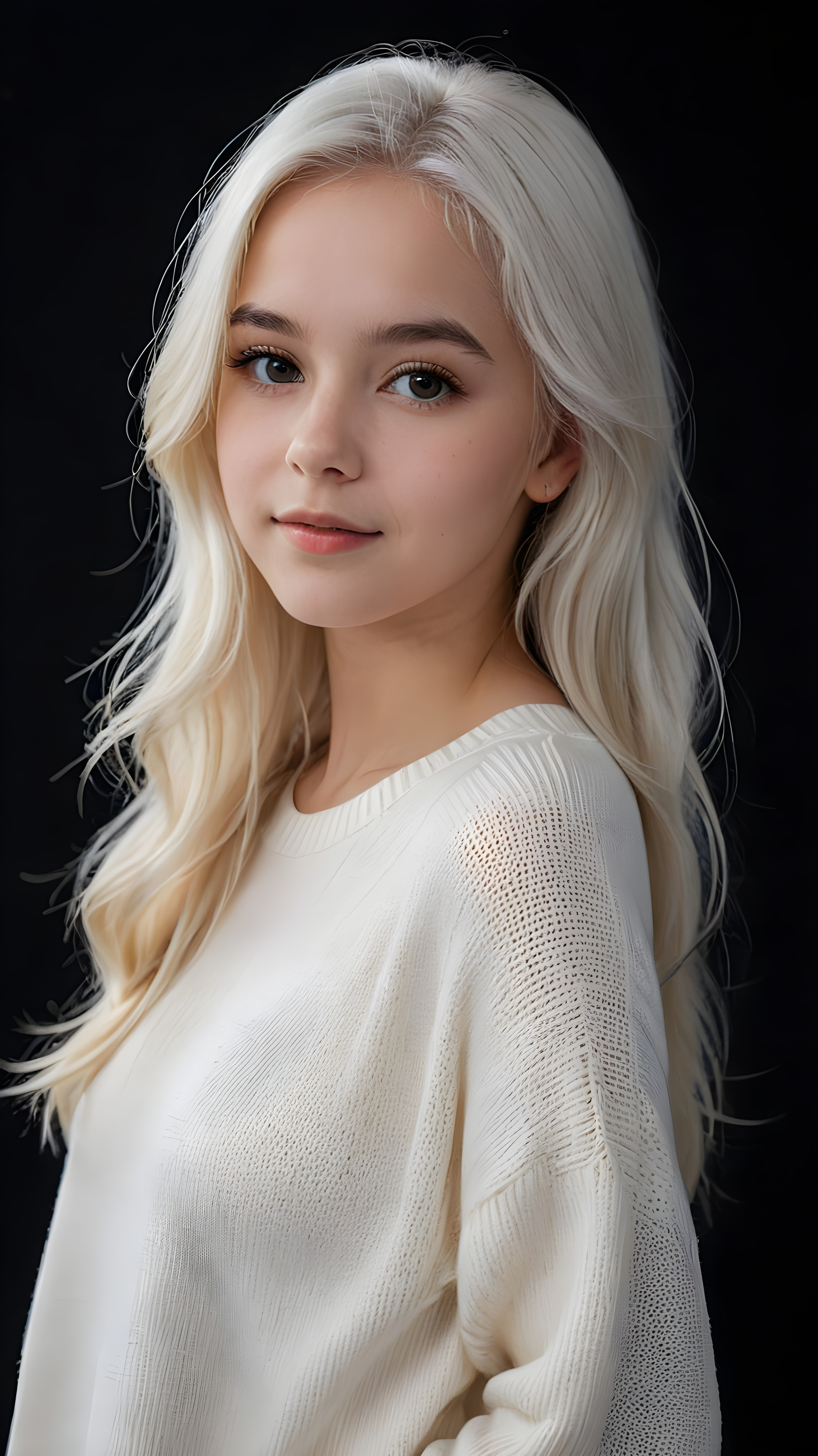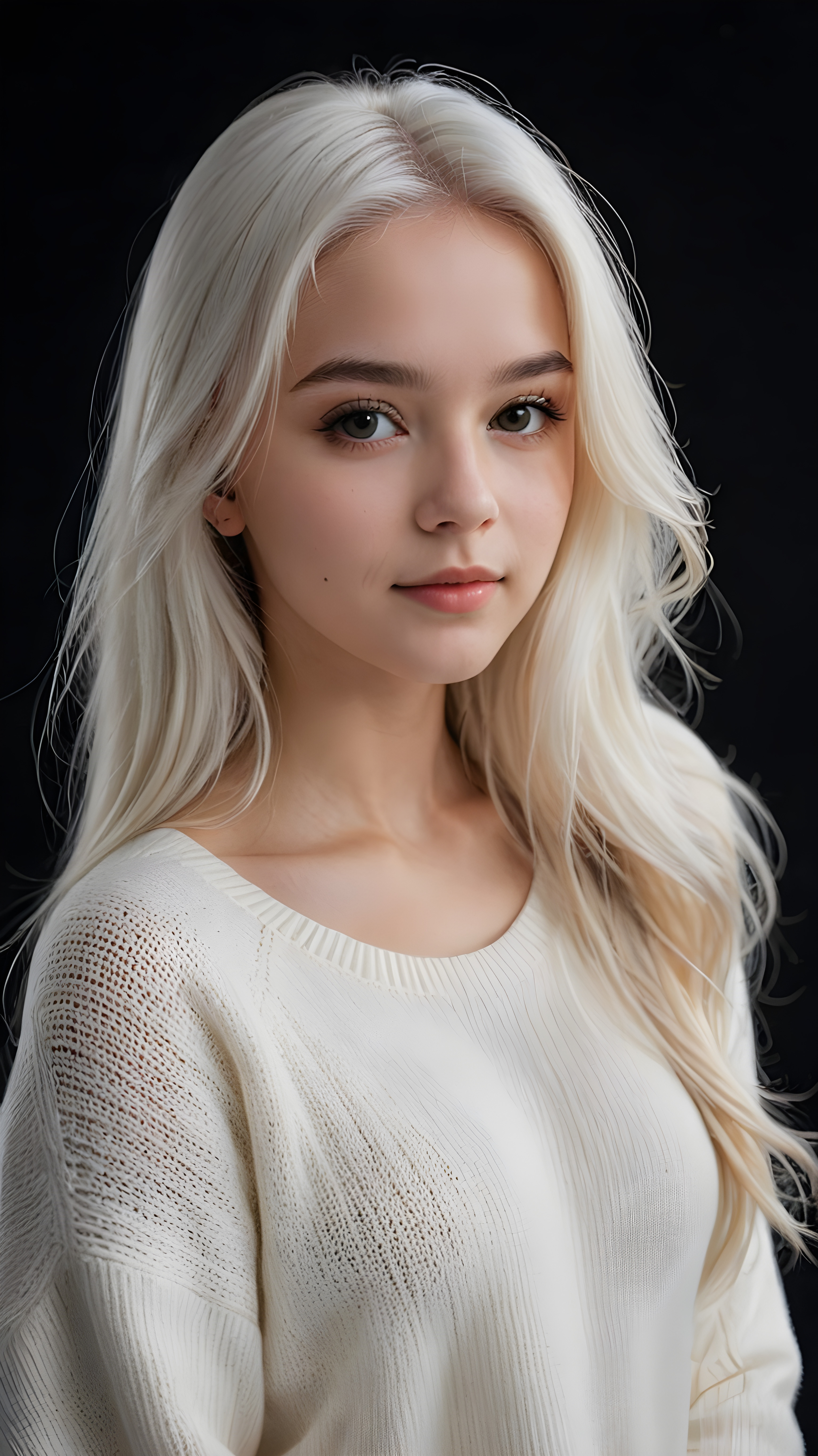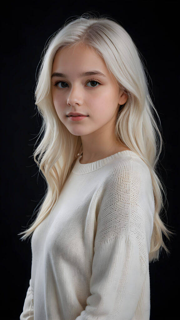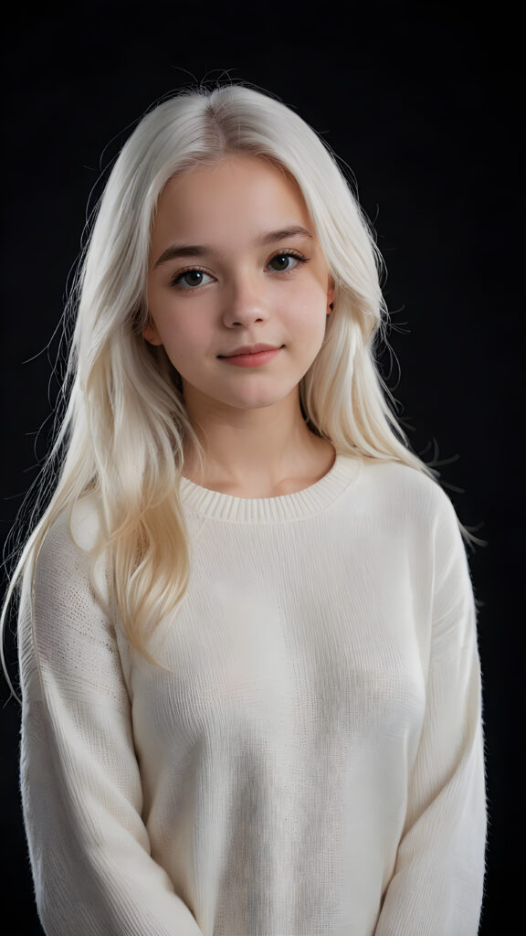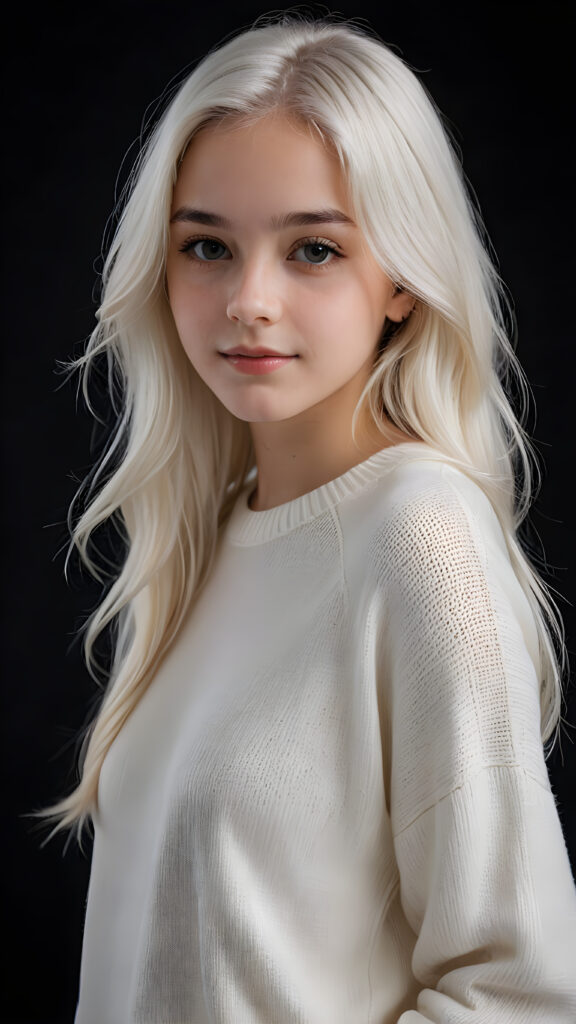 ((stunning)) ((gorgeous)) a beautiful teen girl, 14 years old, perfect portrait, perfect curved body, long straight platinum white hair, wears a white sweater, white silhouette, black background