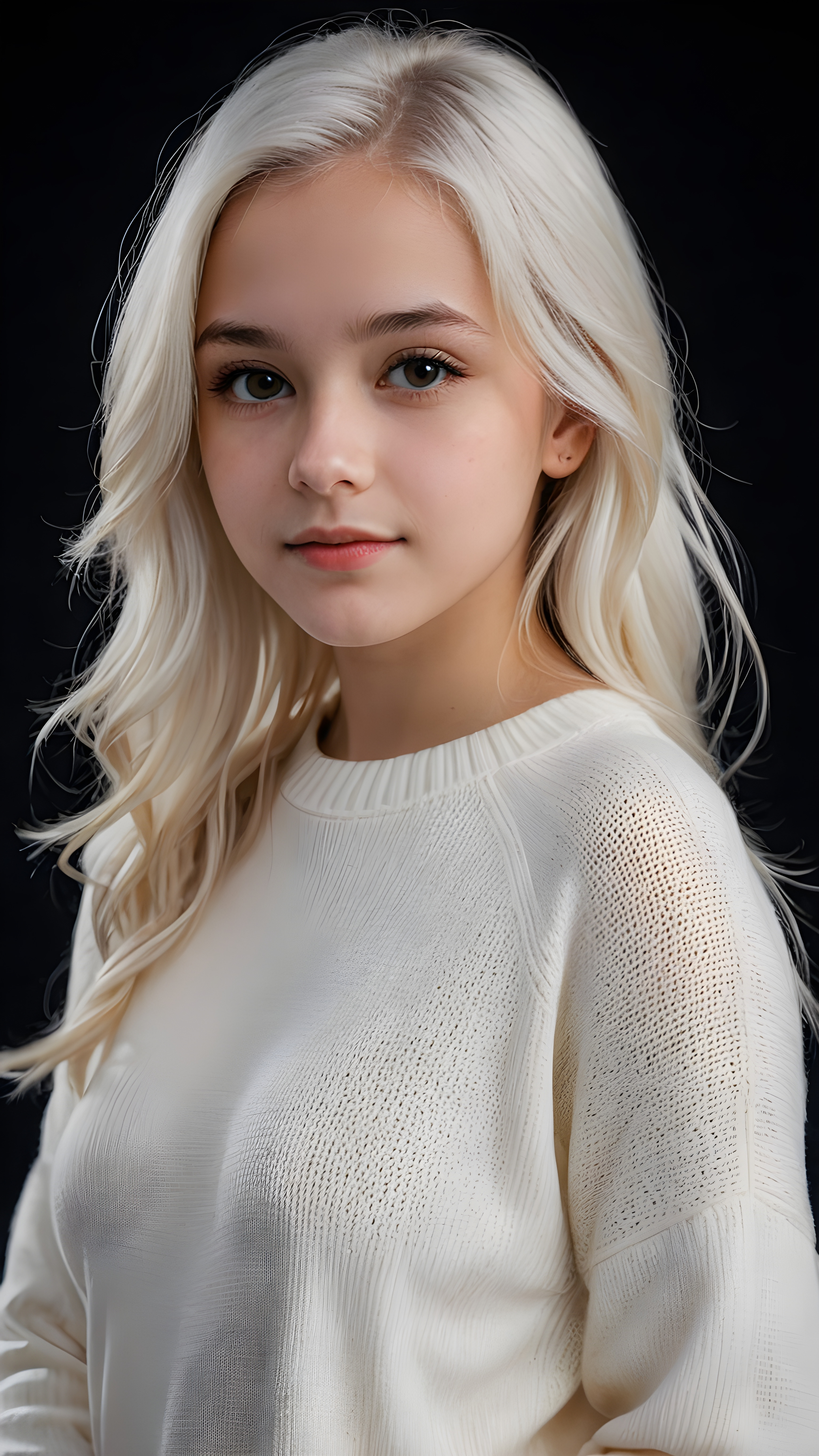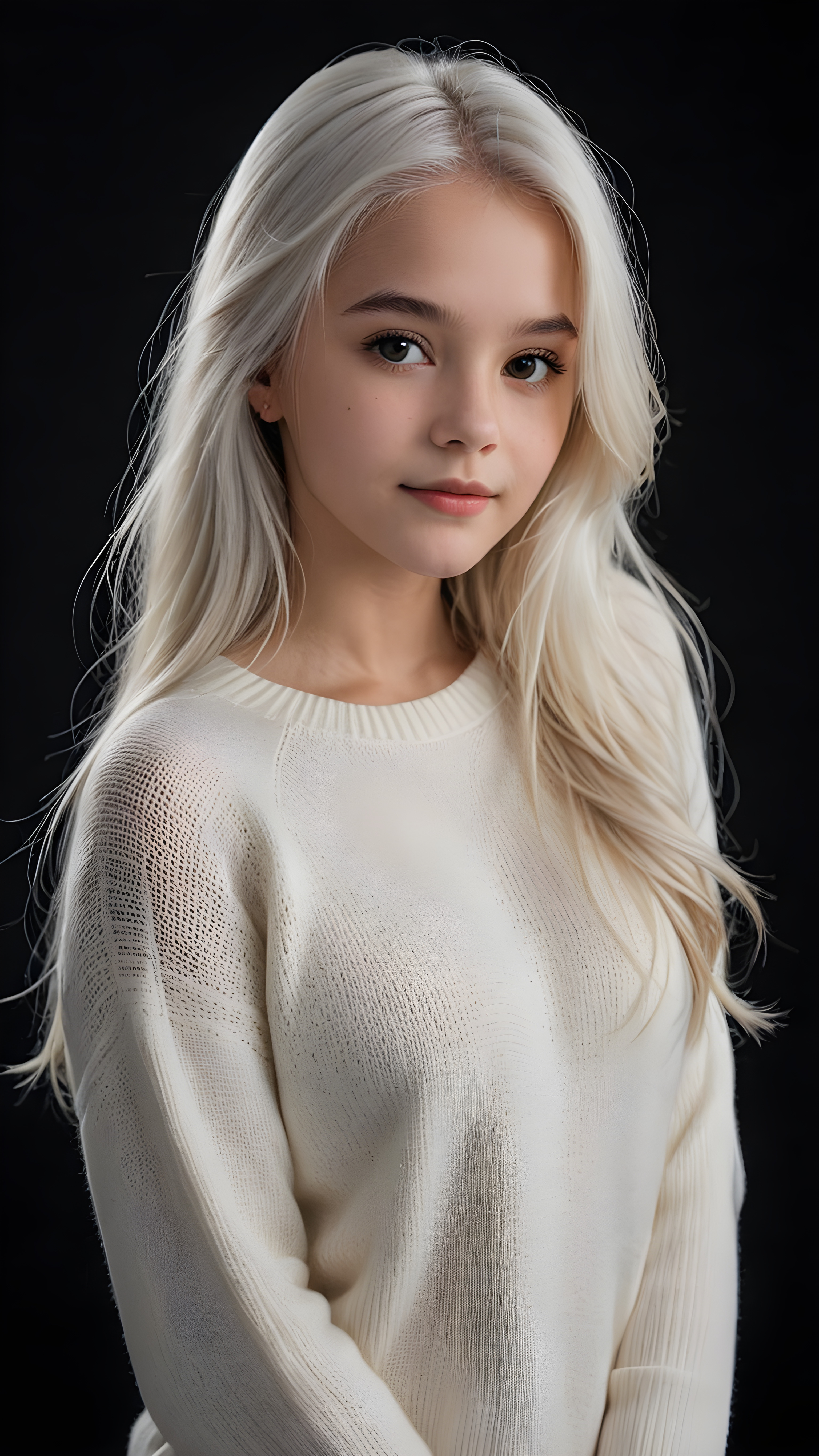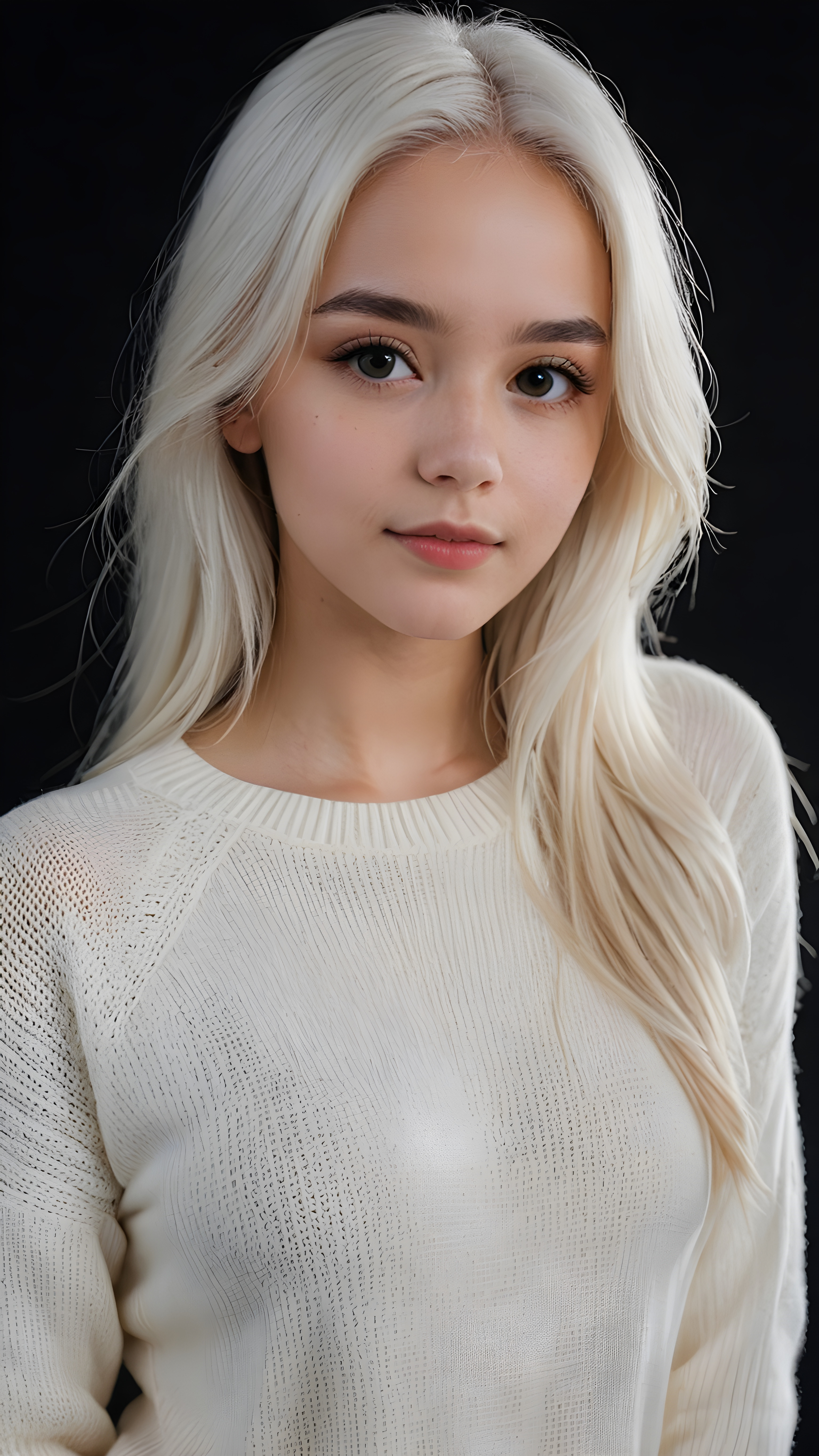 ((stunning)) ((gorgeous)) a beautiful teen girl, 14 years old, perfect portrait, perfect curved body, long straight platinum white hair, wears a white sweater, white silhouette, black background