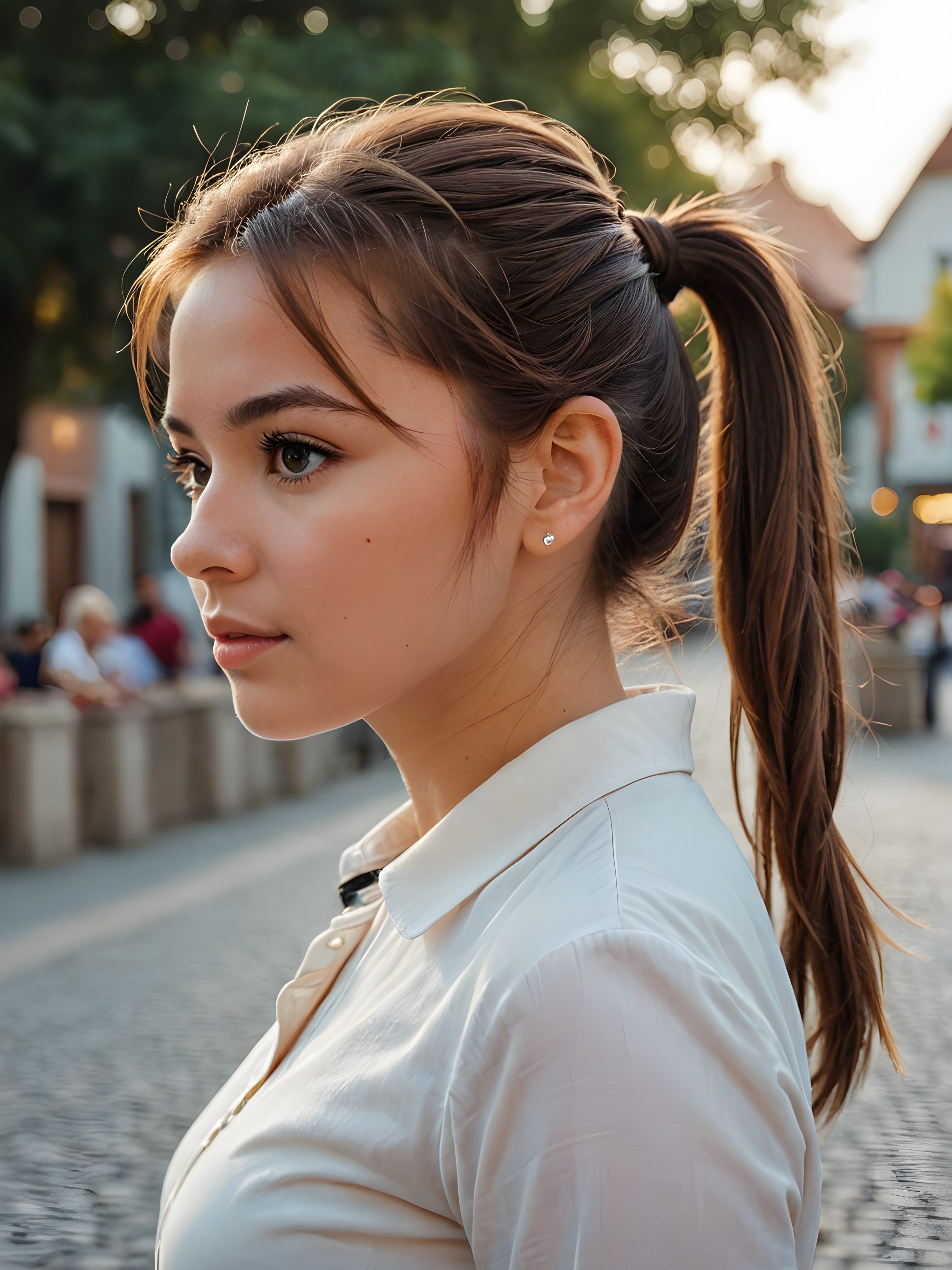 (detailed portrait, side view)) a girl, brown hair, her hair tied into a pony tail