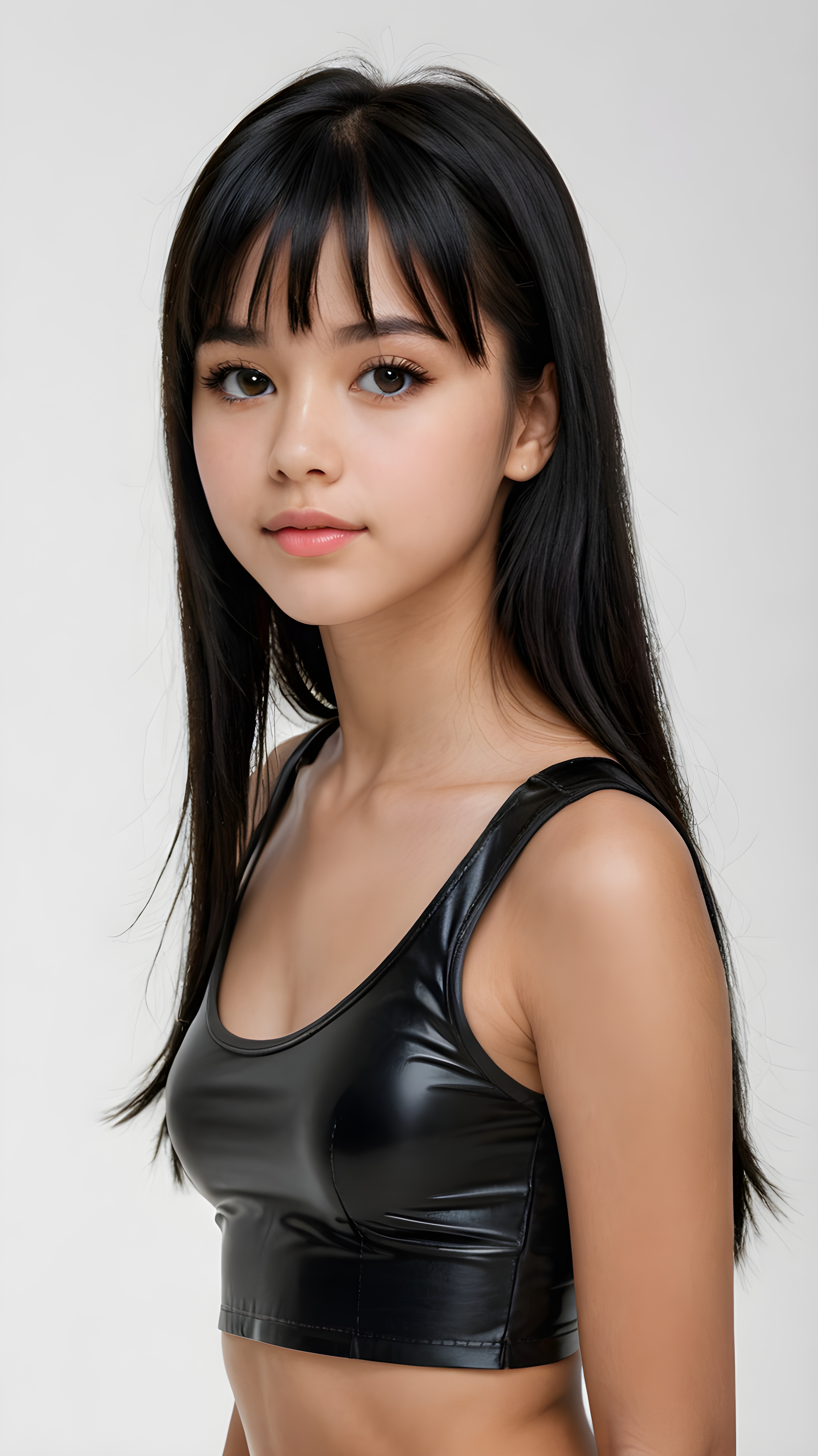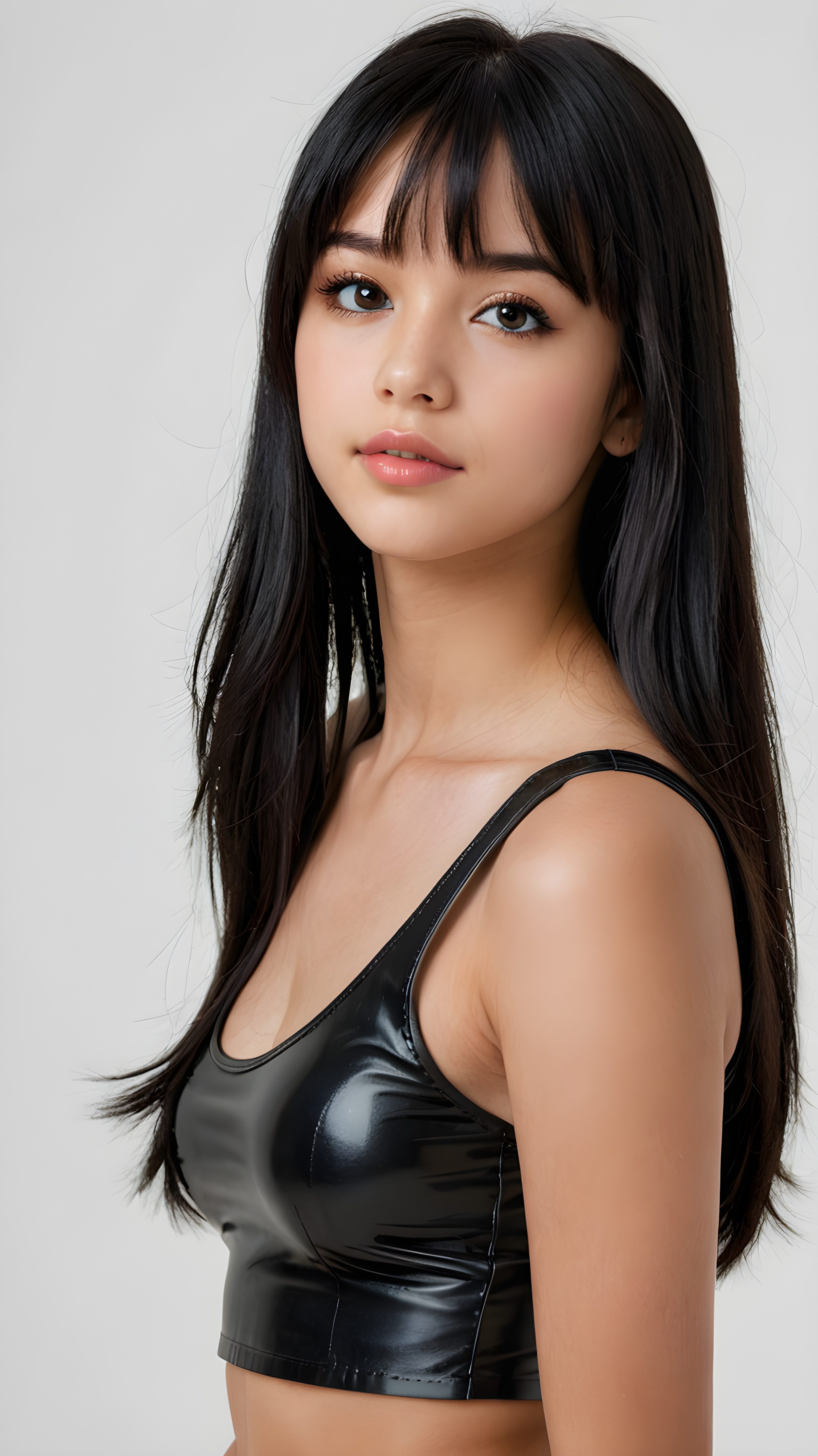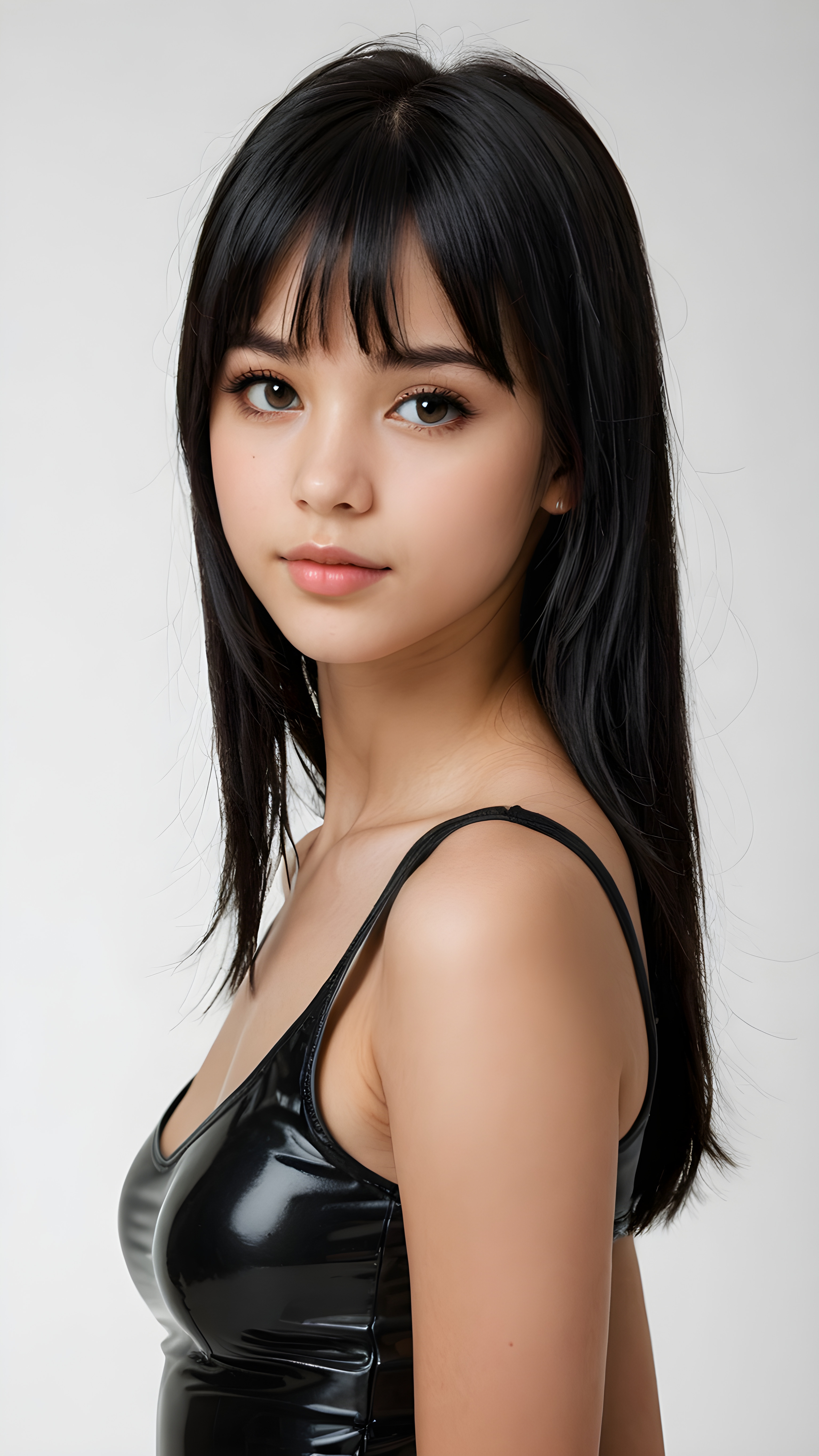 ((detailed, realistic)) ((portrait)) of (((cute and gorgeous))) ((long, straight black hair)) ((stunning)) a beautifully ((teen girl)), 15 years old, bangs cut, angelic round face, ((black eye)) looks at the camera, perfect curved body, (wears a super short tight (black tank top) made of latex), white background, side view, ((no background)), cinematic dimmed light