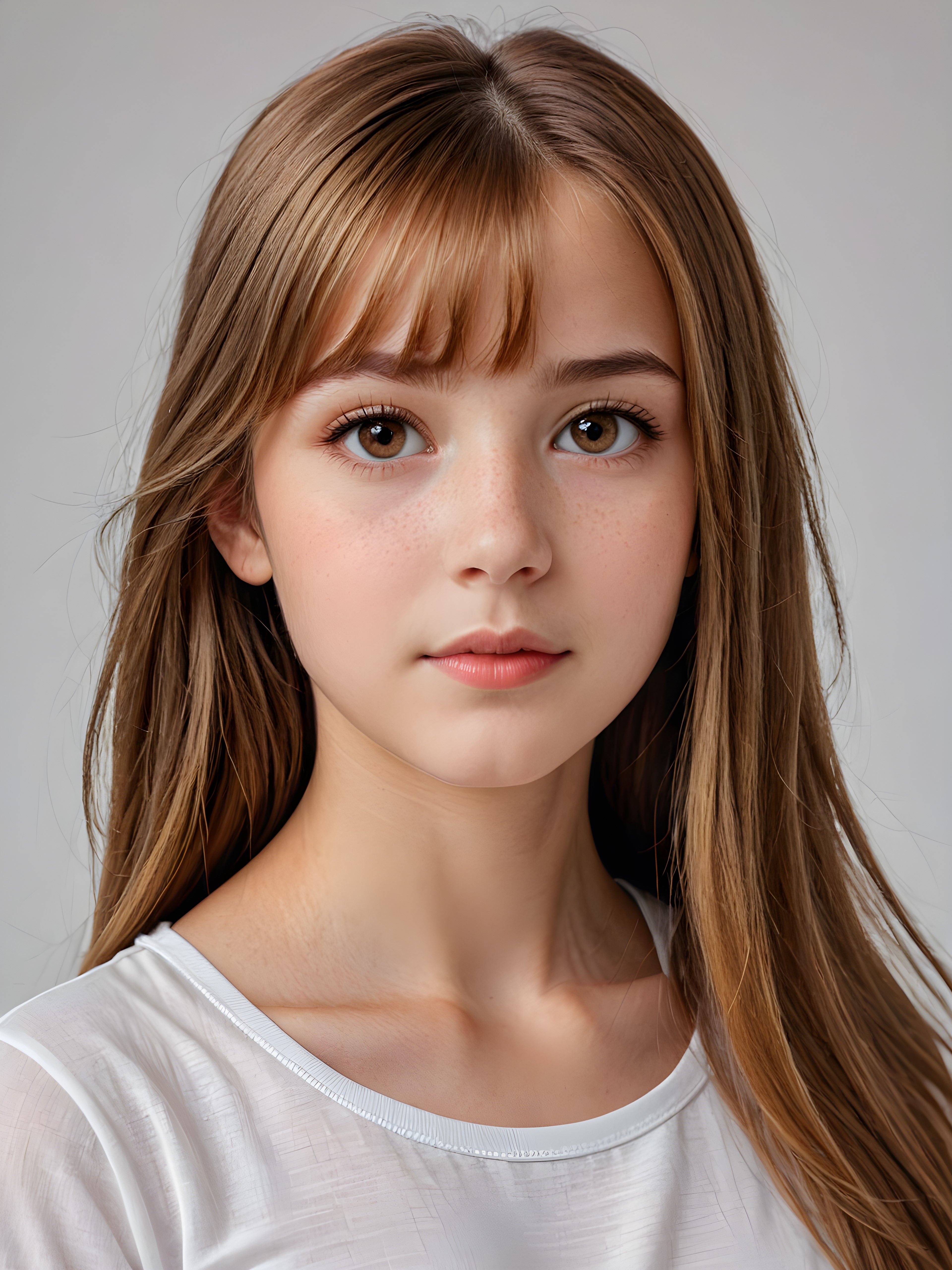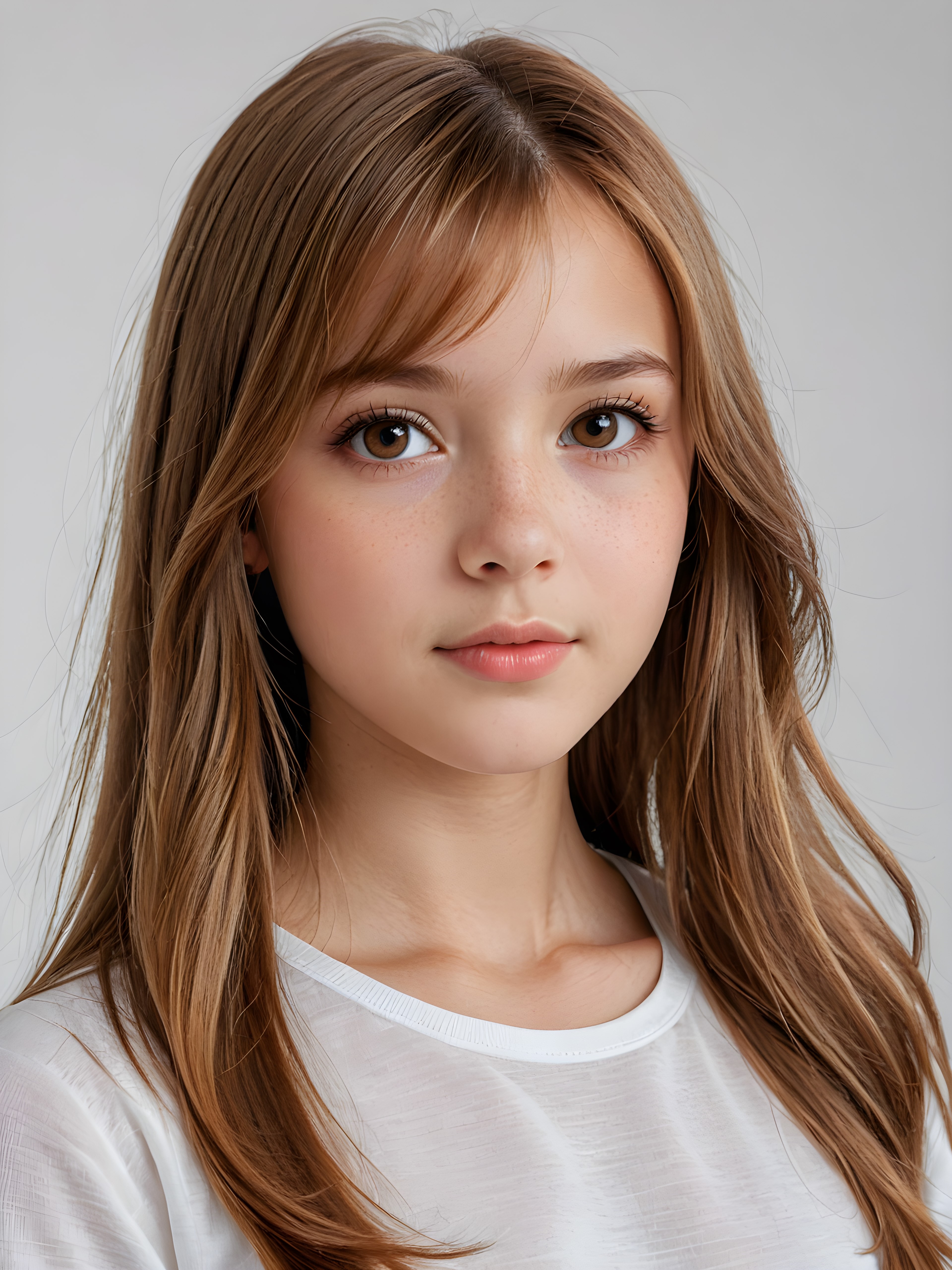 ((detailed, realistic)) ((portrait)) of (((cute and gorgeous))) ((long, straight brown hair)) ((stunning)) a beautifully ((teen girl)), 15 years old, bangs cut, angelic round face, ((hazelnut eye)) looks at the camera, perfect curved body, (wears a super short tight (white tank top) made on thin silk), perfect anatomy, white background, side view, ((no background)), cinematic dimmed light