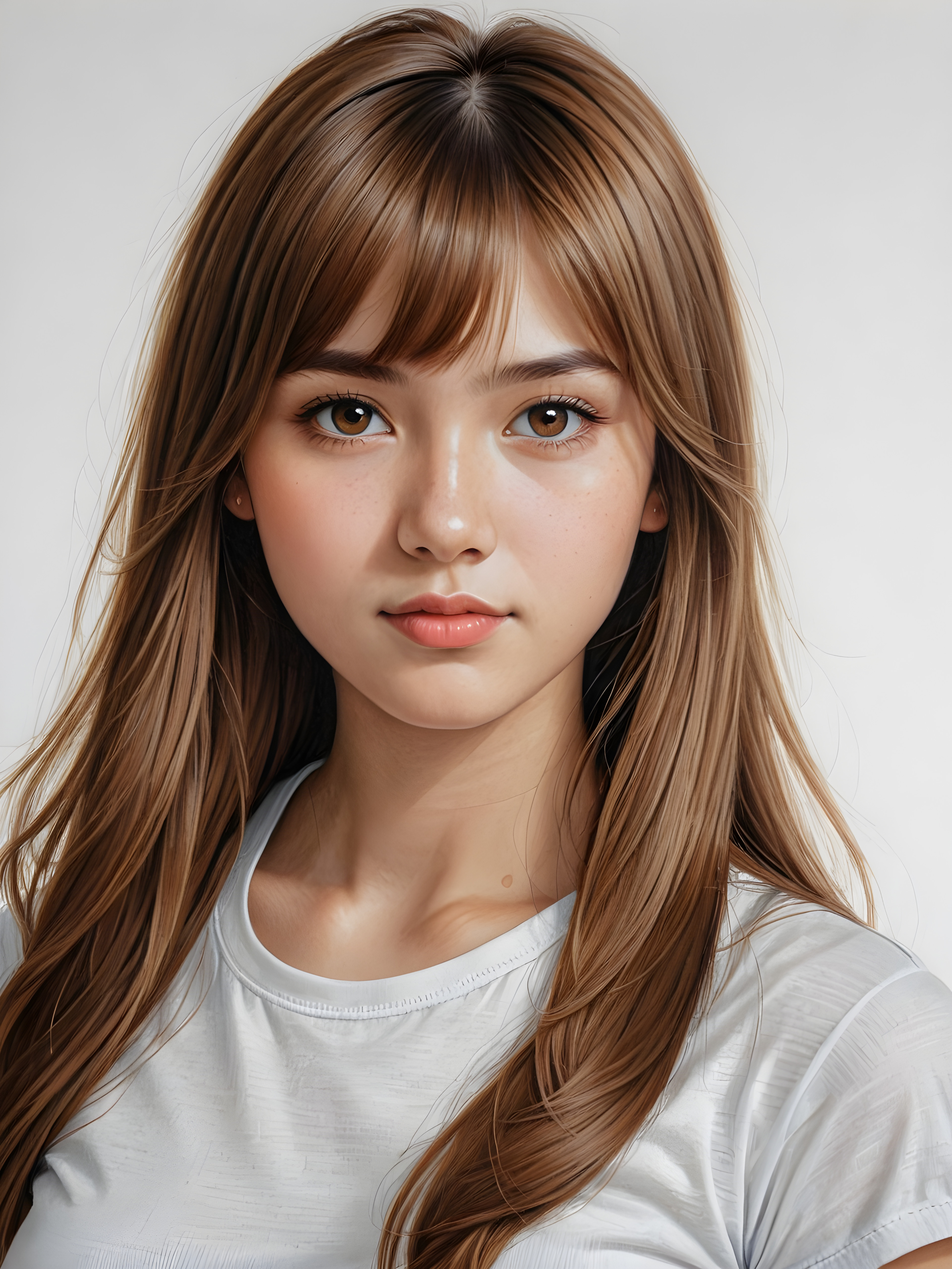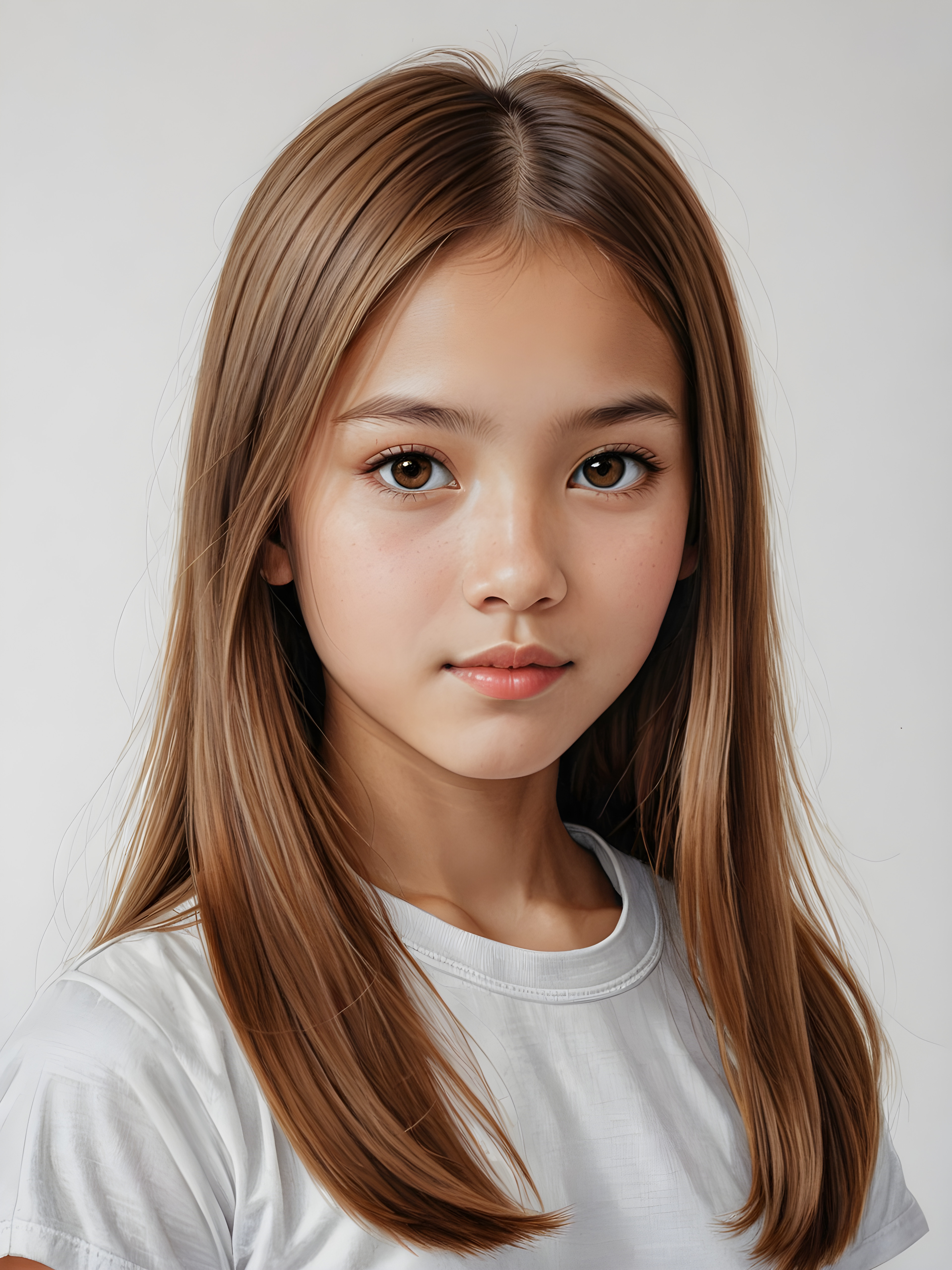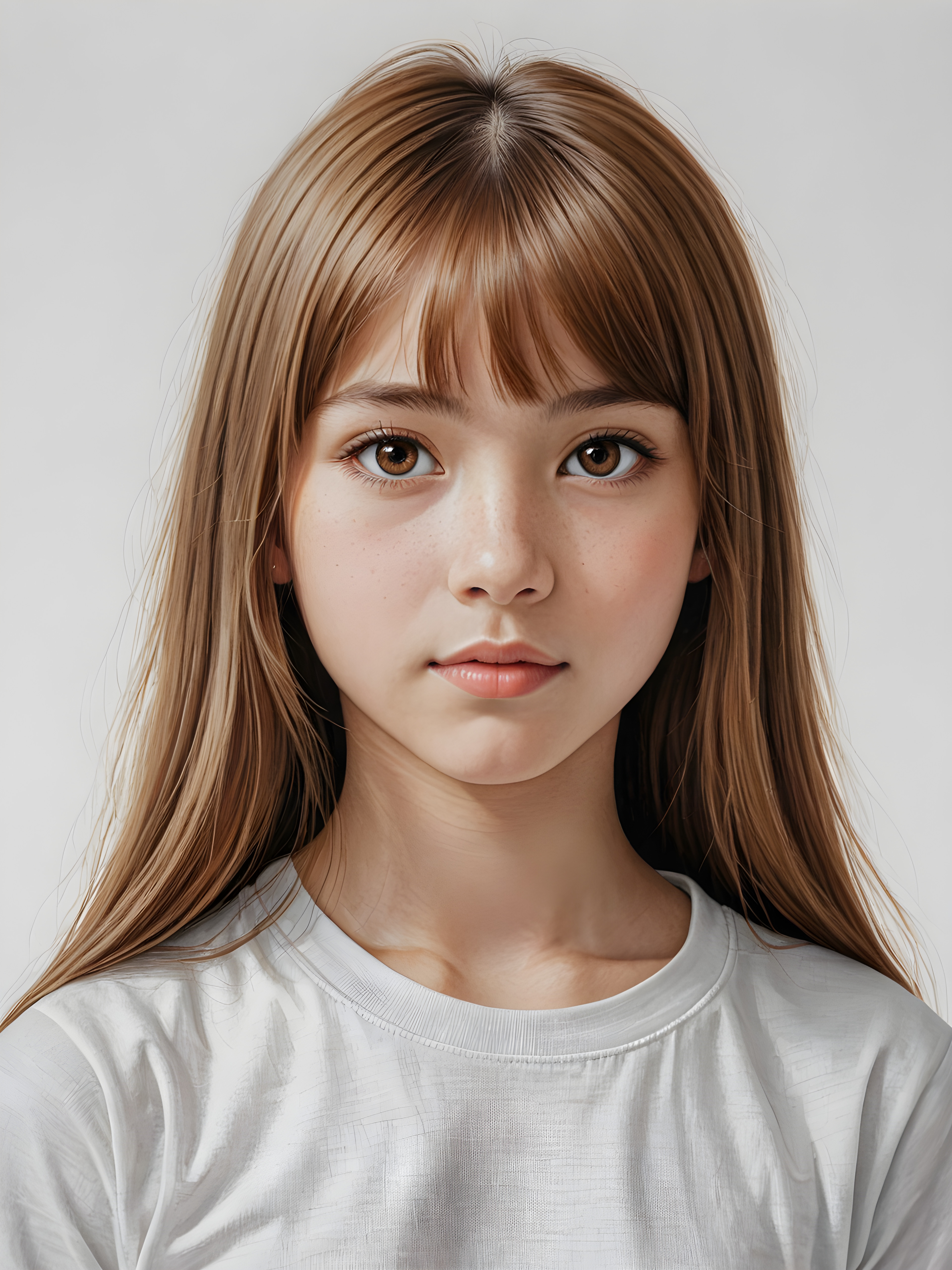 ((pencil drawing)) ((portrait)) of (((cute))) (((elegant))) ((attractive)) (((long, straight hazelnut hair))) ((stunning)) a beautifully realistic, cinematic lights, ((teen girl)), 11 years old, bangs cut, realistic detailed angelic round face, ((realistic detailed hazelnut eye)) looks sadly at the camera, portrait shot, perfect curved body, (wears a super short tight (white t-shirt) made on thin silk), perfect anatomy, white background, side perspective, ((no background))