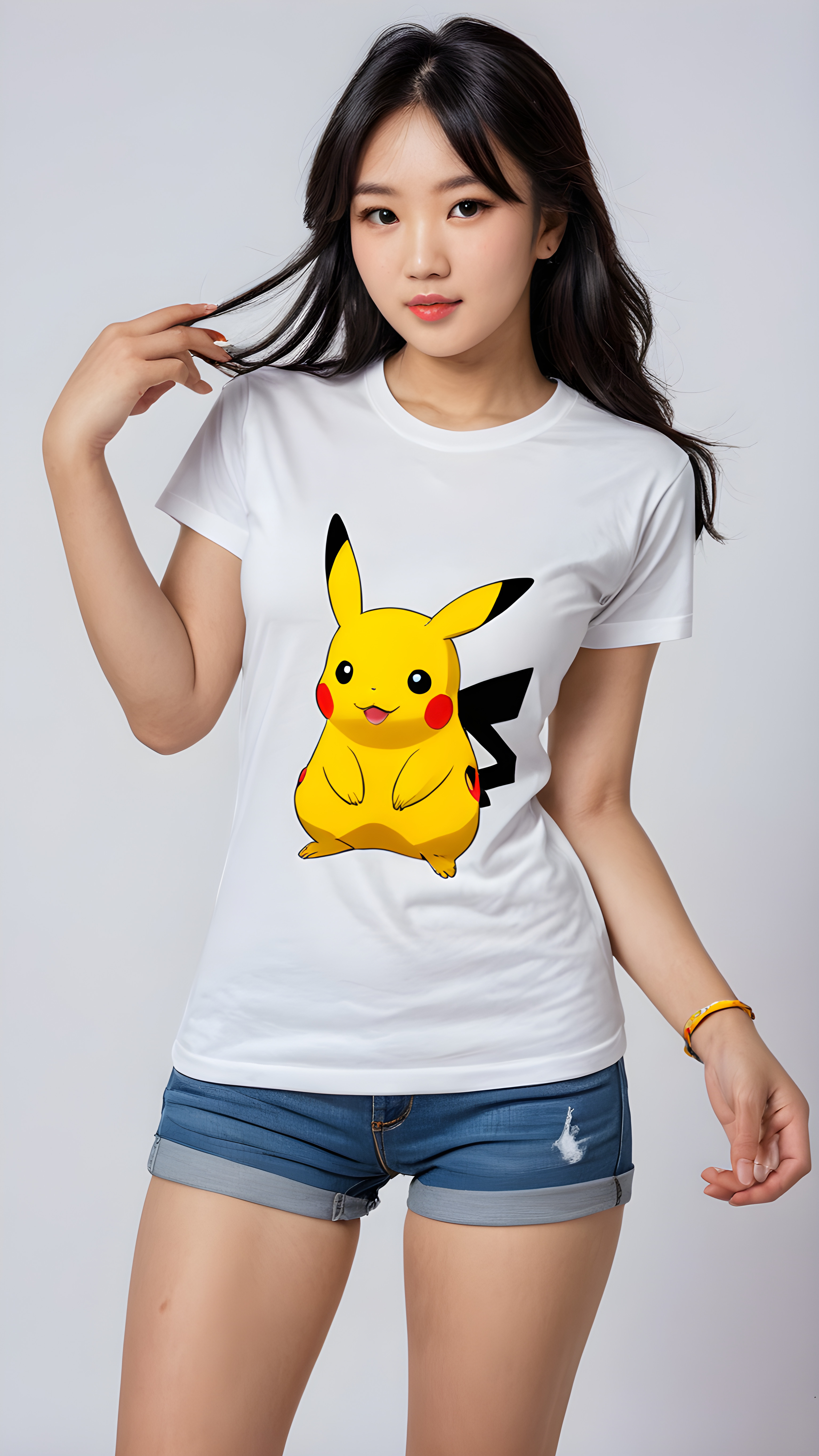 ((stunning)) ((gorgeous)) ((detailed, realistic portrait)) ((perfect curved body)) a young Asian teen girl with black hair ((wears a (((T-shirt with a Pikatchu))) on it)).