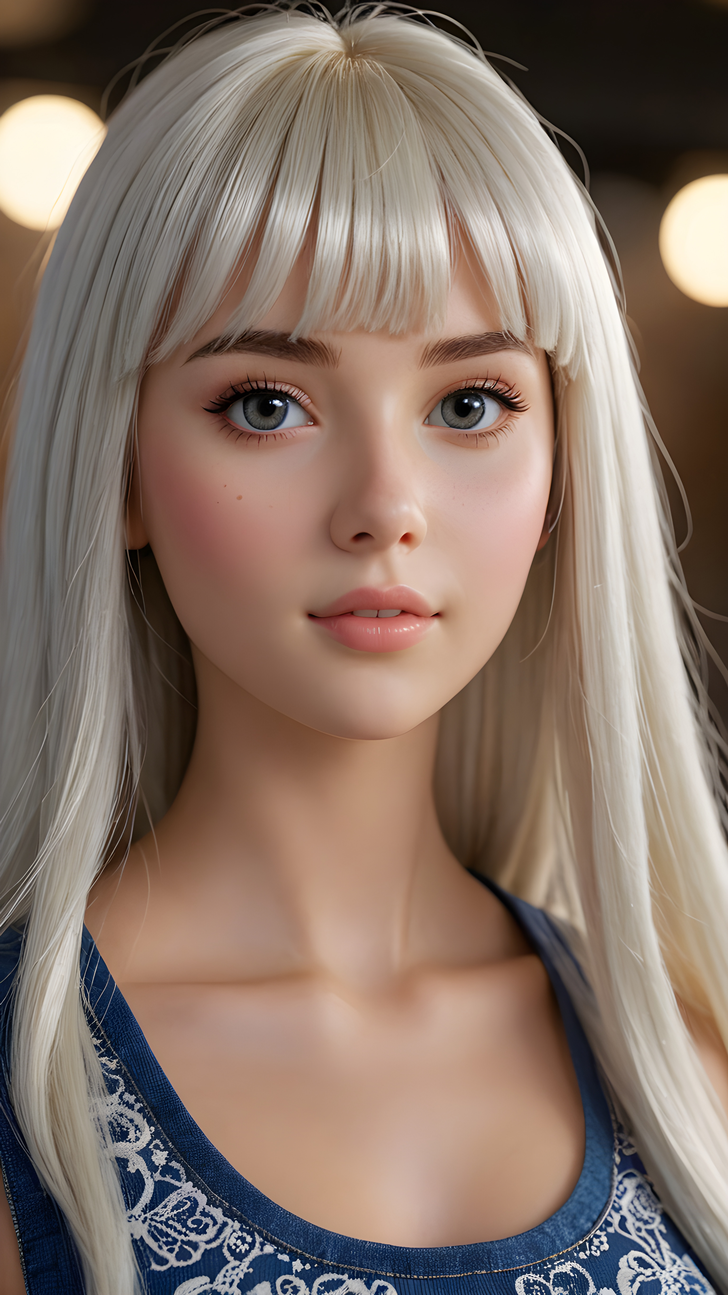 capture an (((ultra detailed, hyper realistic 4K dynamic photograph))), showcasing a (((teen doll girl))) with intricate, (((straight, platinum white bangs))), detailed eyes, and a joyful expression looking directly into the camera. Her hair flows softly around her face, framing a flawlessly curved silhouette, while (soft, warm) 4K cinematic lighting complements her vivid features. She wears a sleek, cropped top