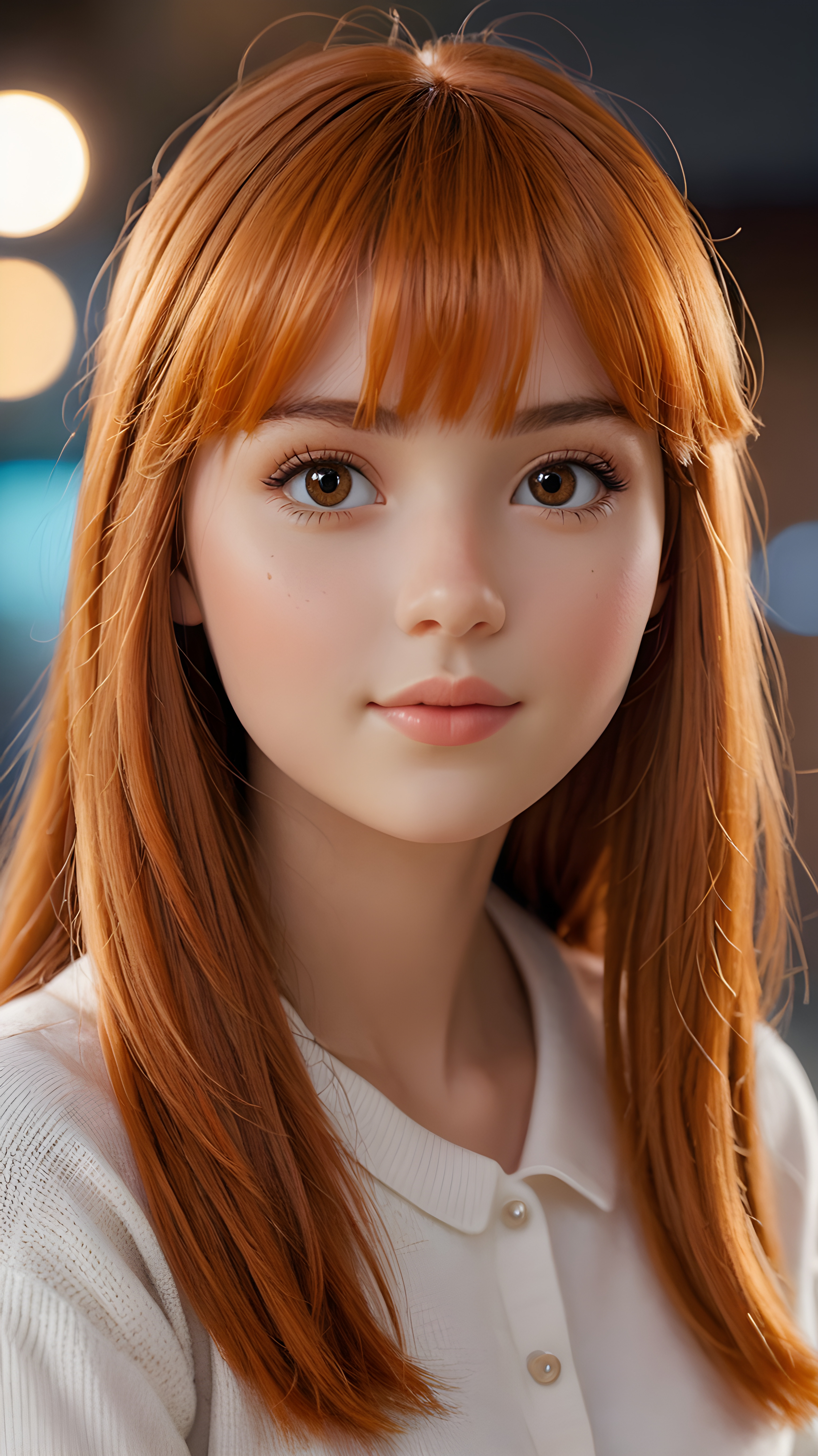 capture an (((ultra detailed, hyper realistic 4K dynamic photograph))), showcasing a (((very cute teen doll girl))) with intricate, (((straight, orange-hued bangs))), detailed eyes, and a joyful expression looking directly into the camera. Her hair flows softly around her face, framing a flawlessly curved silhouette, while (soft, warm) 8K cinematic lighting complements her vivid features. She wears a sleek, cropped top in a crisp, (side profile)
