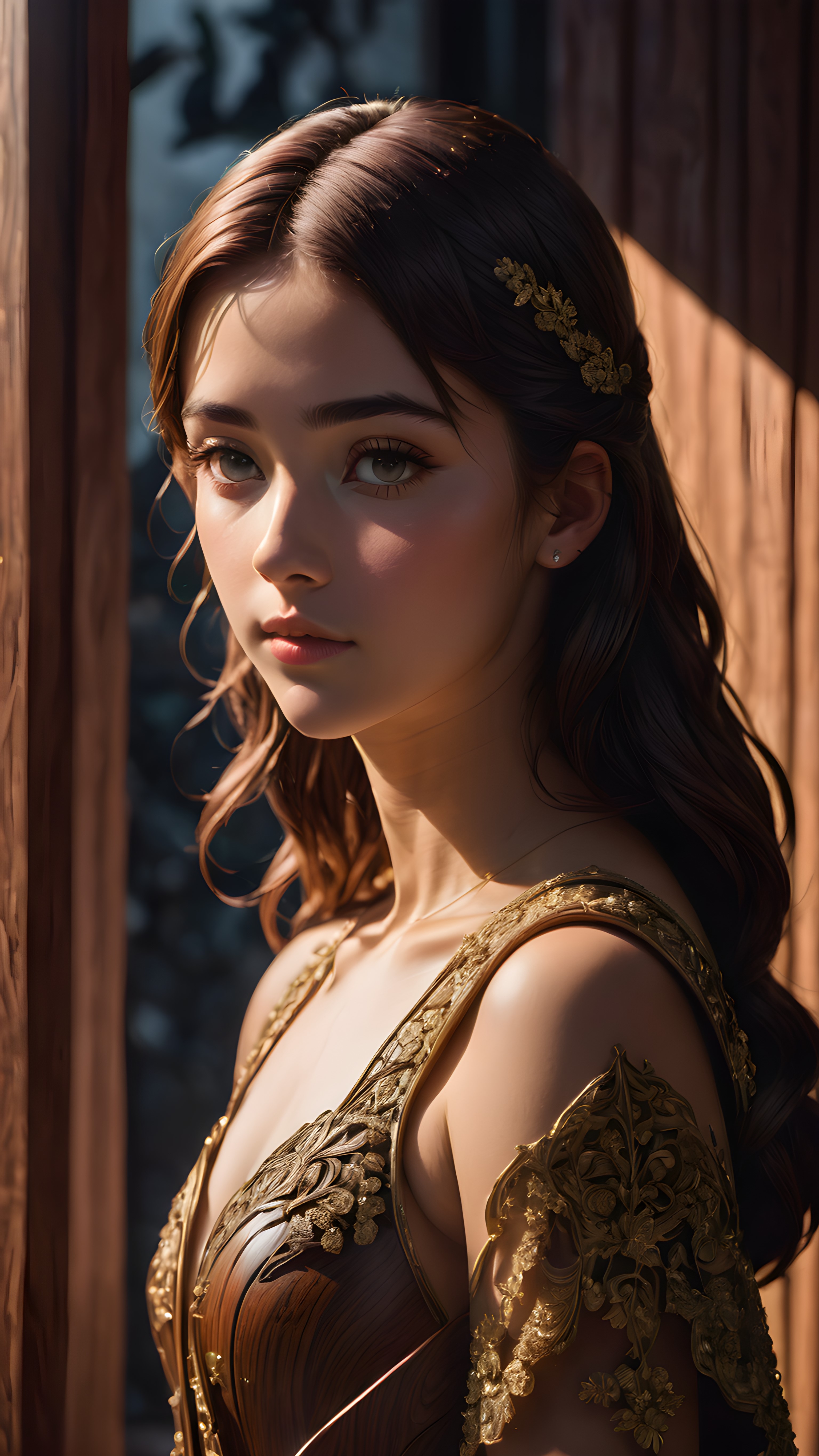 a figure carved from pure rosewood, teen girl ((detailed, realistic photo)), full body, light illuminates the figure and casts shadows