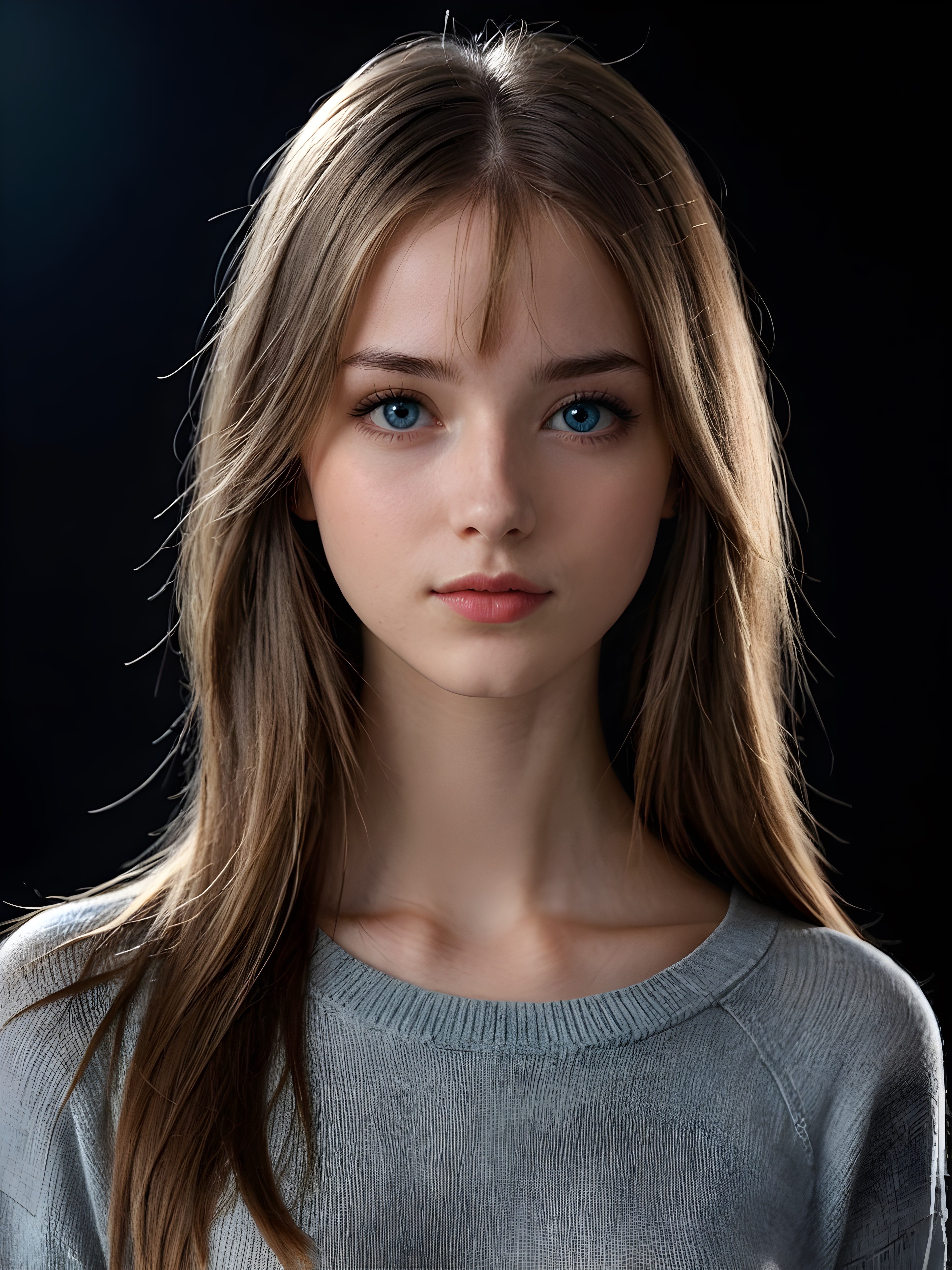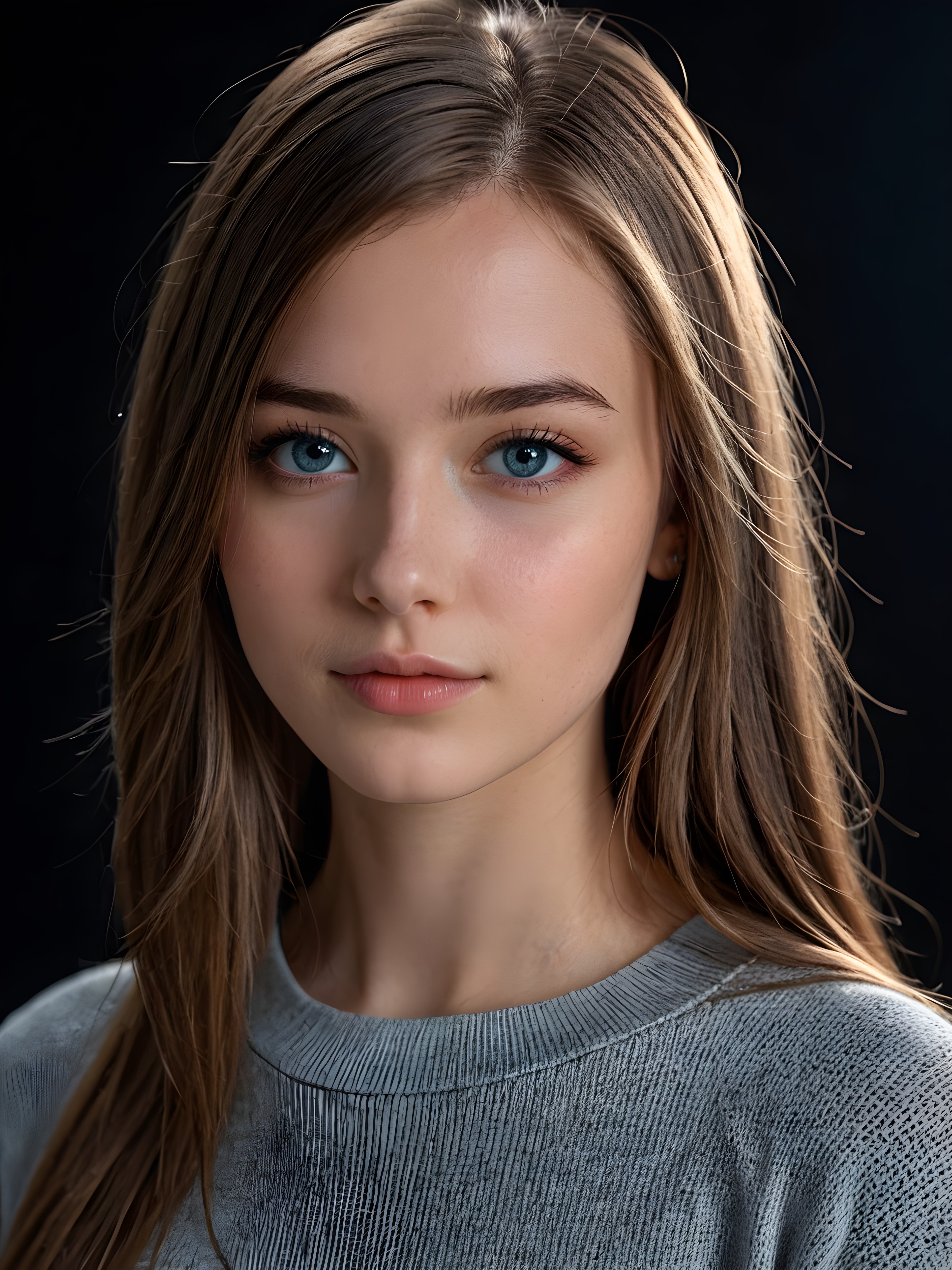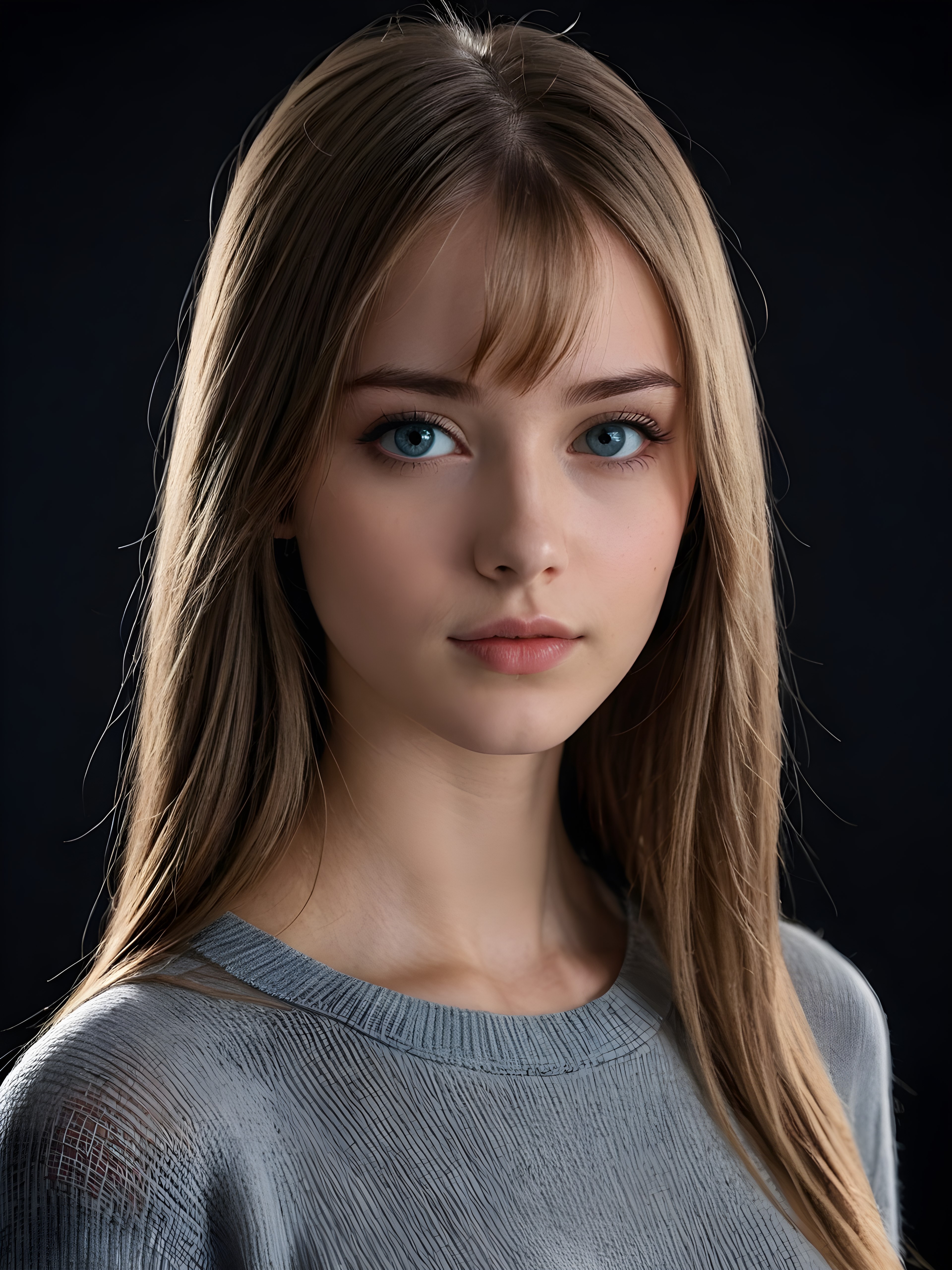 a young cute Emo teen girl, she has (((long straight hair))), and (realistic dark blue eyes), ((angelic round face)), perfect shadows, wearing a grey silk sweater, perfect curved body, she looks seductively at the viewer, weak light falls into the picture and creates a contrasting silhouette, upper body, flawless skin, black background, ((ultra realistic photo)) ((stunning)) ((gorgeous)) ((4k)) ((with a great neckline)) ((with a model pose))