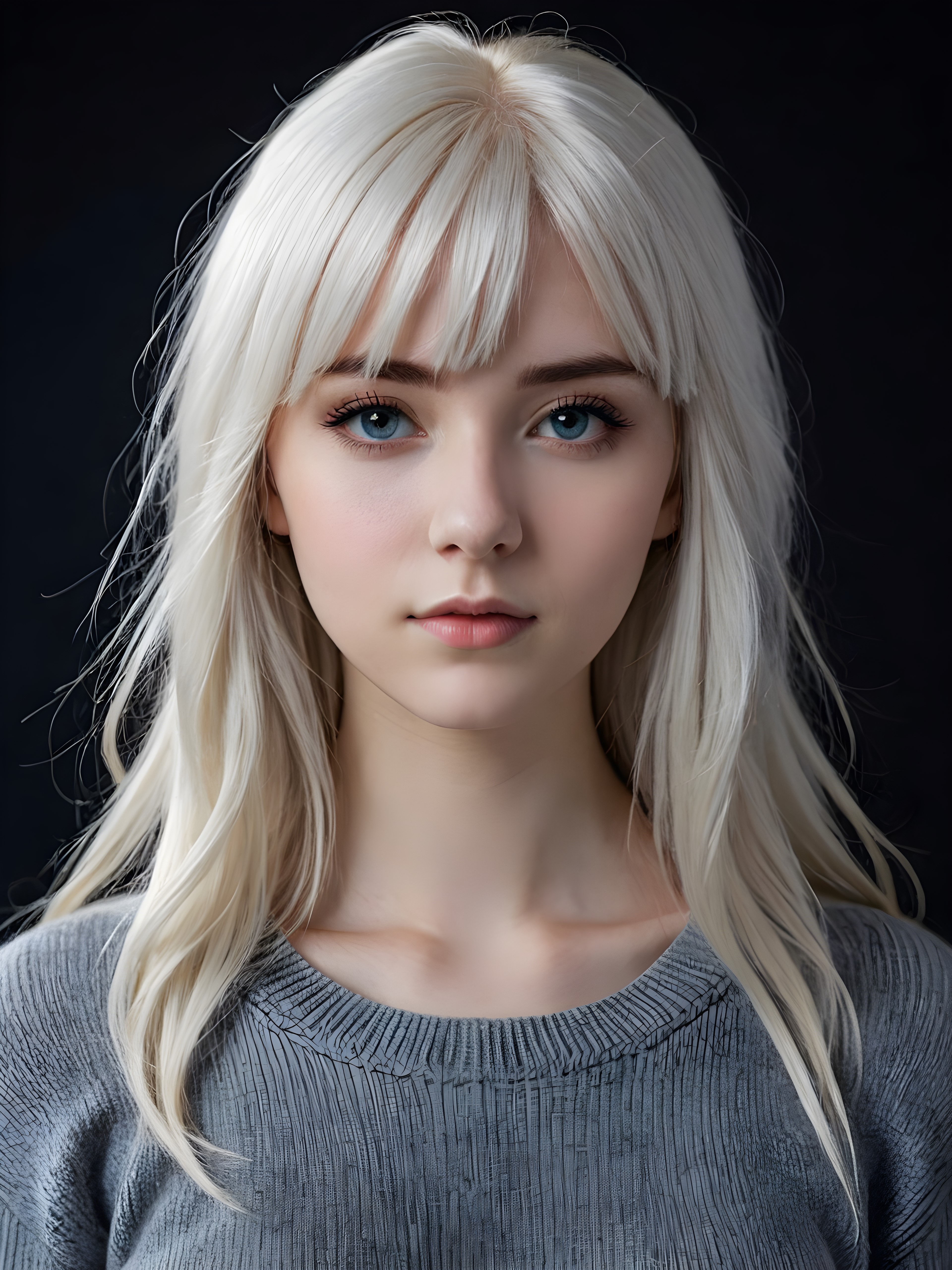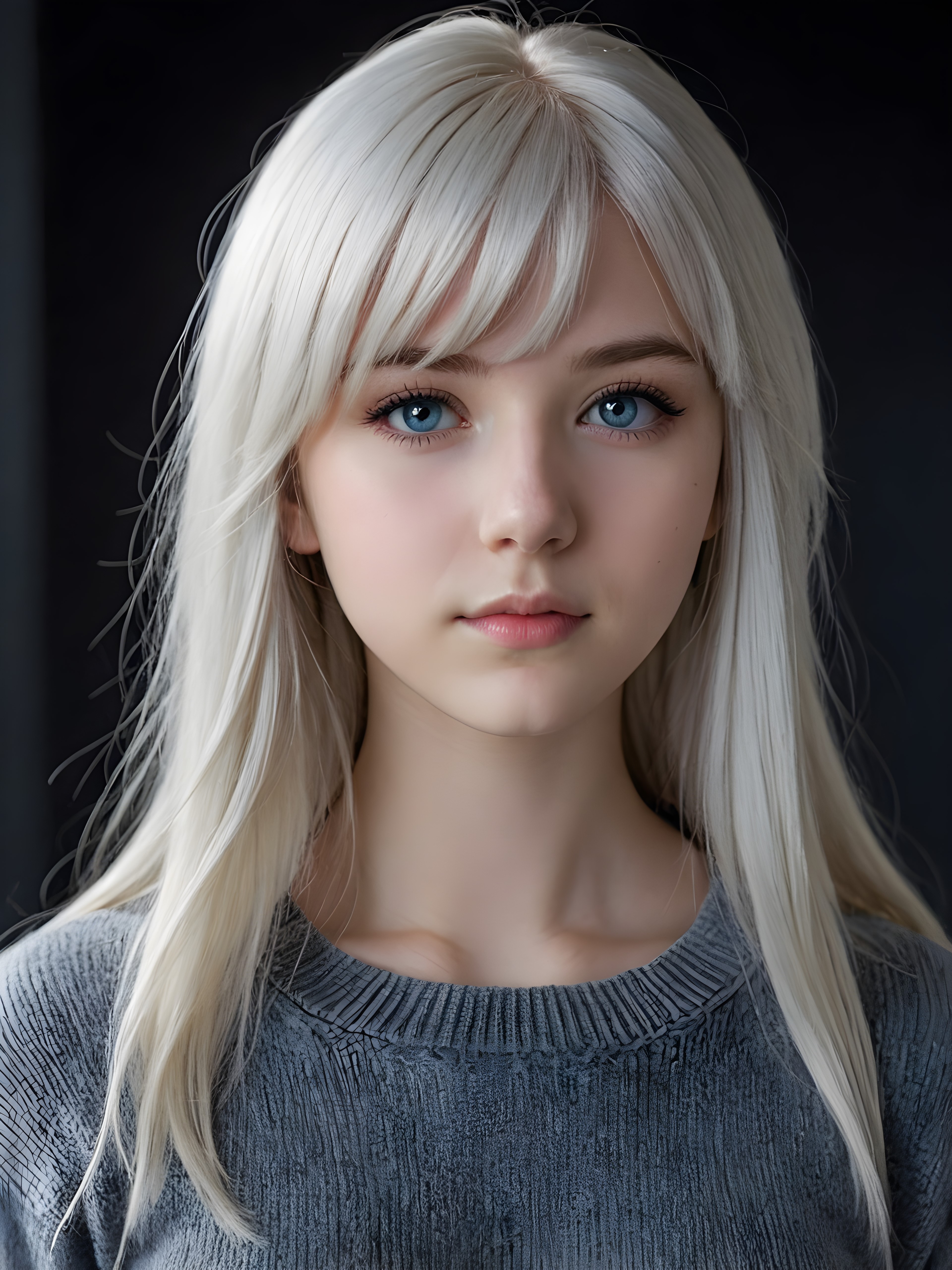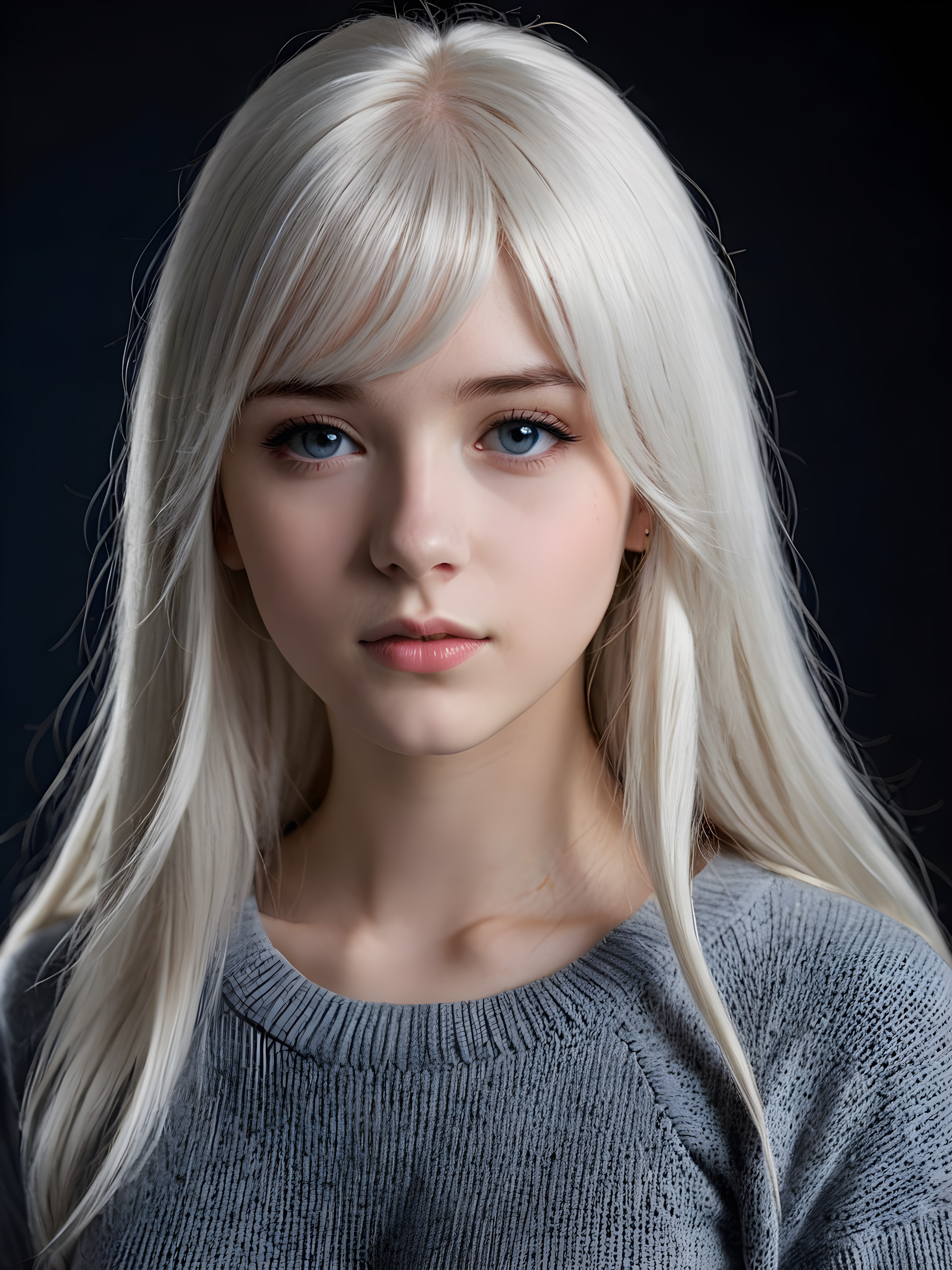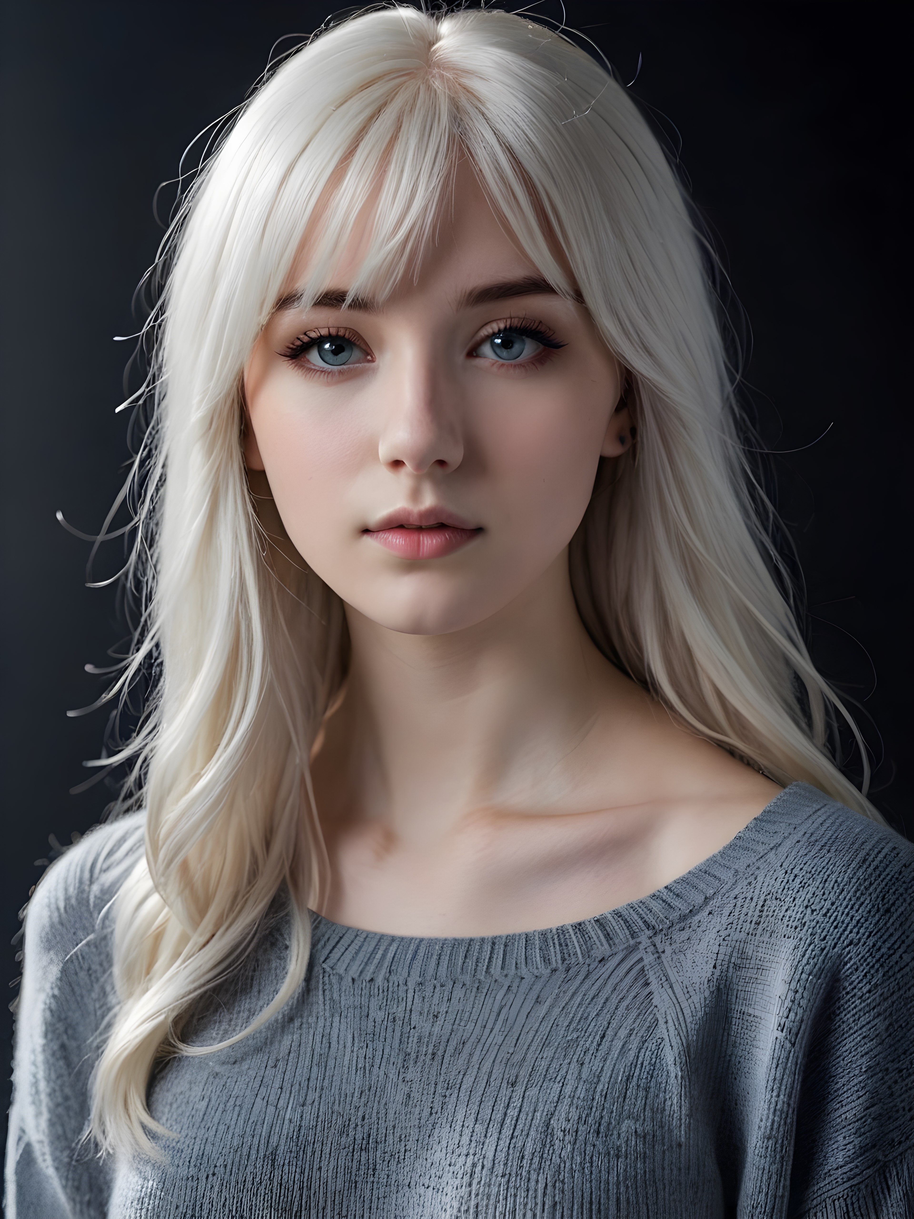 a young cute Emo teen girl, she has (((long platinum white colored hair, bangs cut))), and (realistic dark blue eyes), ((angelic round face)), perfect shadows, ((wearing a thin grey sweater)), she looks seductively at the viewer, weak light falls into the picture and creates a contrasting silhouette, upper body, flawless skin, dark background, ((ultra realistic photo)) ((stunning)) ((gorgeous)) ((4k))