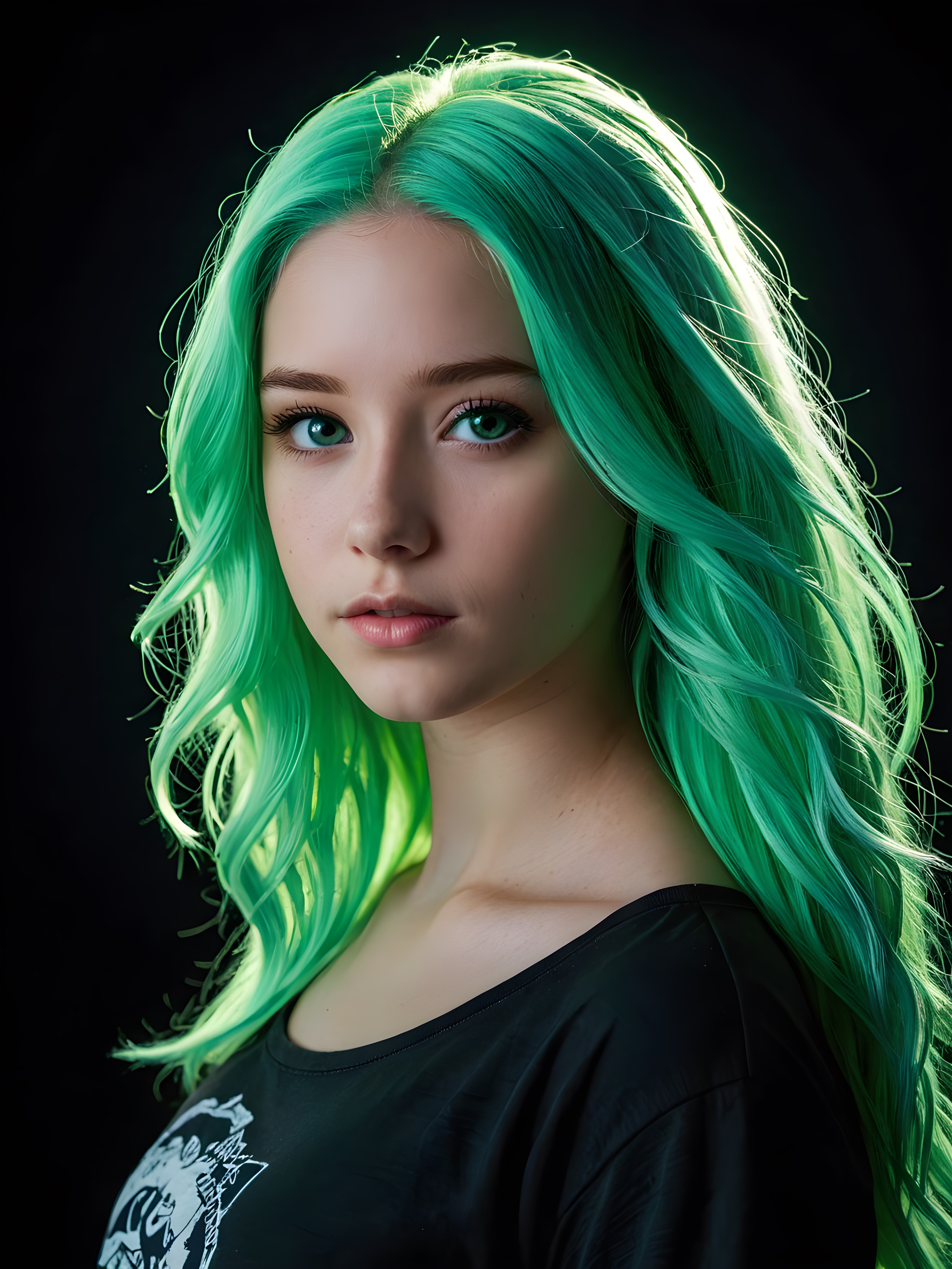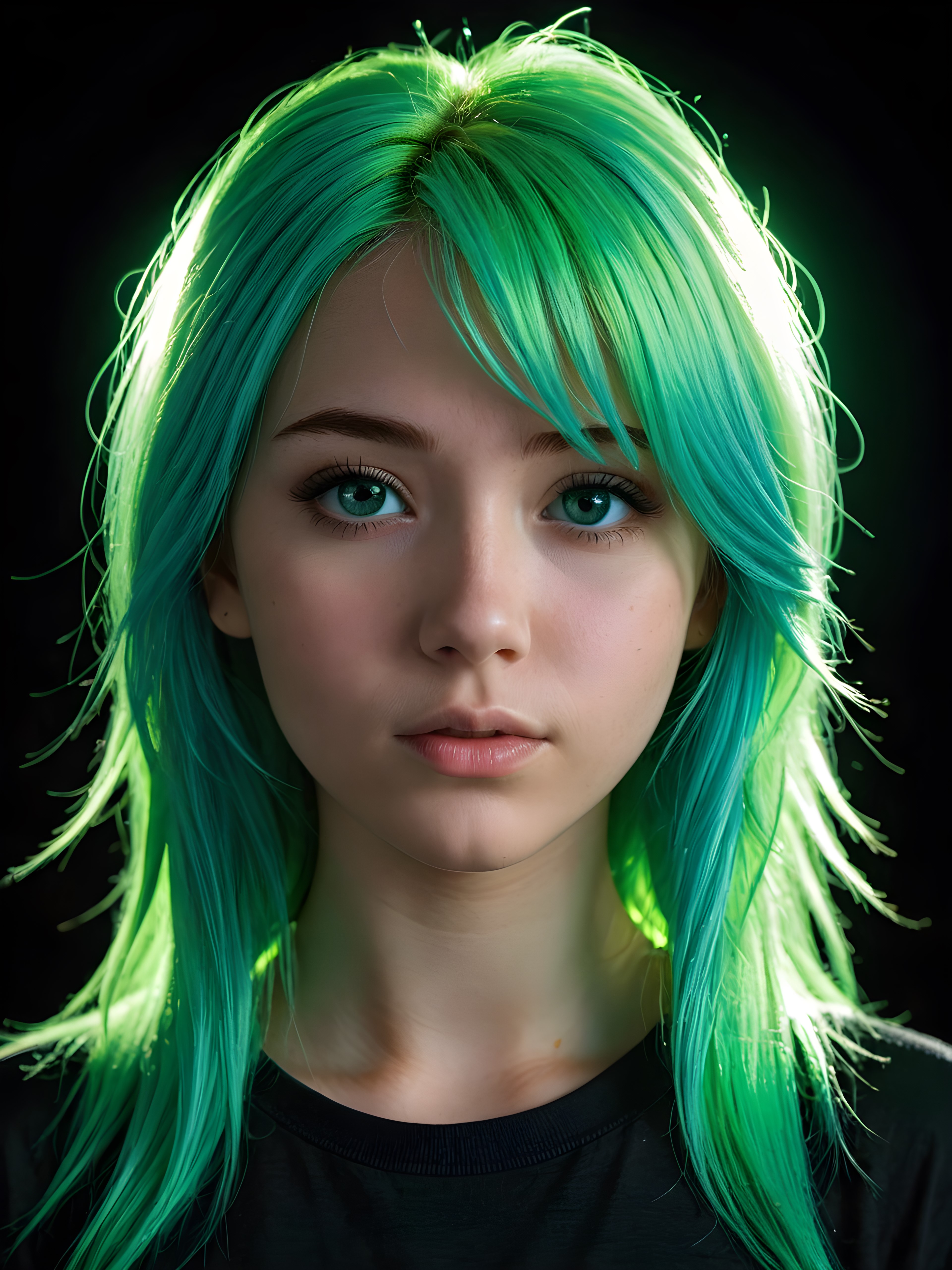 a young cute Emo teen girl, 13 years old, she has (((long neon light green hair))), and (realistic dark blue eyes), ((angelic round face)), perfect shadows, wearing a grey shirt, perfect curved body, she looks seductively at the viewer, weak light falls into the picture and creates a contrasting silhouette, upper body, flawless skin, black background, ((side profile)) ((ultra realistic photo)) ((stunning)) ((gorgeous)) ((4k))