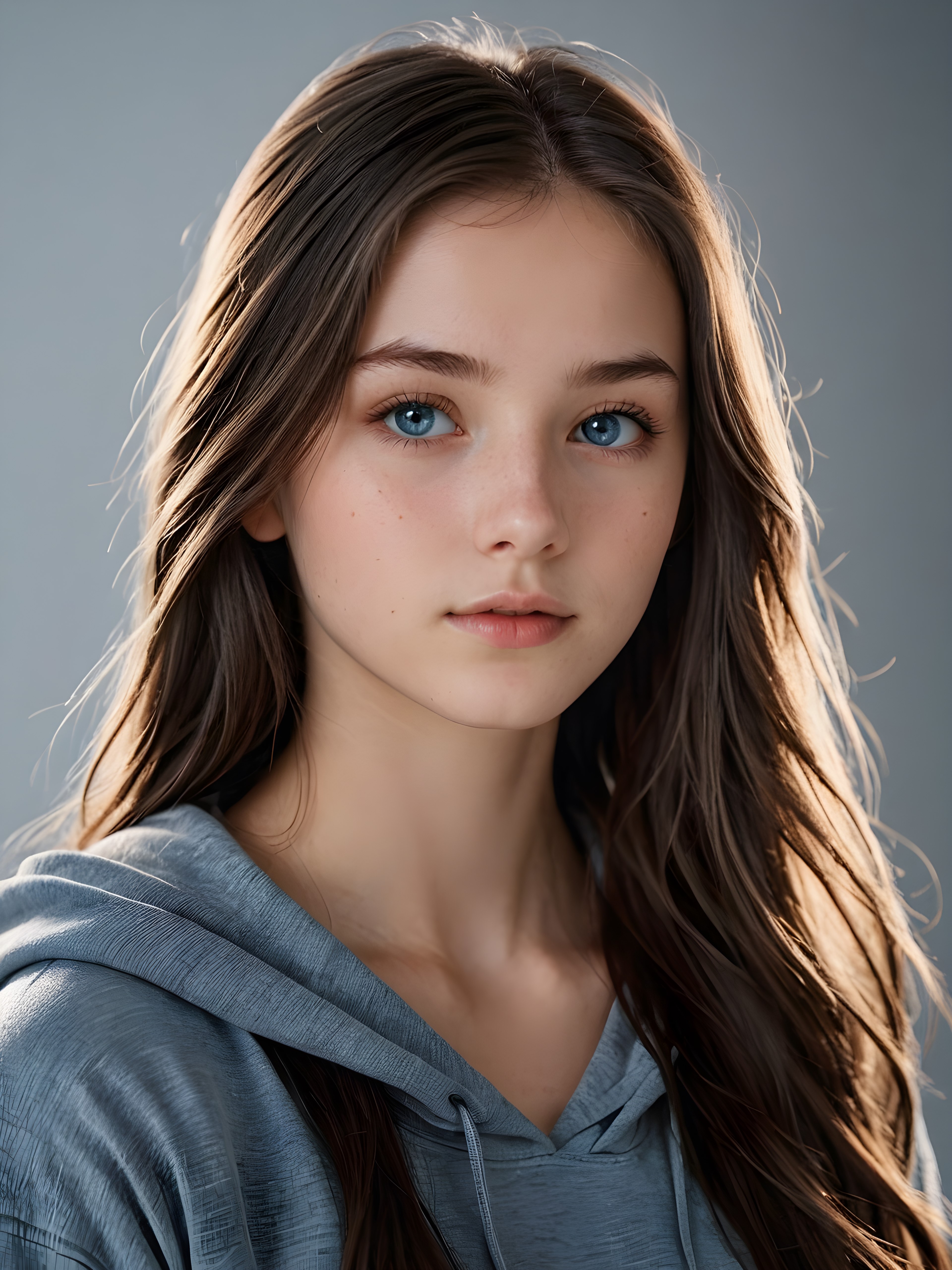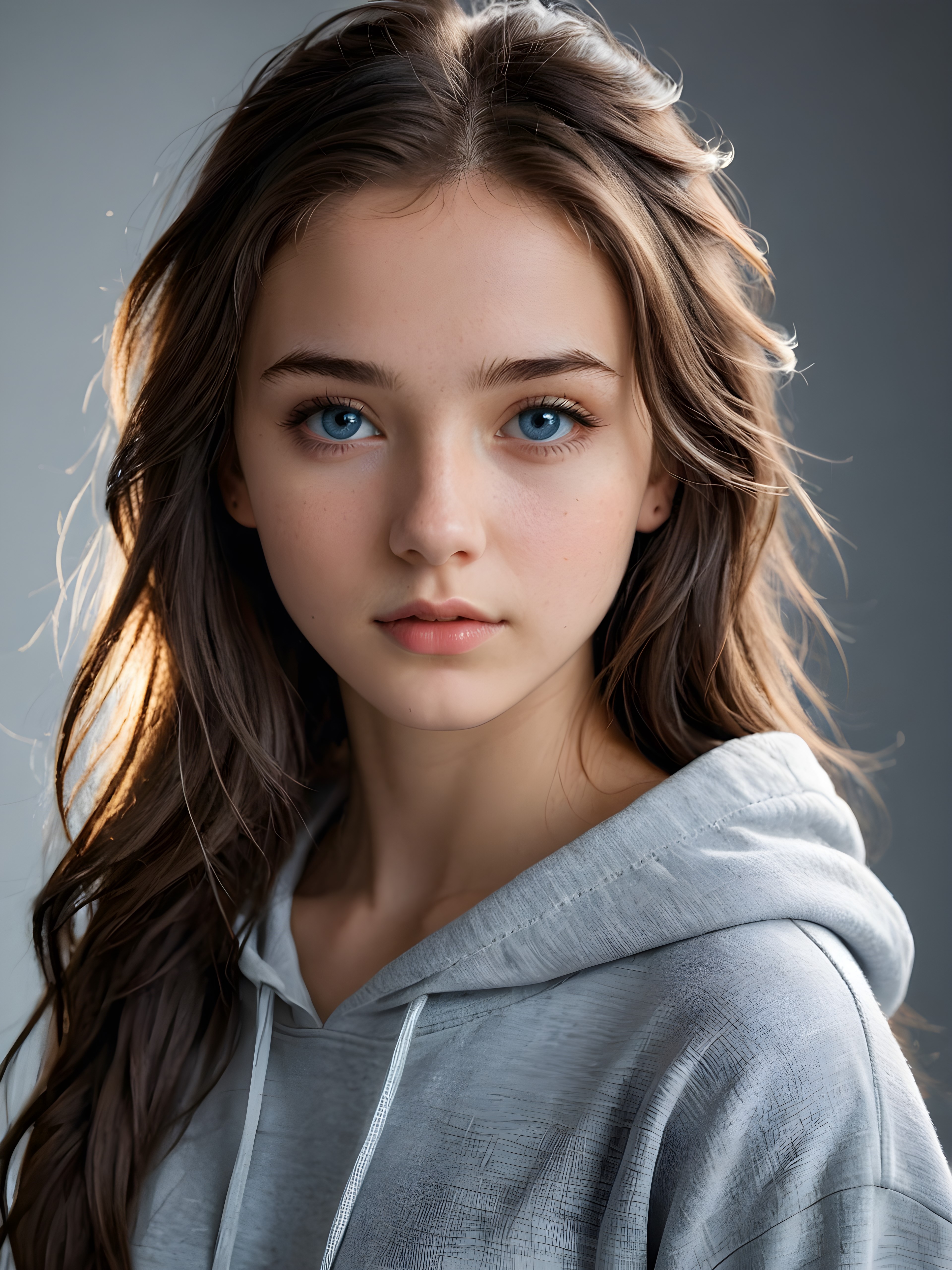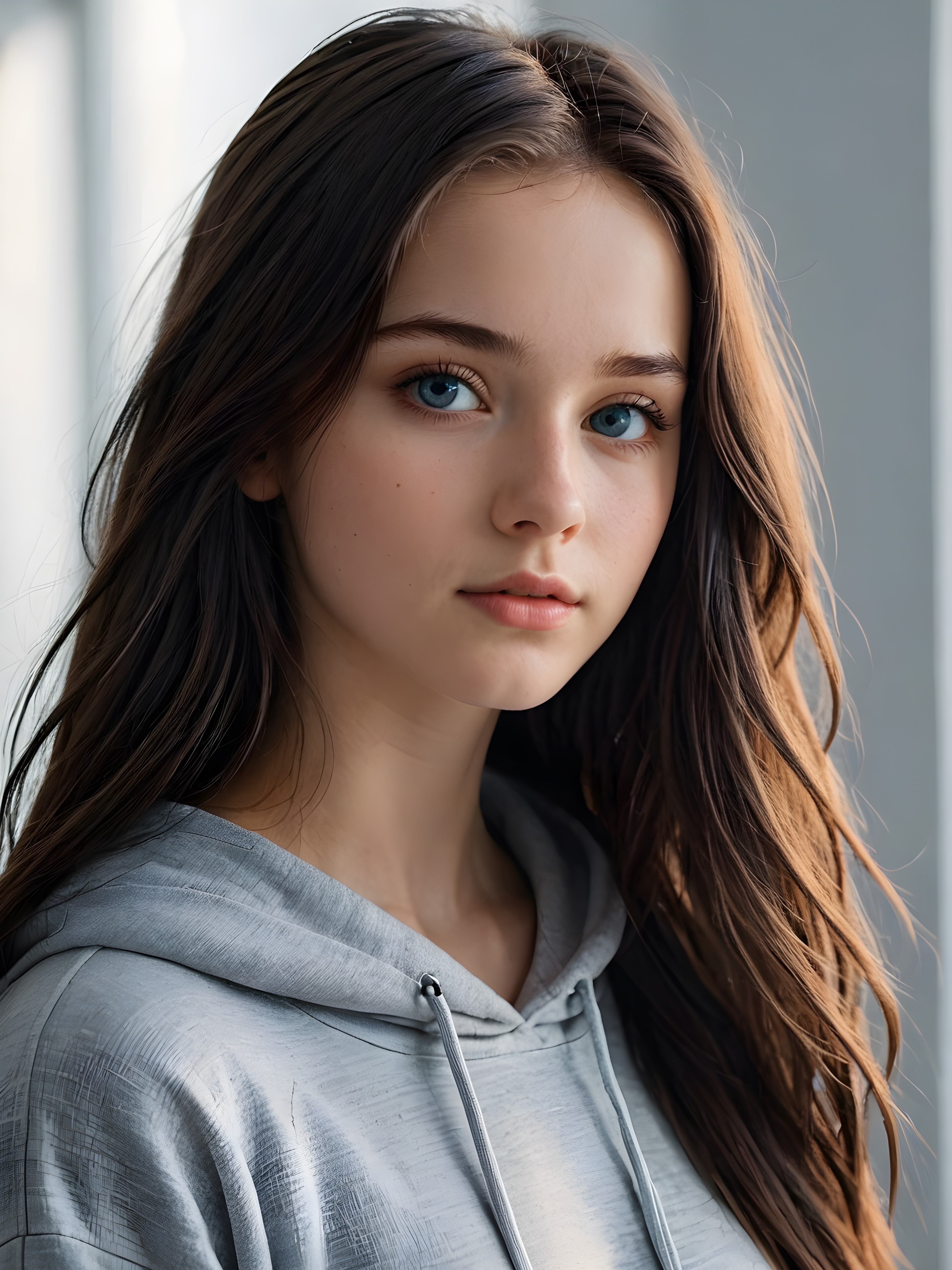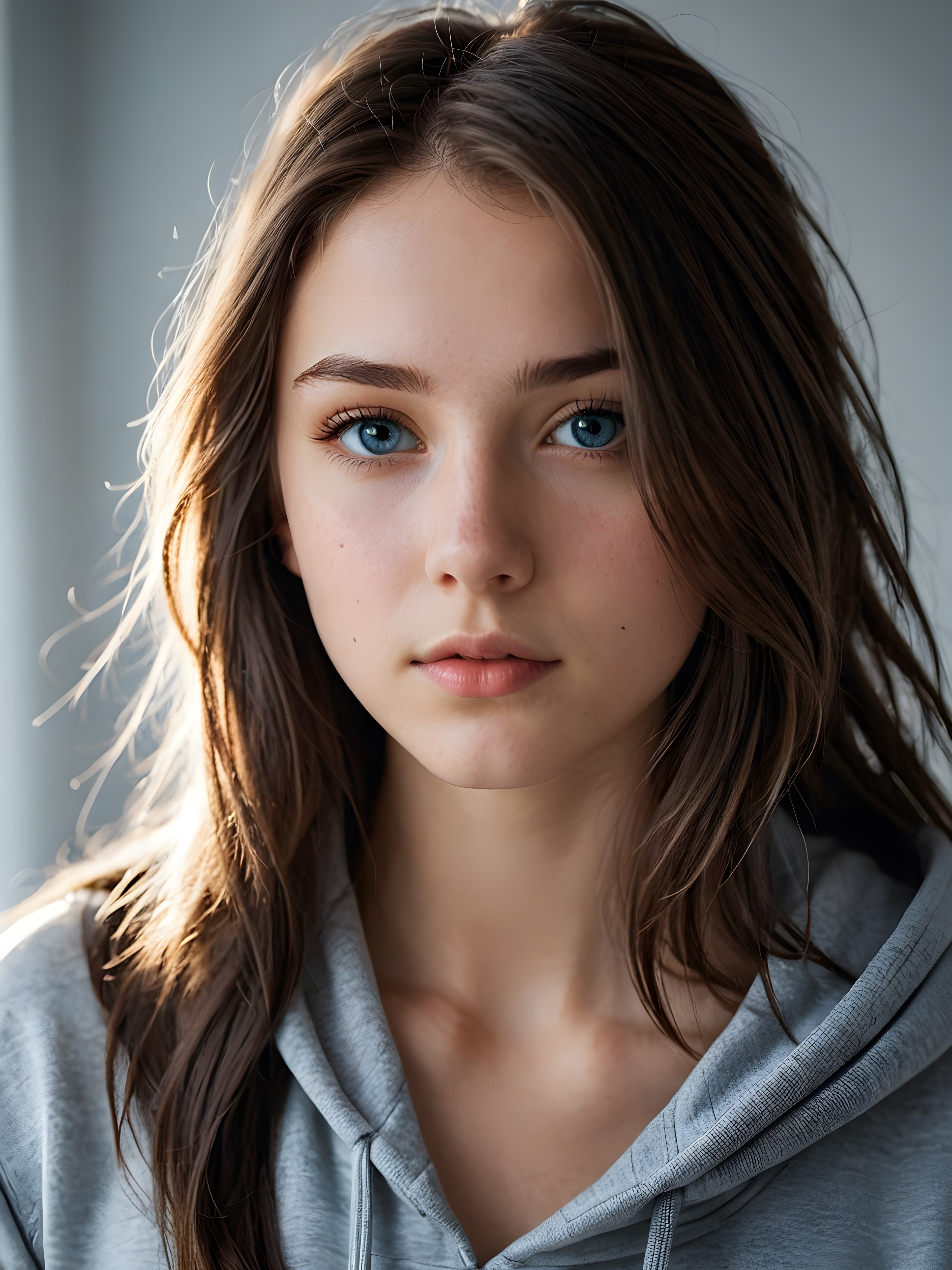 a young cute Emo teen girl, 15 years old, dimmed light falls on her, she has (((long hair))), and (realistic dark blue eyes), ((angelic round face)), in a dreamy, perfect shadows, wearing a grey hoodie, perfect curved body, she looks seductively at the viewer, upper body, flawless skin, light background, ((side profile)) ((ultra realistic photo)) ((stunning)) ((gorgeous)) ((4k))