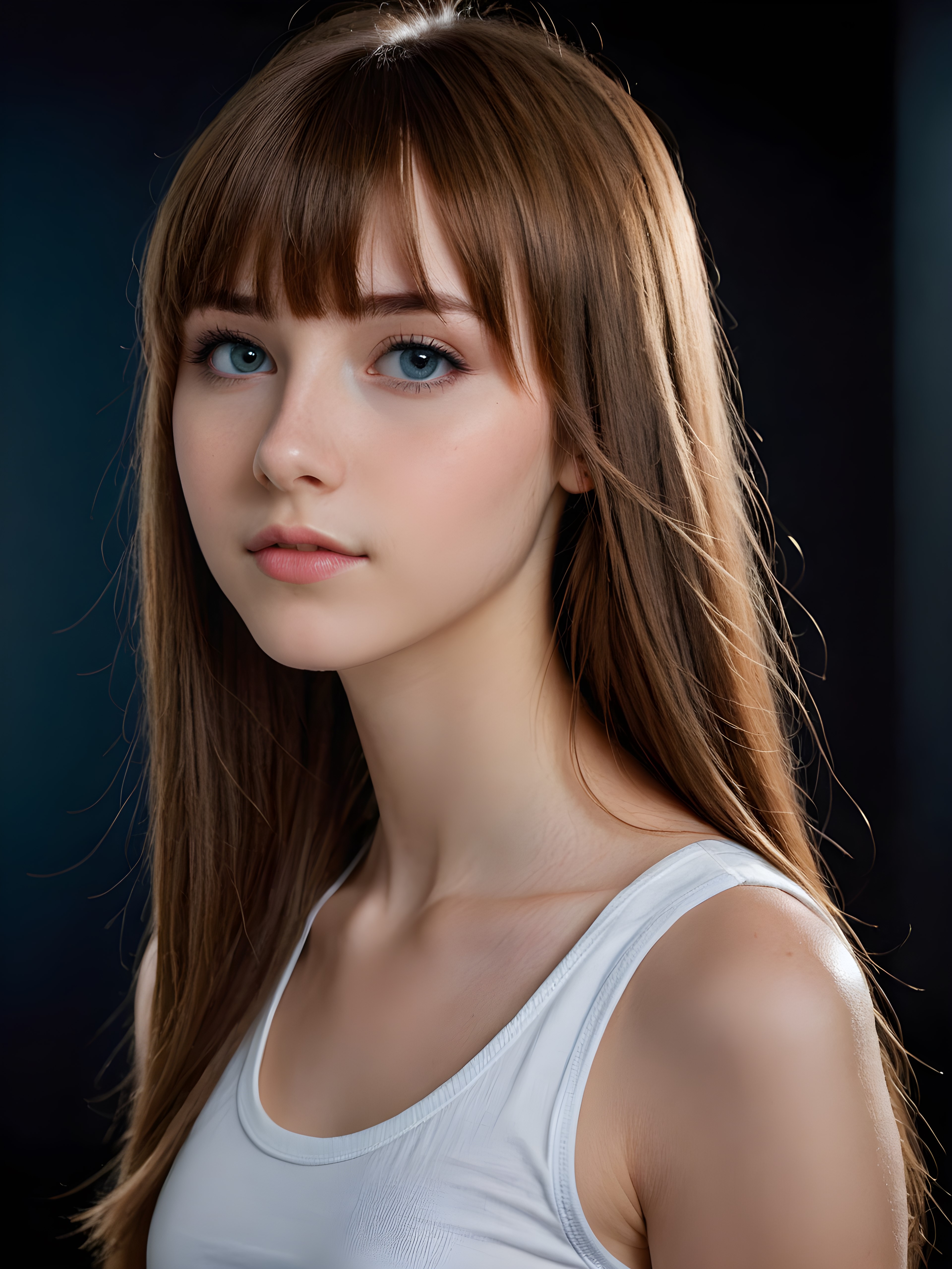 a young cute Emo teen girl, she has (((long straight hazelnut hair, bangs cut))), and (realistic dark blue eyes), ((angelic round face)), perfect shadows, ((wearing a thin white tank top)), she looks seductively at the viewer, weak light falls into the picture and creates a contrasting silhouette, upper body, flawless skin, dark mystic background, ((ultra realistic photo)) ((stunning)) ((gorgeous)) ((4k))