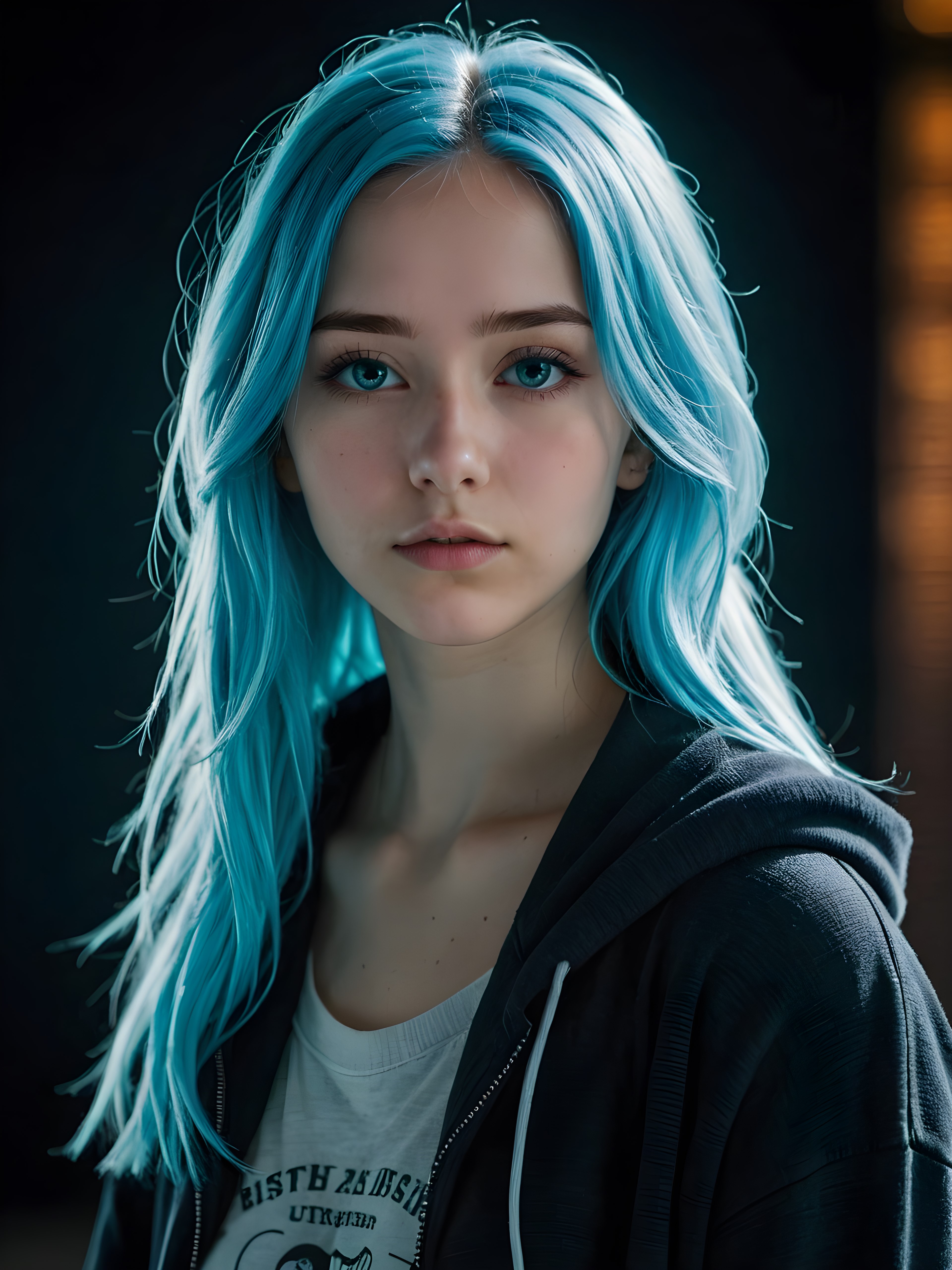 a young cute Emo teen girl, 15 years old, she has long (((neon light blue hair))), and (realistic dark blue eyes), ((angelic round face)), in a dreamy, perfect shadows, wearing a grey hoodie, perfect curved body, she looks seductively at the viewer, weak light falls into the picture and creates a contrasting silhouette, upper body, flawless skin, dark background, ((side profile)) ((ultra realistic photo)) ((stunning)) ((gorgeous)) ((4k))