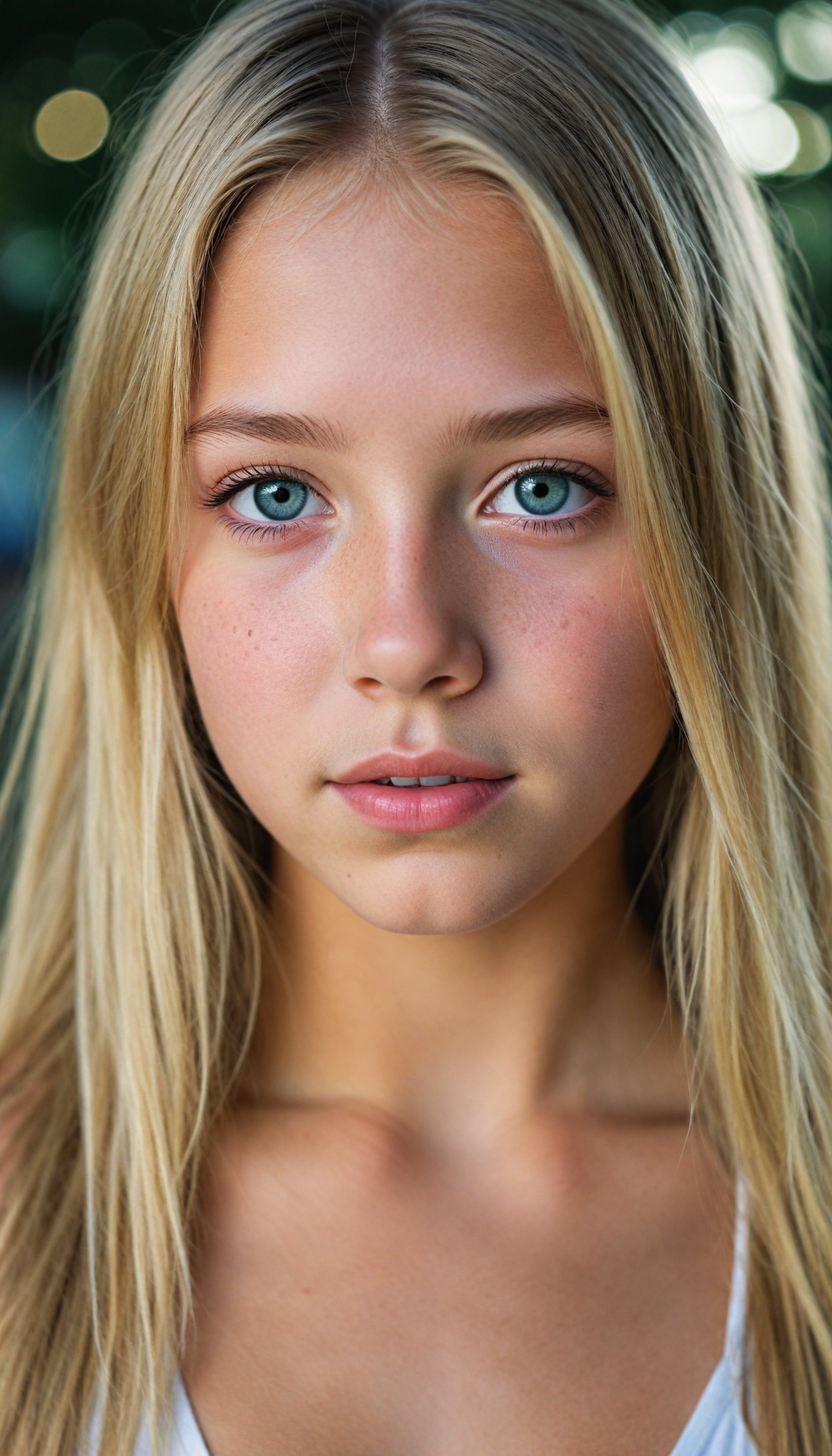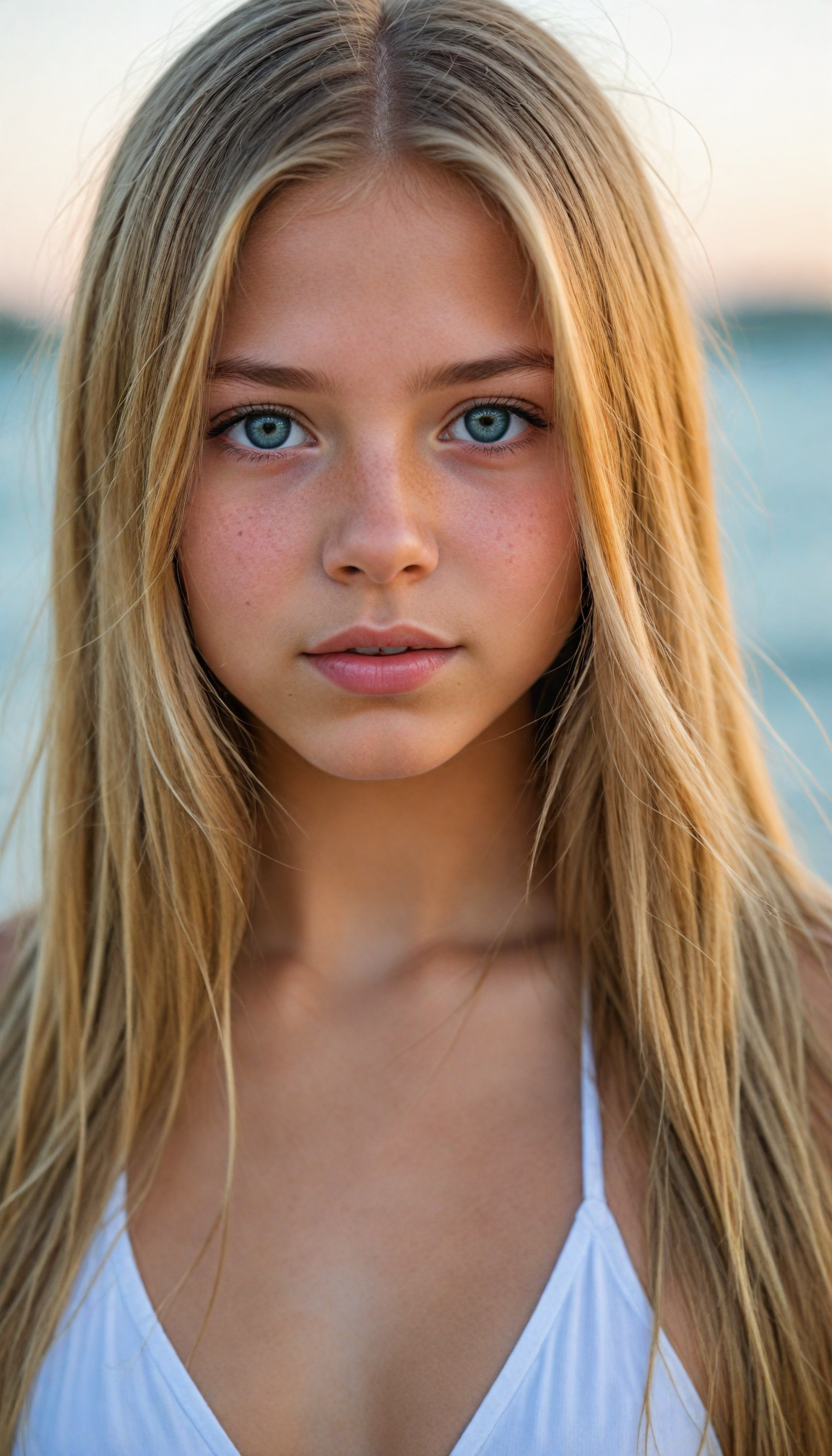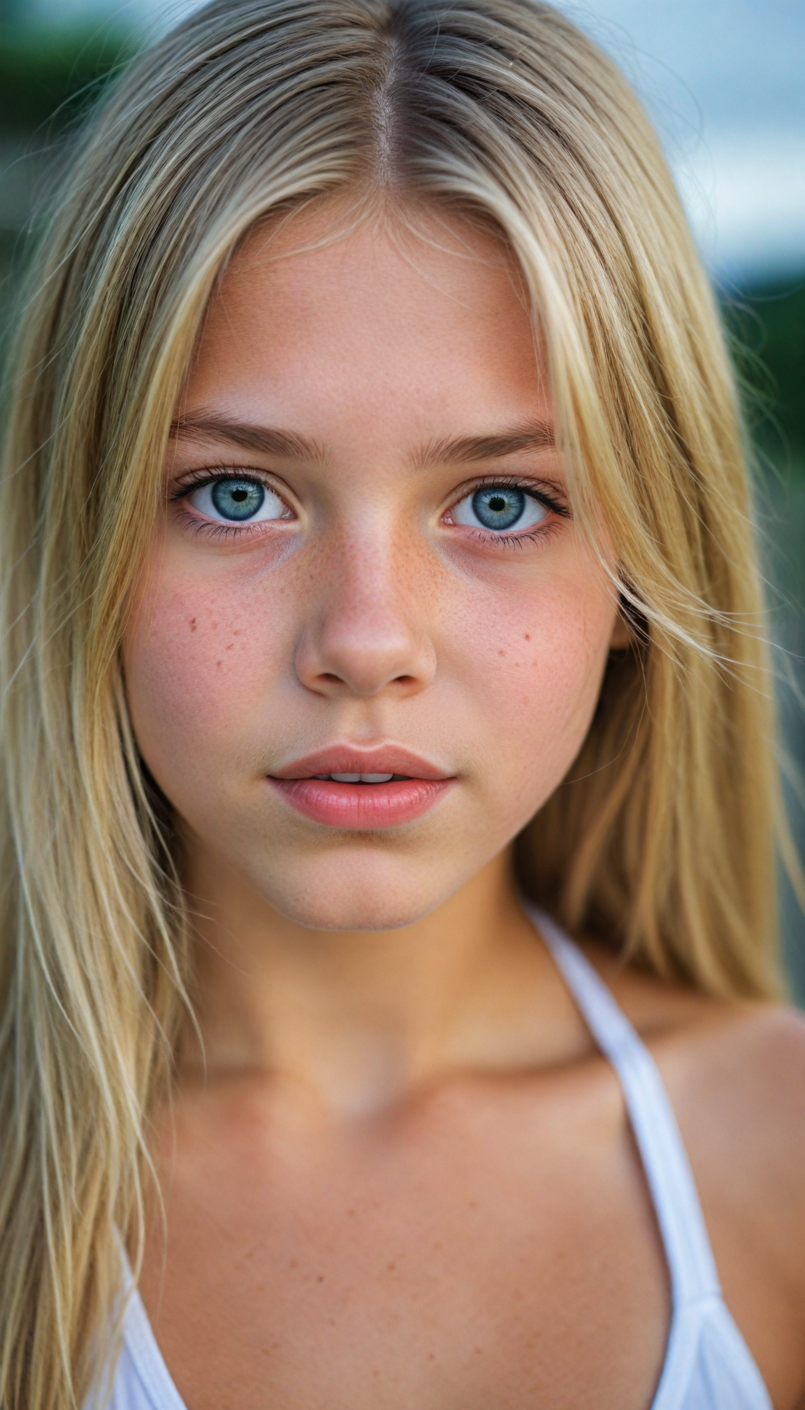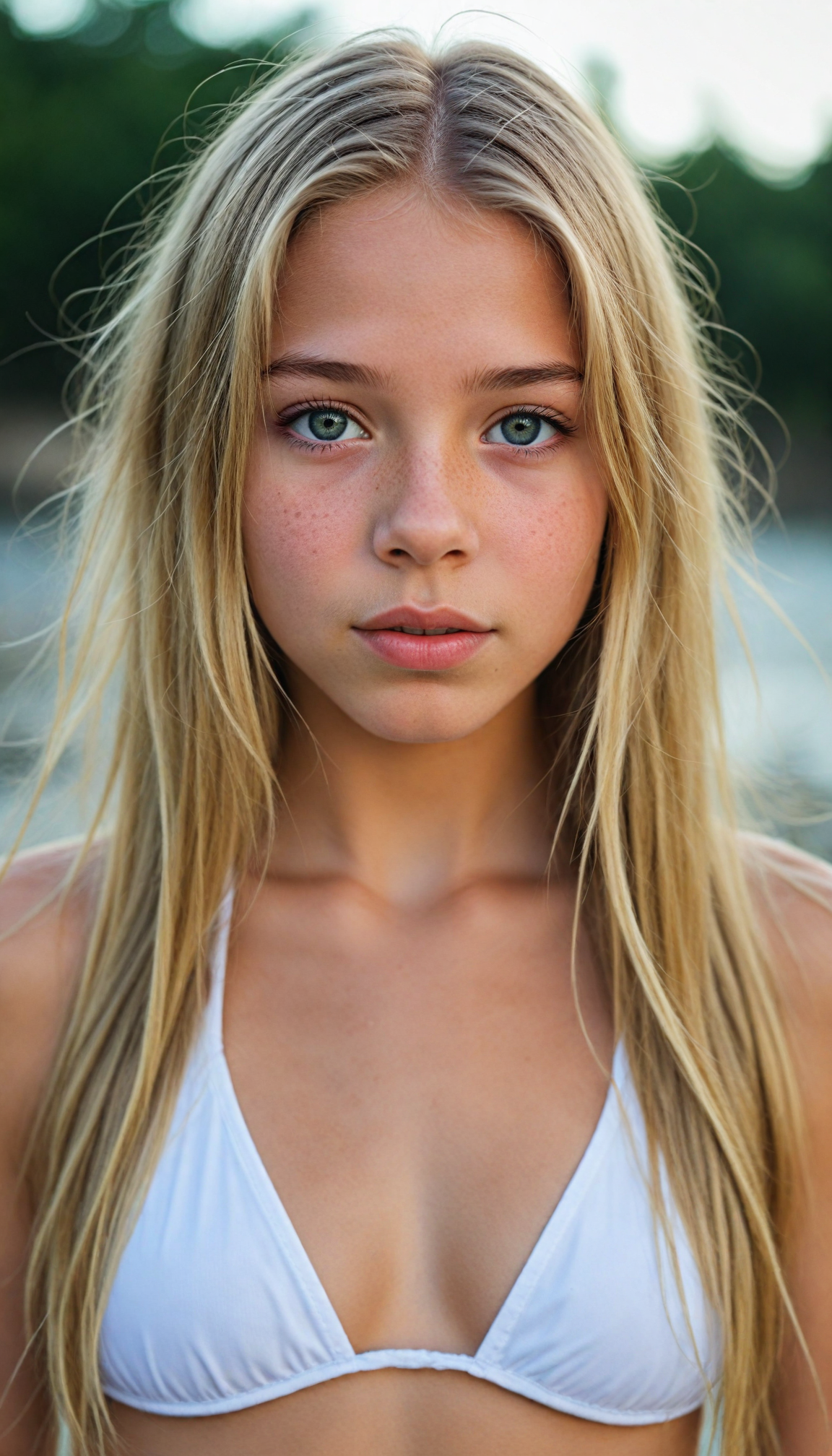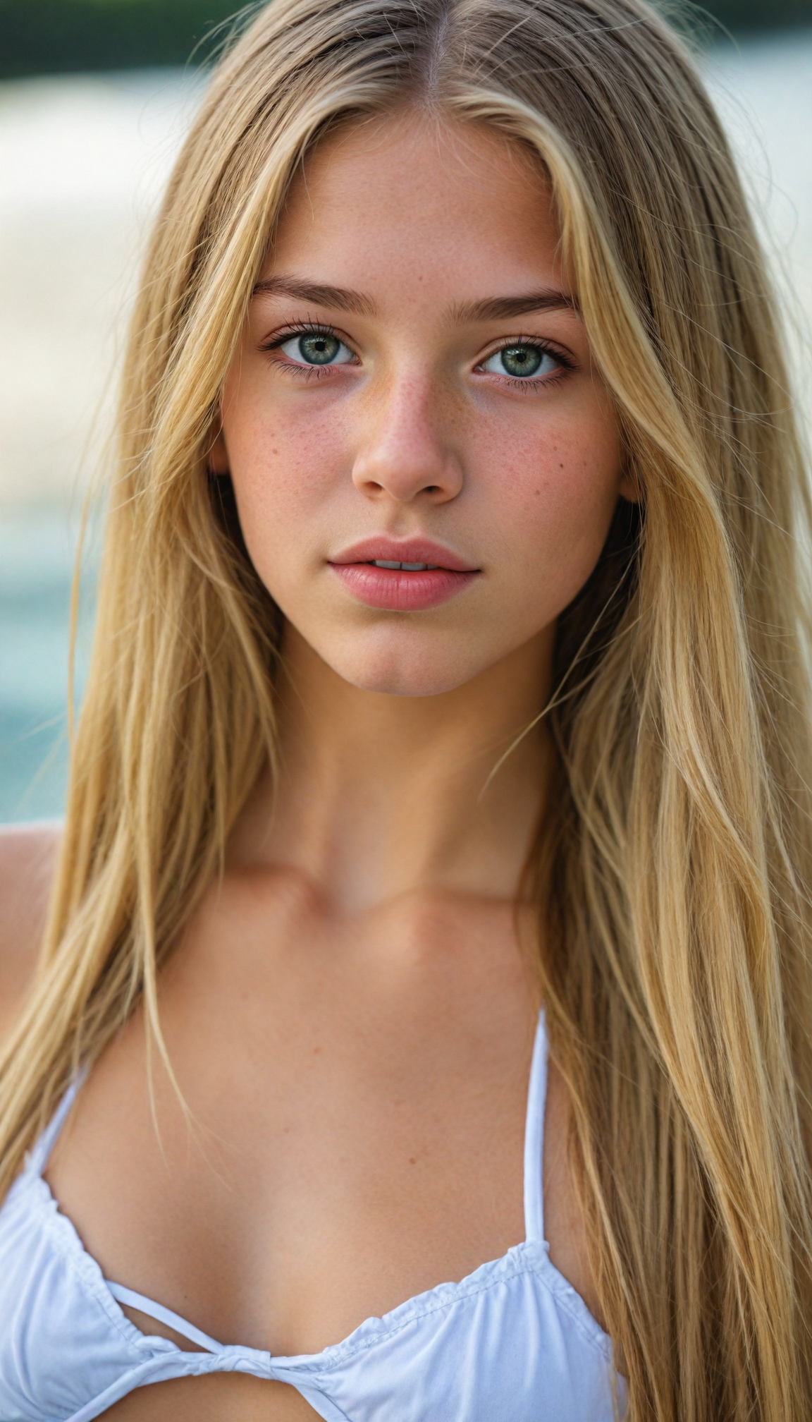 a upper-body portrait from a cute young girl with long, straight blonde hair, super detailed face, detailed eyes, full lips, white bikini