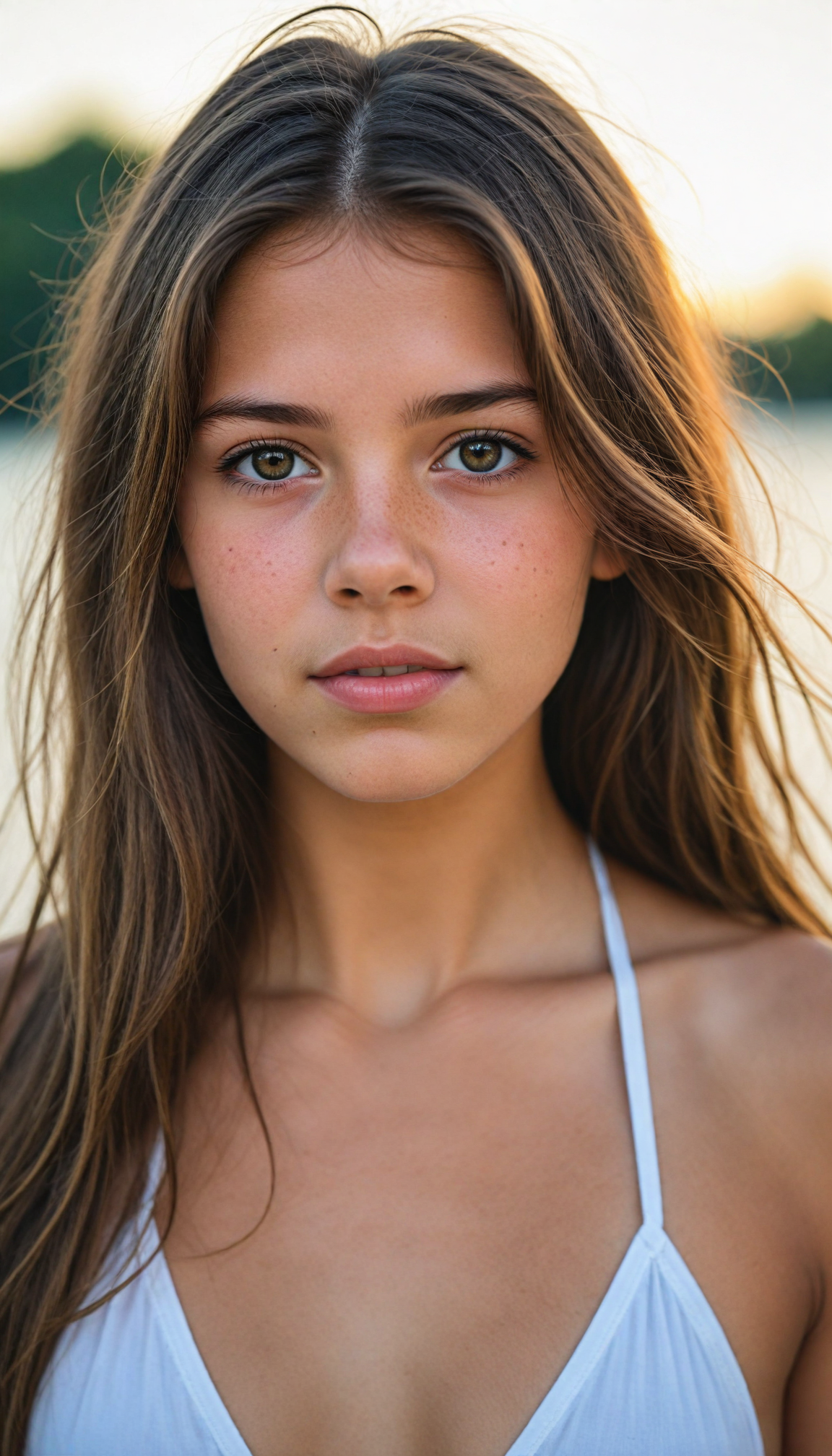 a upper-body portrait from a cute young girl with long, straight brown hair, super detailed face, detailed eyes, full lips, white bikini