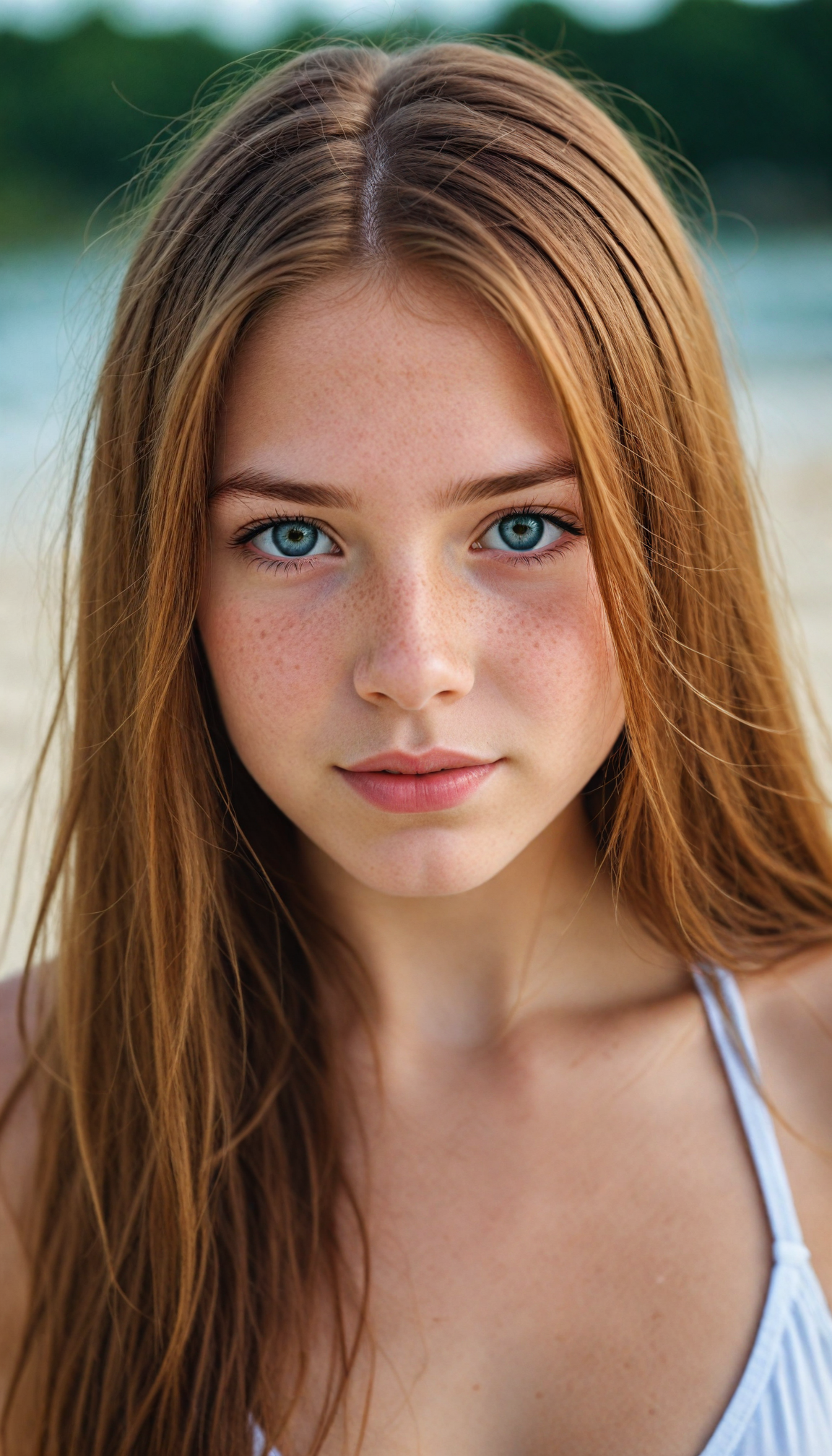 a upper-body portrait from a cute young girl with long, straight auburn hair, super detailed face, detailed eyes, full lips, white bikini