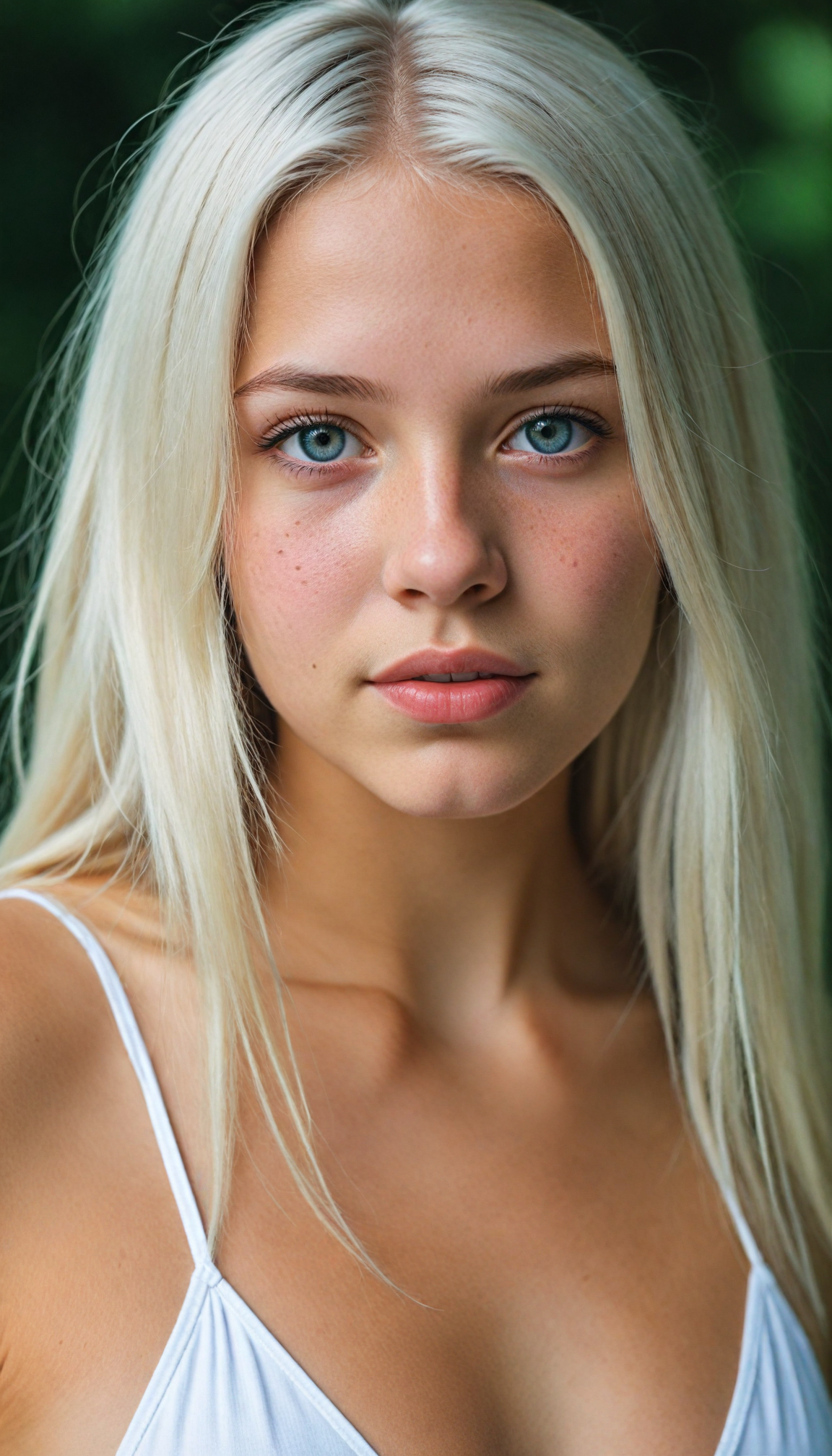a upper-body portrait from a cute young girl with long, straight platinum hair, super detailed face, detailed eyes, full lips, white bikini