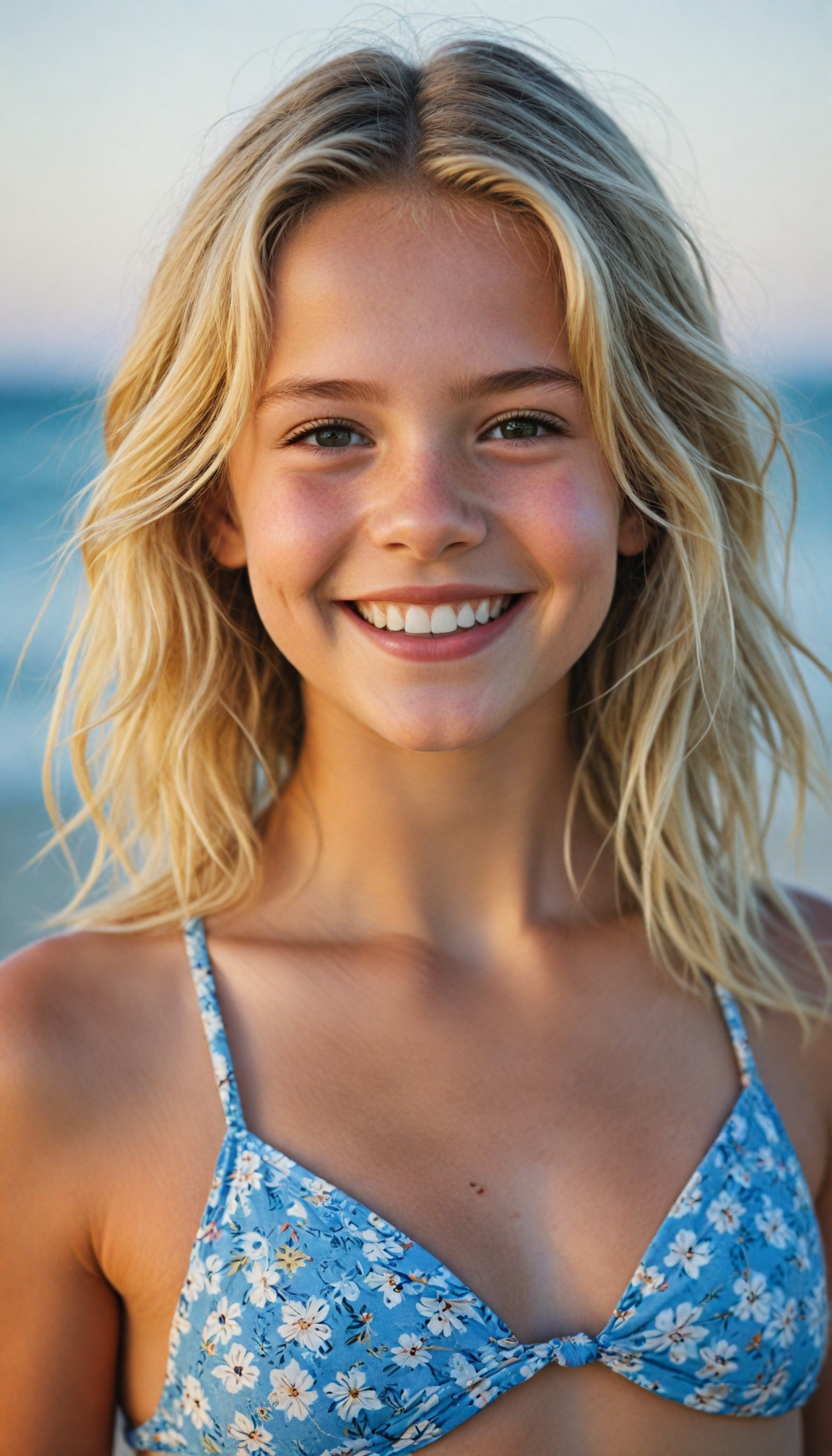 a young girl in a bikini, smile, beach in the backdrop, long straight (summer blond) wavy hair