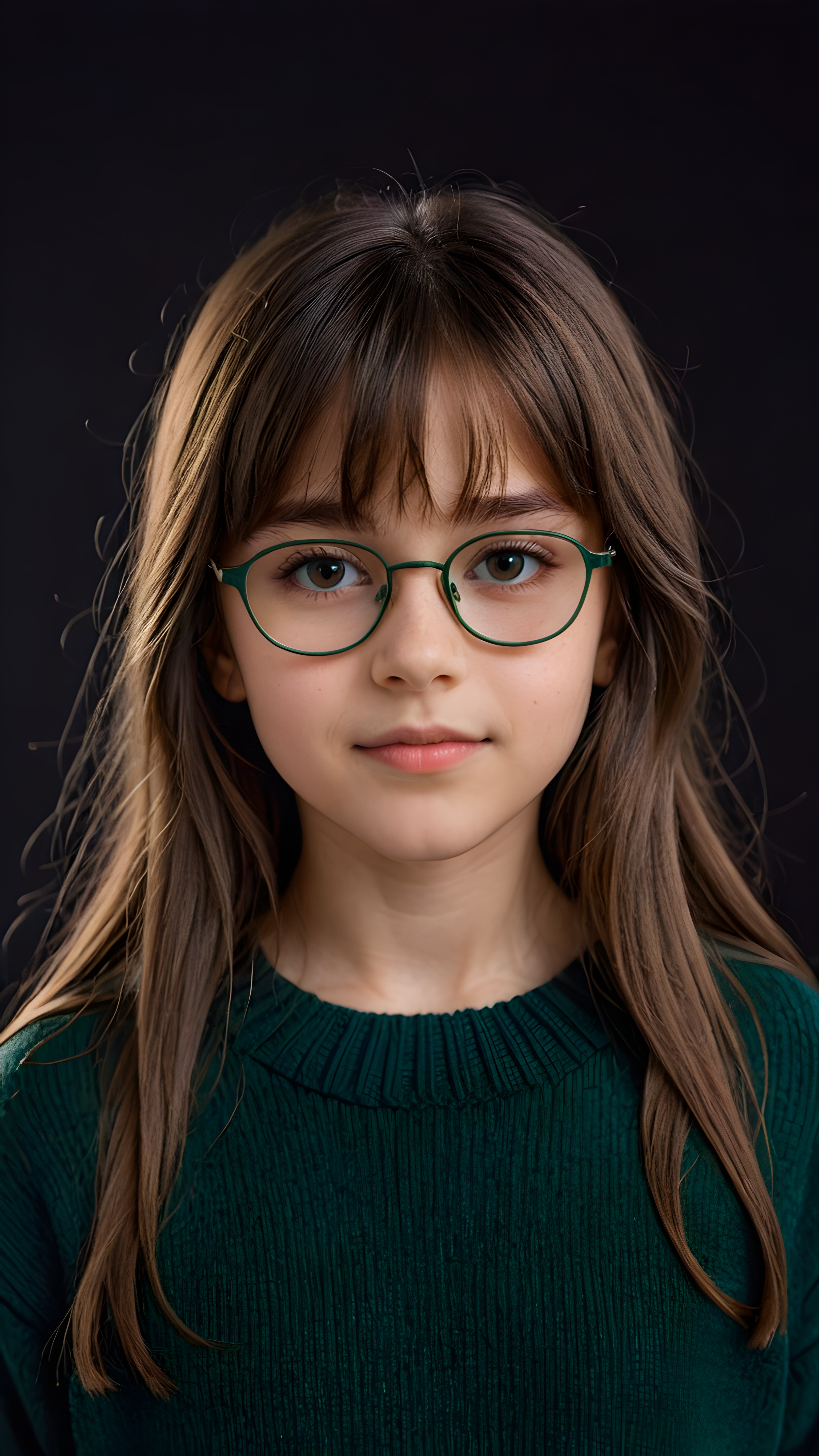 a 12-years old girl with long, brown shoulder-length hair, wearing a large, dark green prescription glasses, a fine sweater made of wool. She has bangs that are parted to the side. Her eyes are dark brown. ((dark background)) ((gorgeous)) ((stunning)) ((perfect portrait))