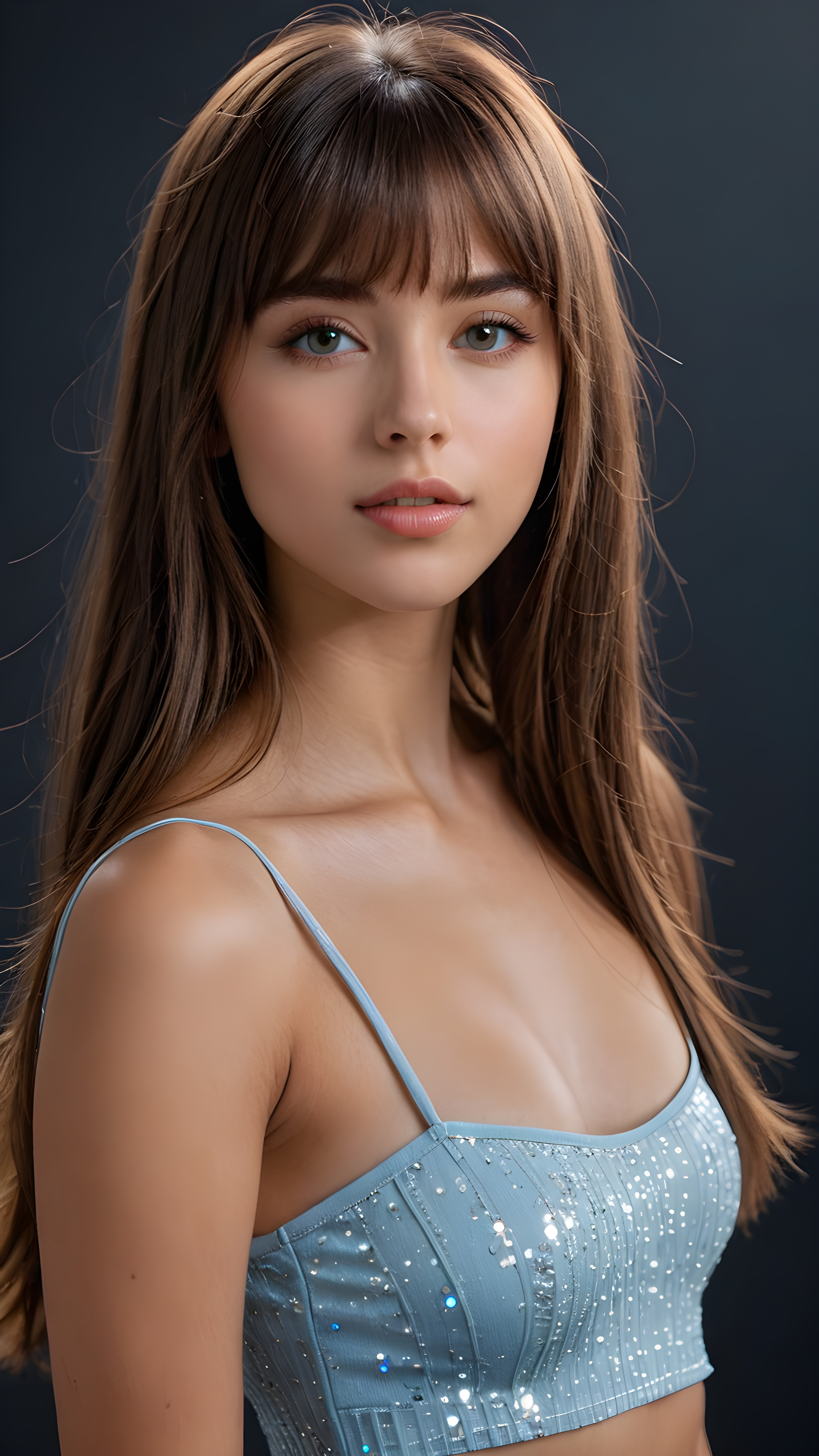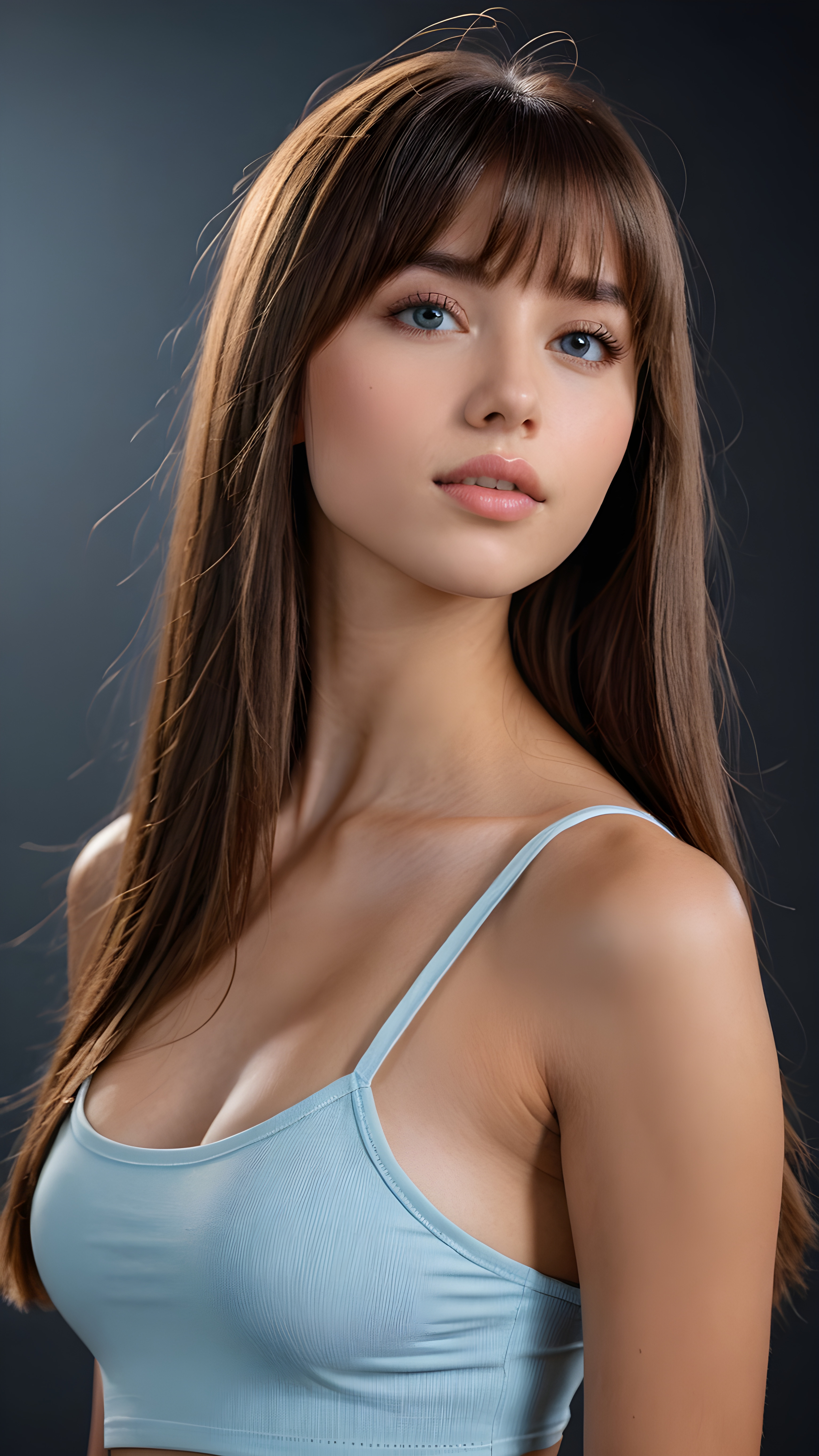 a young beautiful teen girl, she has full lips and her mouth is slightly open ready to kiss, she has long (((detailed brown straight shoulder-length hair, bangs that are parted to the side))), and (realistic light blue eyes), ((angelic face)), dark background, perfect shadows, weak light falls into the picture from the side, she wears a tight (((crop top in black))), perfect curved body, she looks seductively at the viewer, flawless skin, white teeth, ((side view)) ((ultra realistic photo)) ((stunning)) ((gorgeous)) ((4k)) ((upper body))