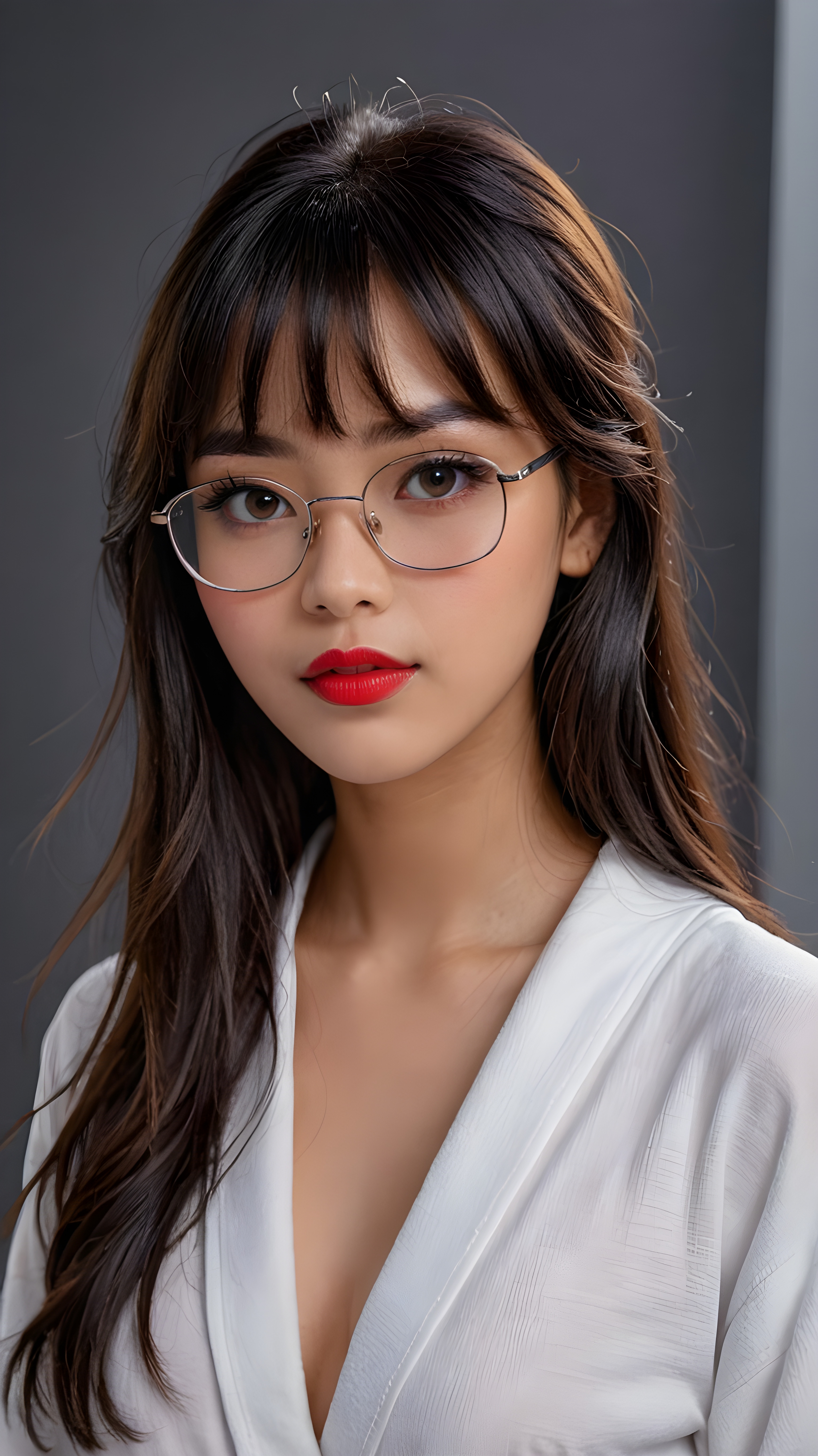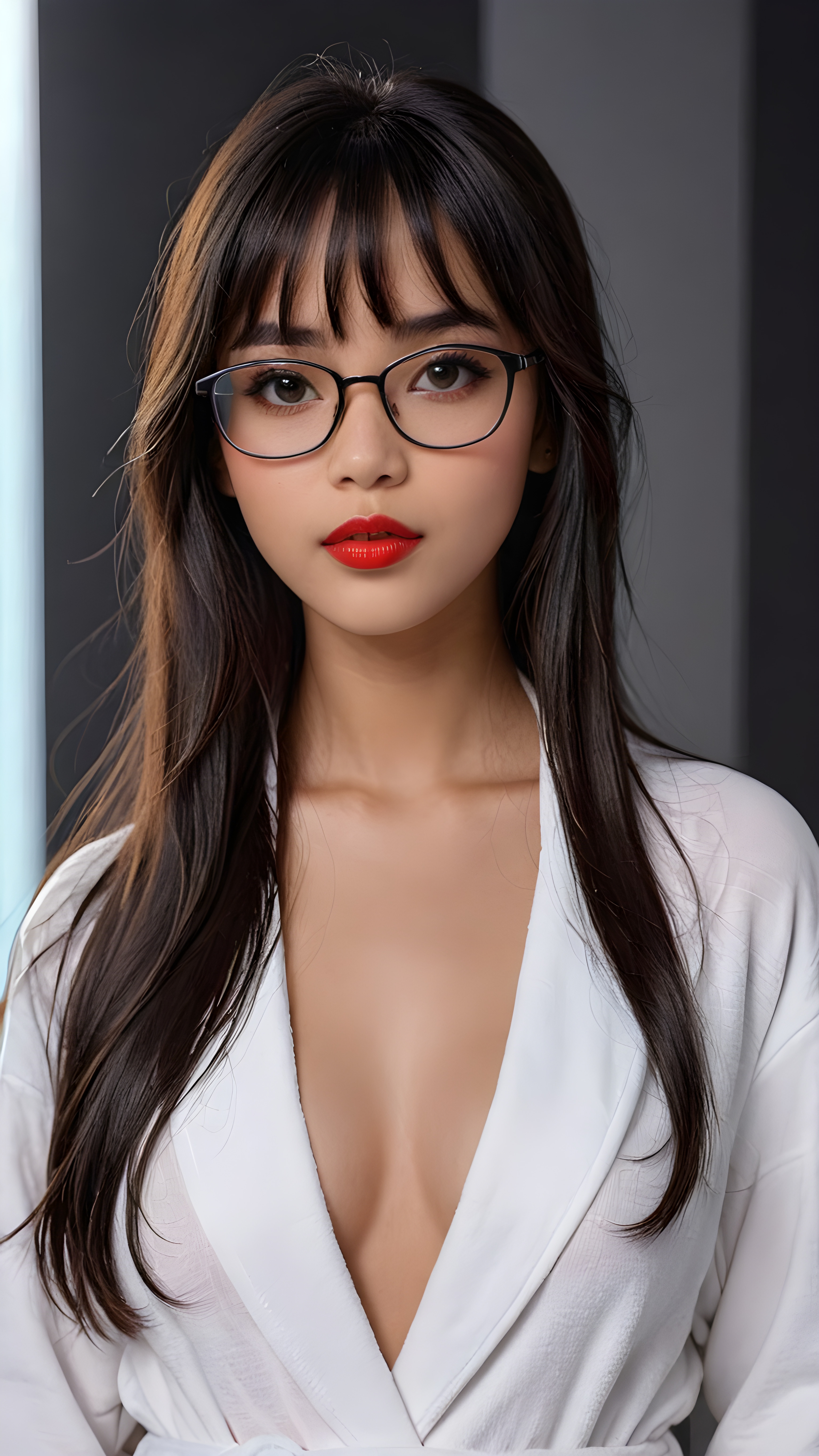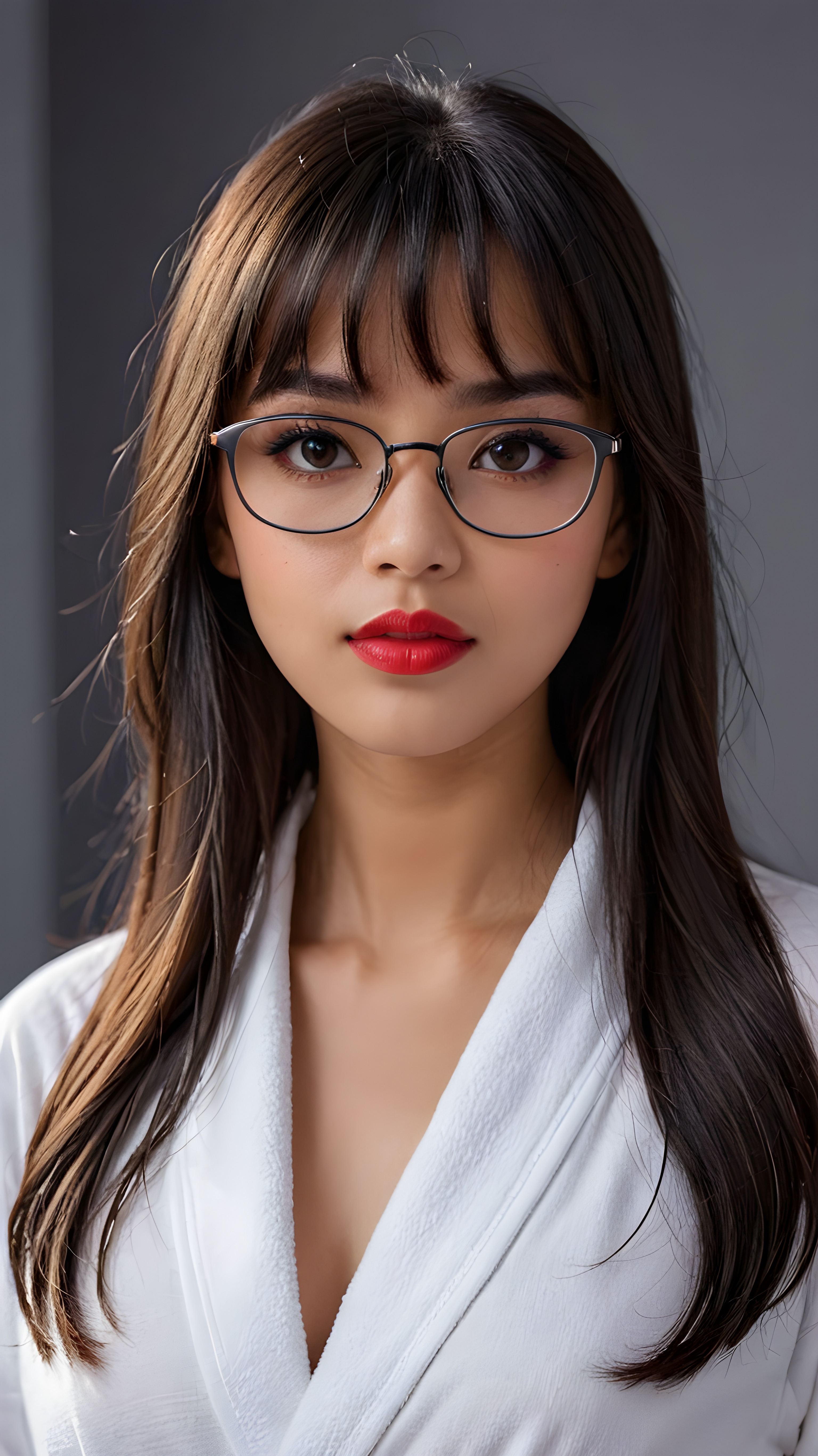 a young beautiful Exotic teen girl, wearing a large, dark prescription glasses, she wears a white bathrobe, she has (full red lips) and her mouth is slightly open, she has long (((detailed straight shoulder-length dark hair, bangs that are parted to the side))), and (realistic dark eyes), ((angelic face)), ((grey background)), perfect shadows, weak light falls into the picture from the side, perfect curved body, she looks seductively at the viewer, flawless skin, white teeth, ((side view)) ((ultra realistic photo)) ((stunning)) ((gorgeous)) ((4k)) ((upper body))