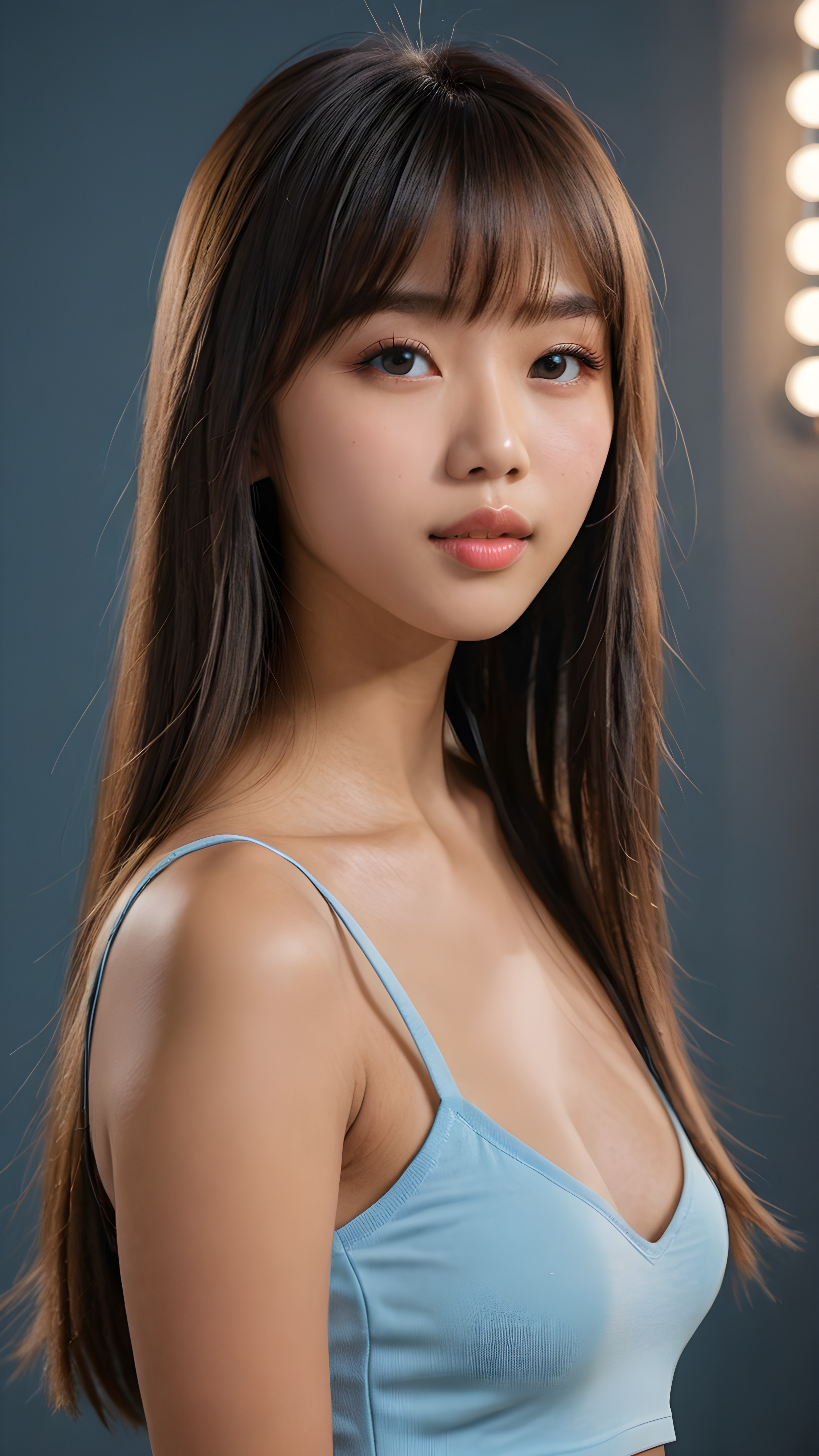 a young beautiful Asian teen girl, she has full lips and her mouth is slightly open ready to kiss, she has long (((detailed straight shoulder-length hair, bangs that are parted to the side))), and (realistic light blue eyes), ((angelic face)), dark background, perfect shadows, weak light falls into the picture from the side, she wears a tight (((crop top))), perfect curved body, she looks seductively at the viewer, flawless skin, white teeth, ((side view)) ((ultra realistic photo)) ((stunning)) ((gorgeous)) ((4k)) ((upper body))