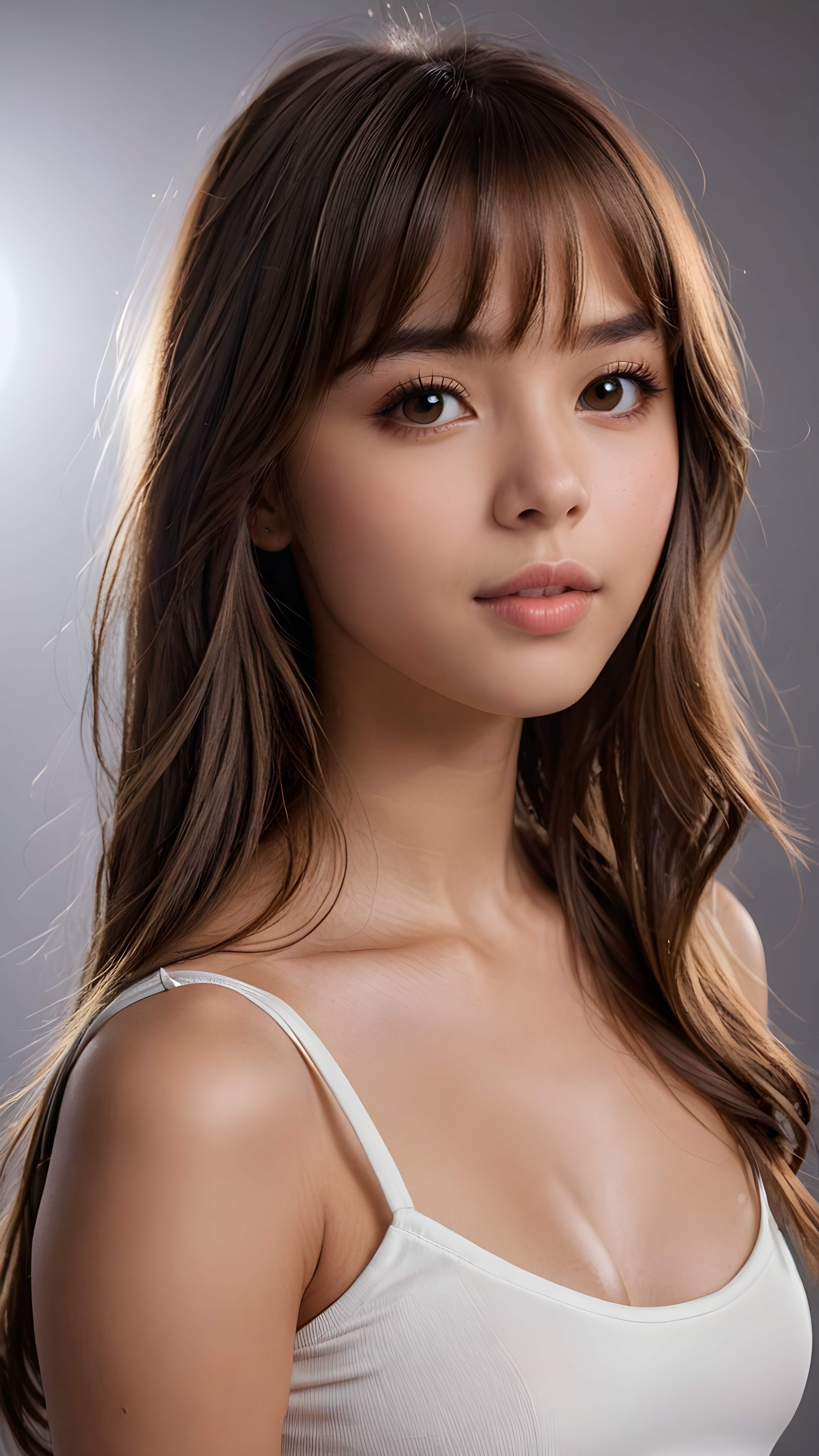 a young beautiful teen girl, she has full lips and her mouth is slightly open ready to kiss, she has long (((detailed brown straight shoulder-length hair, bangs that are parted to the side))), and (realistic light brown eyes), ((angelic face)), dark background, perfect shadows, weak light falls into the picture from the side, she wears a tight (((crop top in white))), perfect curved body, she looks seductively at the viewer, flawless skin, white teeth, ((side view)) ((ultra realistic photo)) ((stunning)) ((gorgeous)) ((4k)) ((upper body))