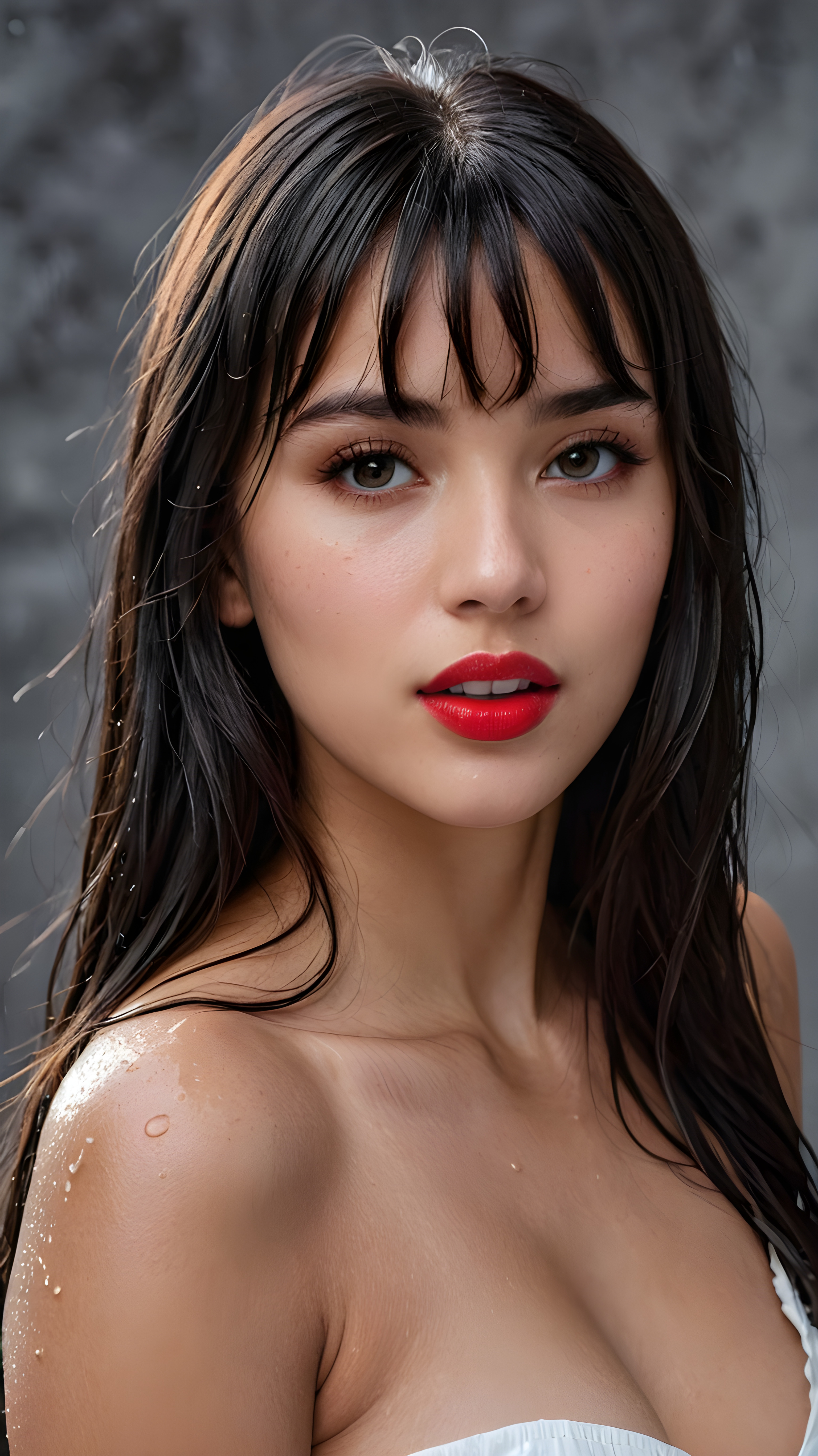 a young beautiful young busty teen girl, she has (full red lips) and her mouth is slightly open, she has long (((detailed straight wet shoulder-length dark hair, bangs that are parted to the side))), and (realistic dark eyes), ((round angelic face)), ((grey background)), perfect shadows, weak light falls into the picture from the side, perfect curved body, she looks seductively at the viewer, flawless skin, white teeth, ((side view)) ((ultra realistic photo)) ((stunning)) ((gorgeous)) ((4k)) ((upper body))