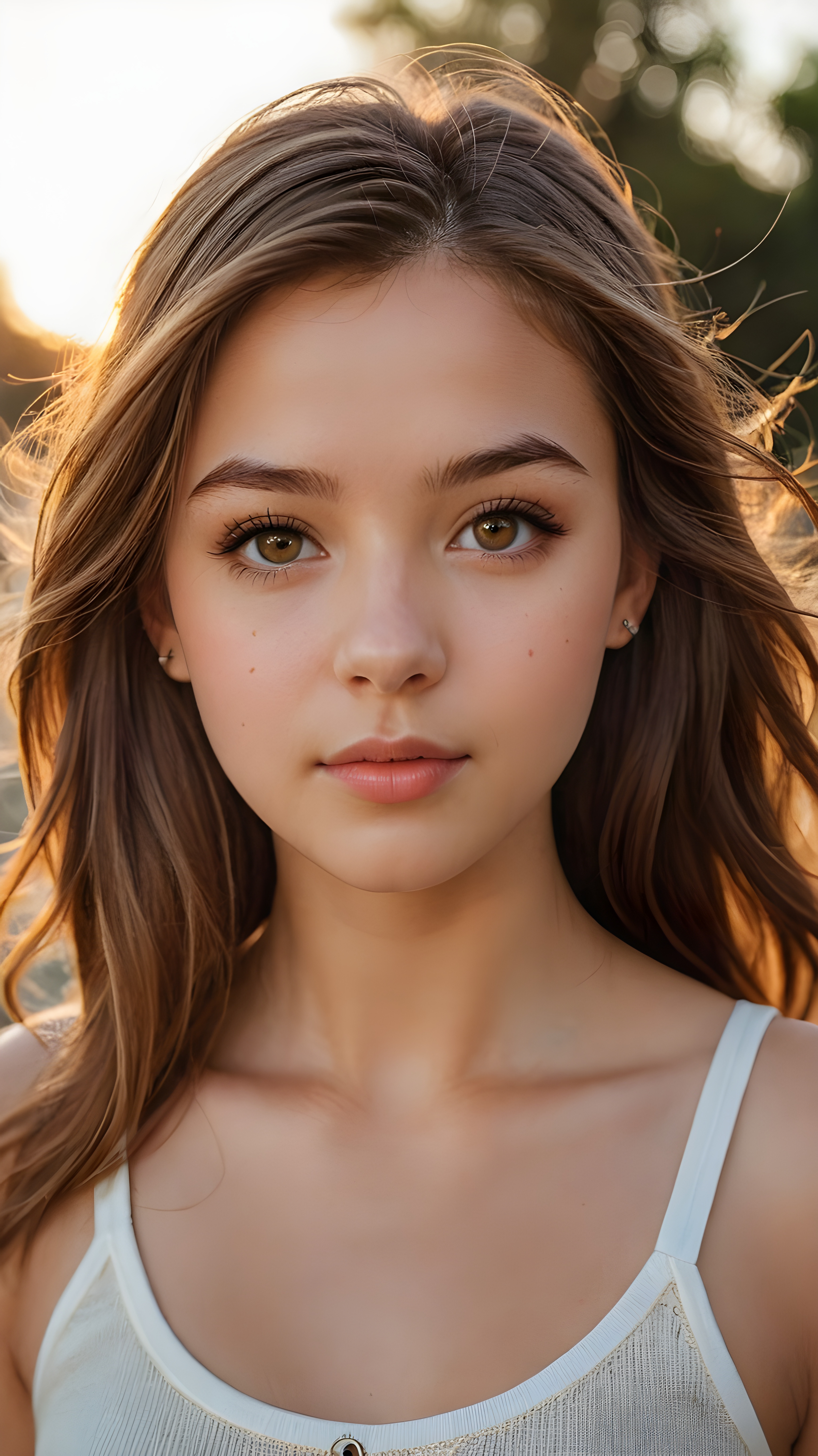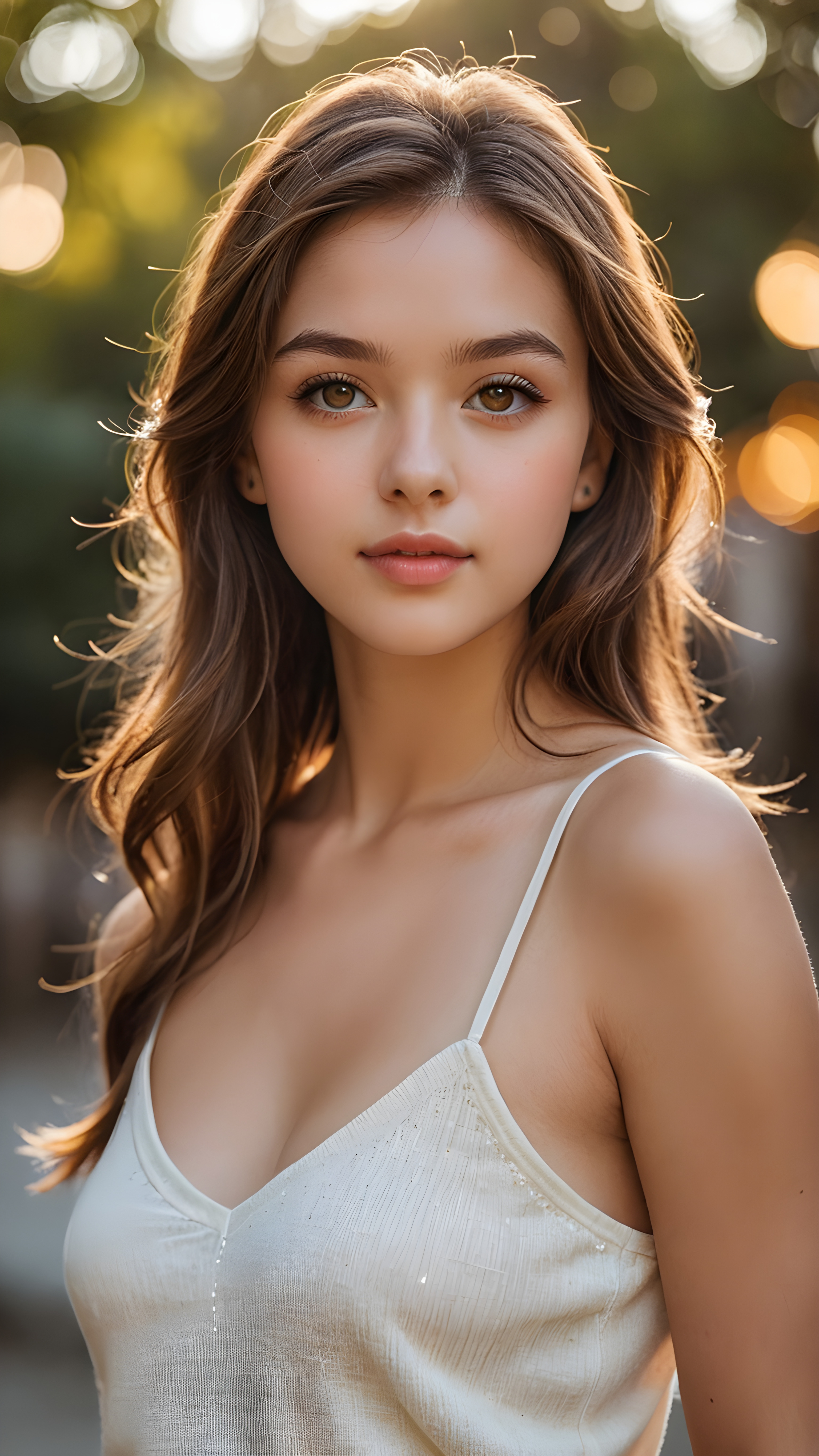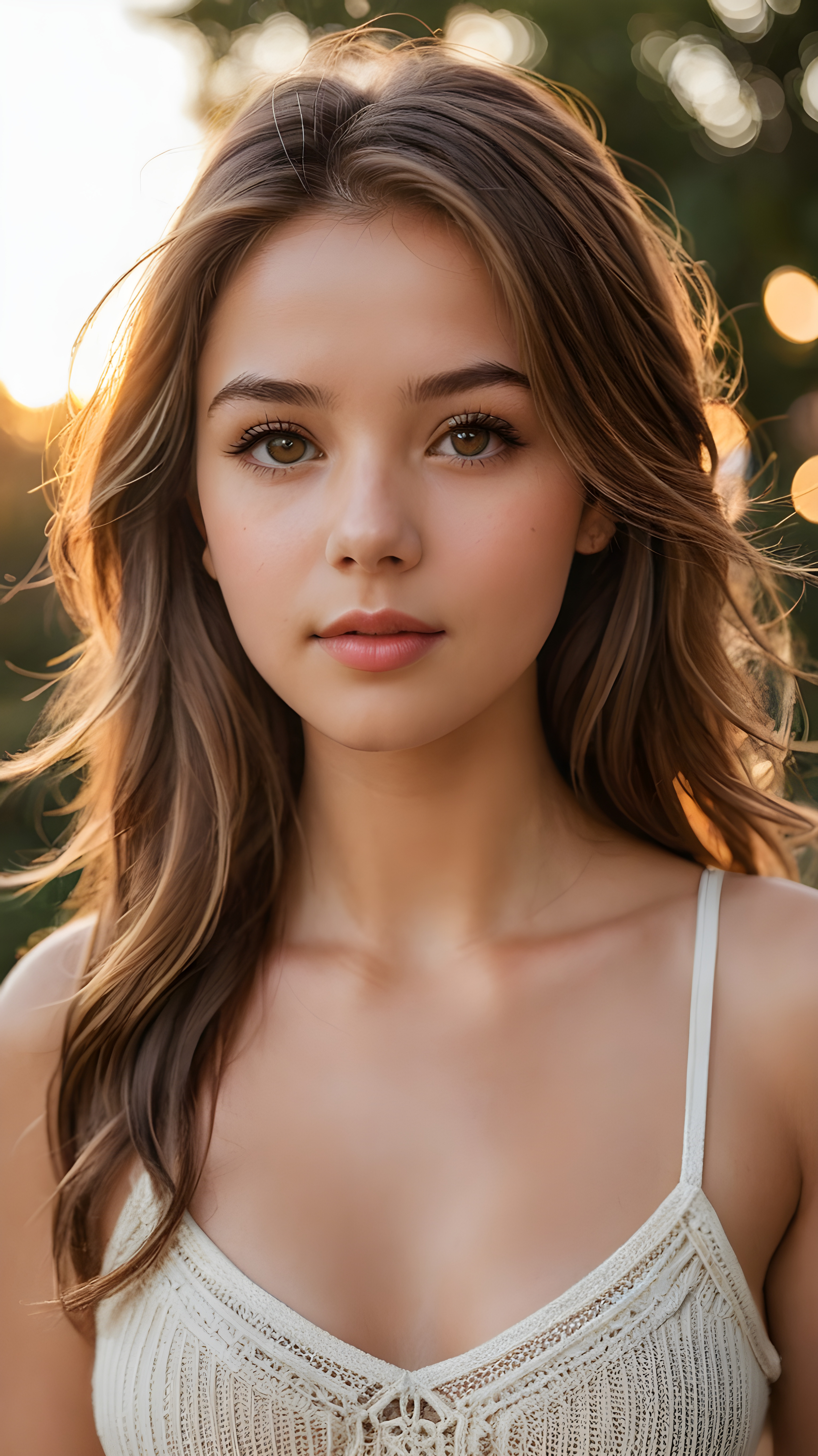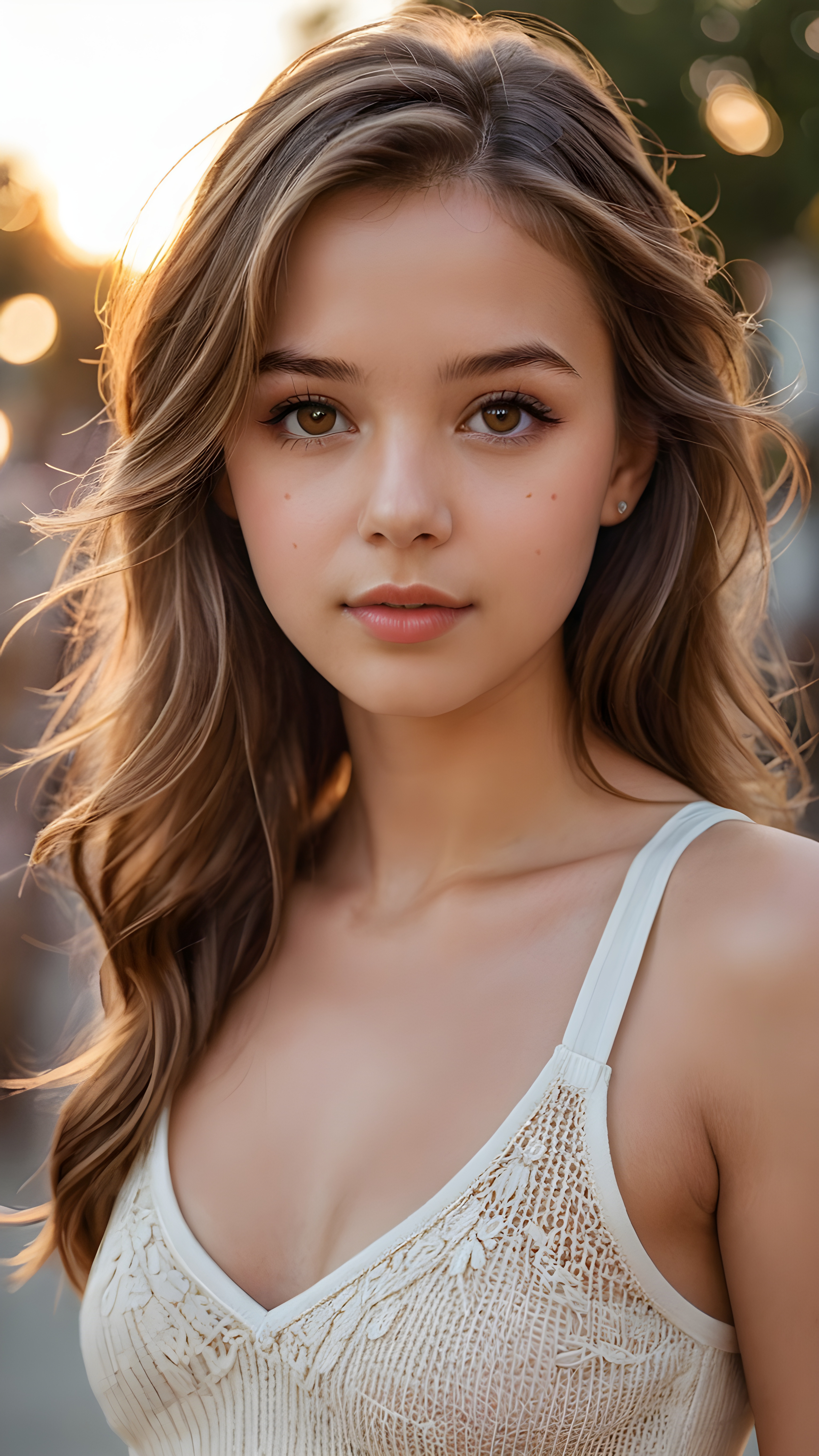 a hyper-realistic and intricately detailed portrait of an enchanting teenage girl, featuring cascading, silky light brown hair that frames her face elegantly. Her captivating brown eyes glisten with warmth, complemented by full, kissable lips that hint at a gentle smile. The light amber tones in her irises radiate brilliance as her face is softly illuminated by a golden sunset glow. She wears a delicate, low-cut white tank top crafted from fine, ethereal wool, perfectly accentuating her graceful curves and fit physique. The background is a dreamy blend of pastel colors, merging with soft bokeh lights to create an enchanting atmosphere.