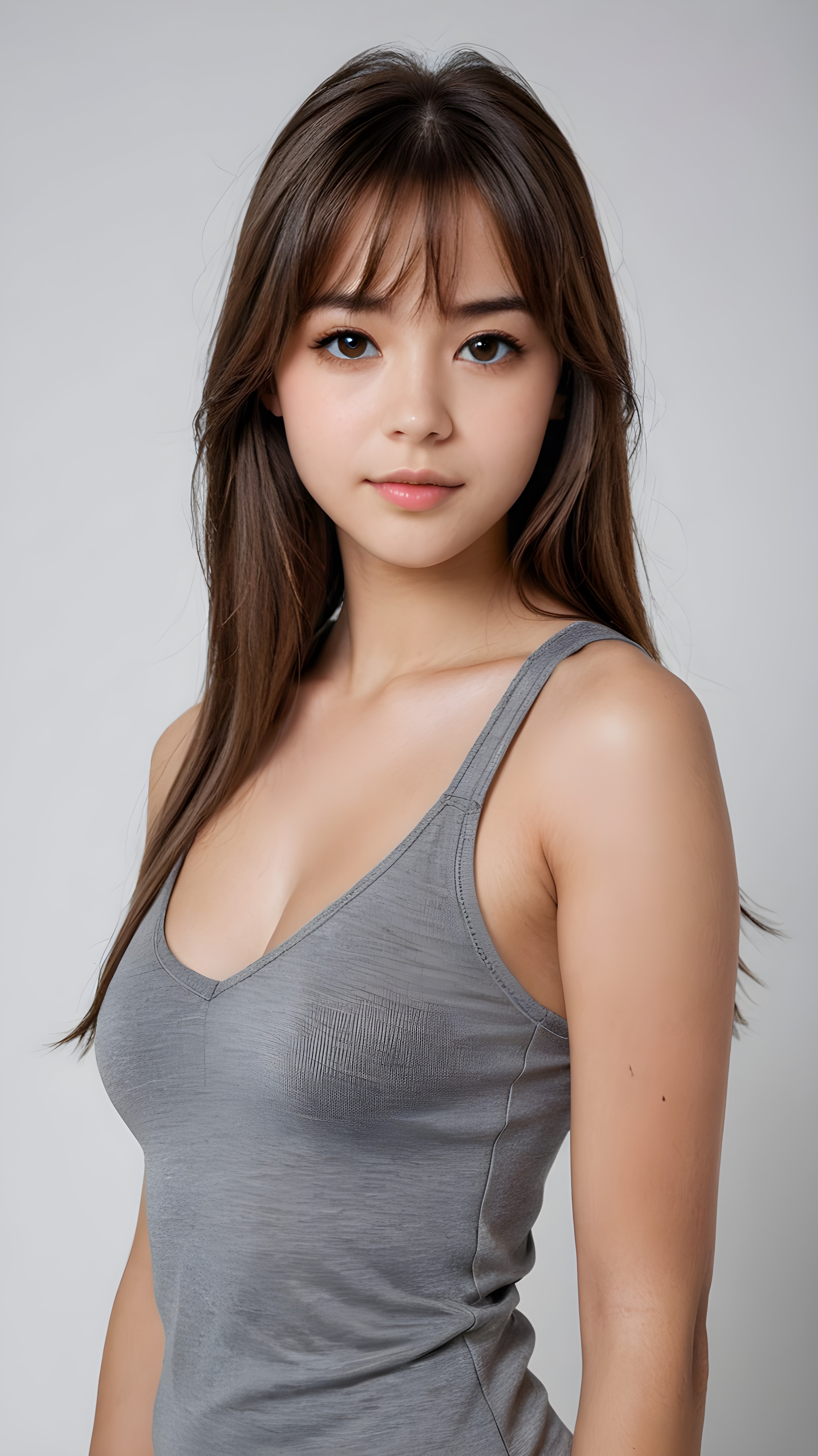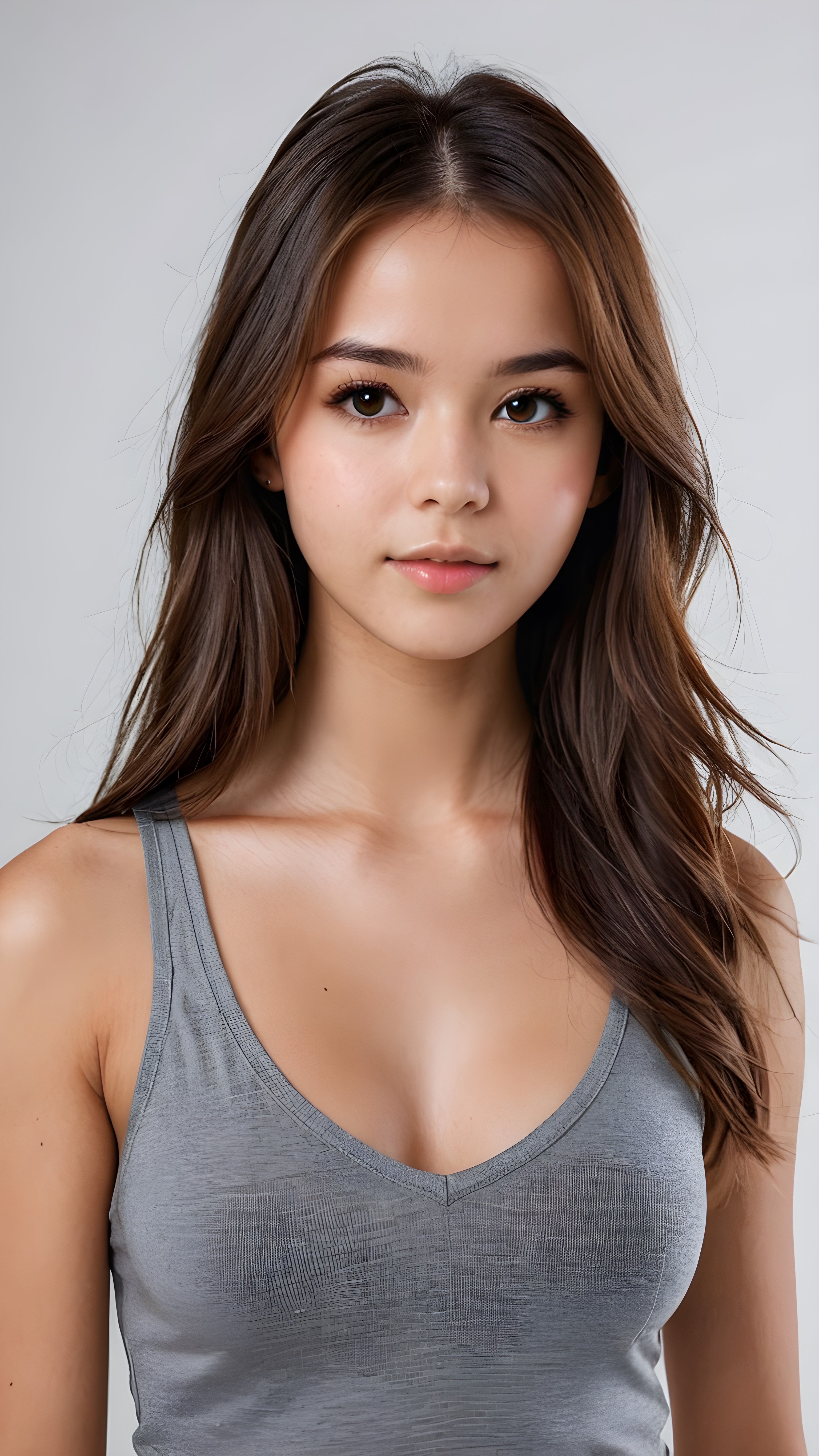 a ((detailed and realistic portrait)) of (((cute and gorgeous))) ((long, straight brown jet hair)) ((stunning)) a beautifully ((teen girl)), bangs cut frame her face, angelic round face, full kissable lips, ((brown eye)) looks at the camera, perfect curved body, (wears a super short tight (grey tank top, deep v-neck, open front) made of plain latex), white background, side view, ((no background)), cinematic dimmed light