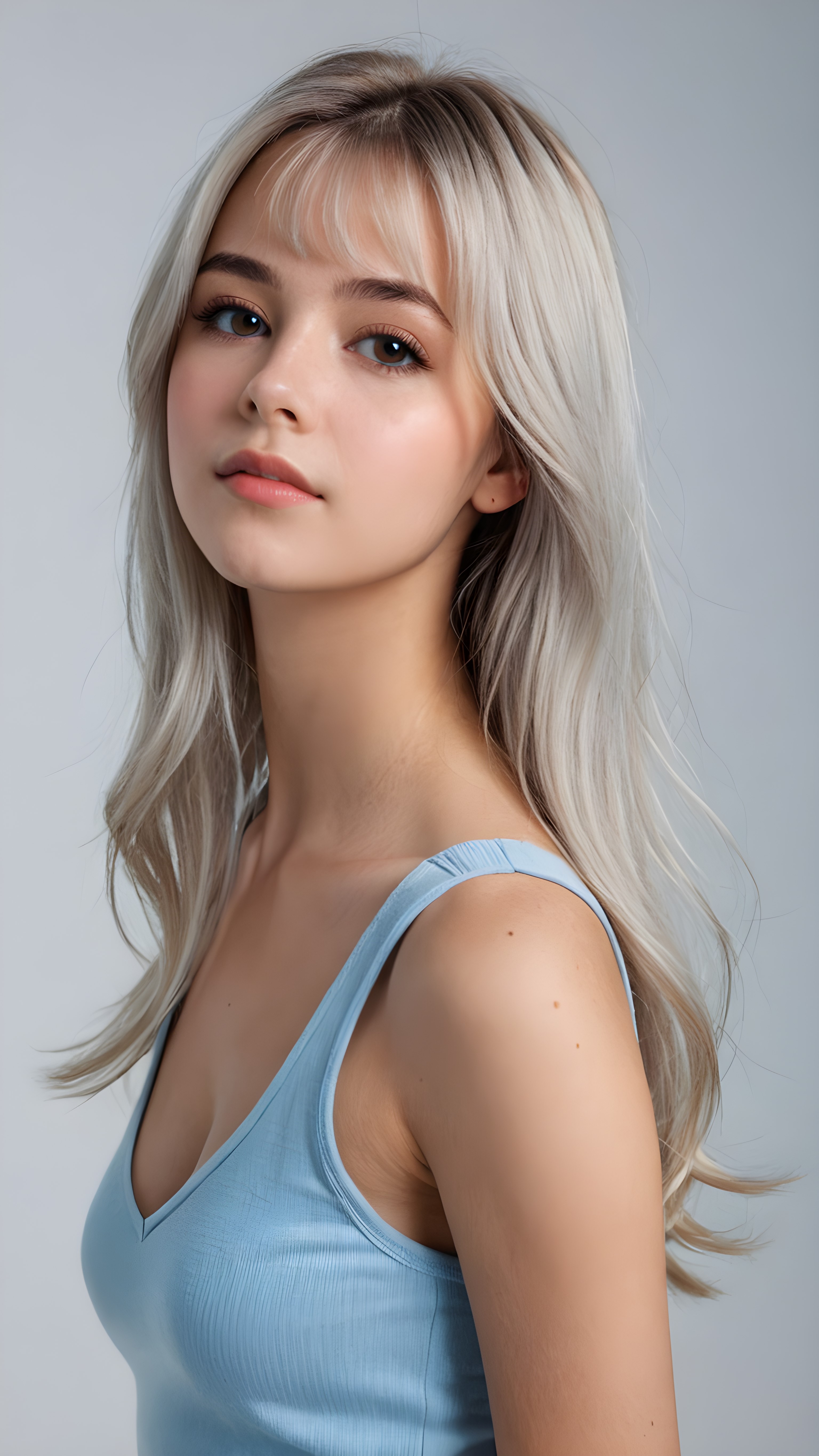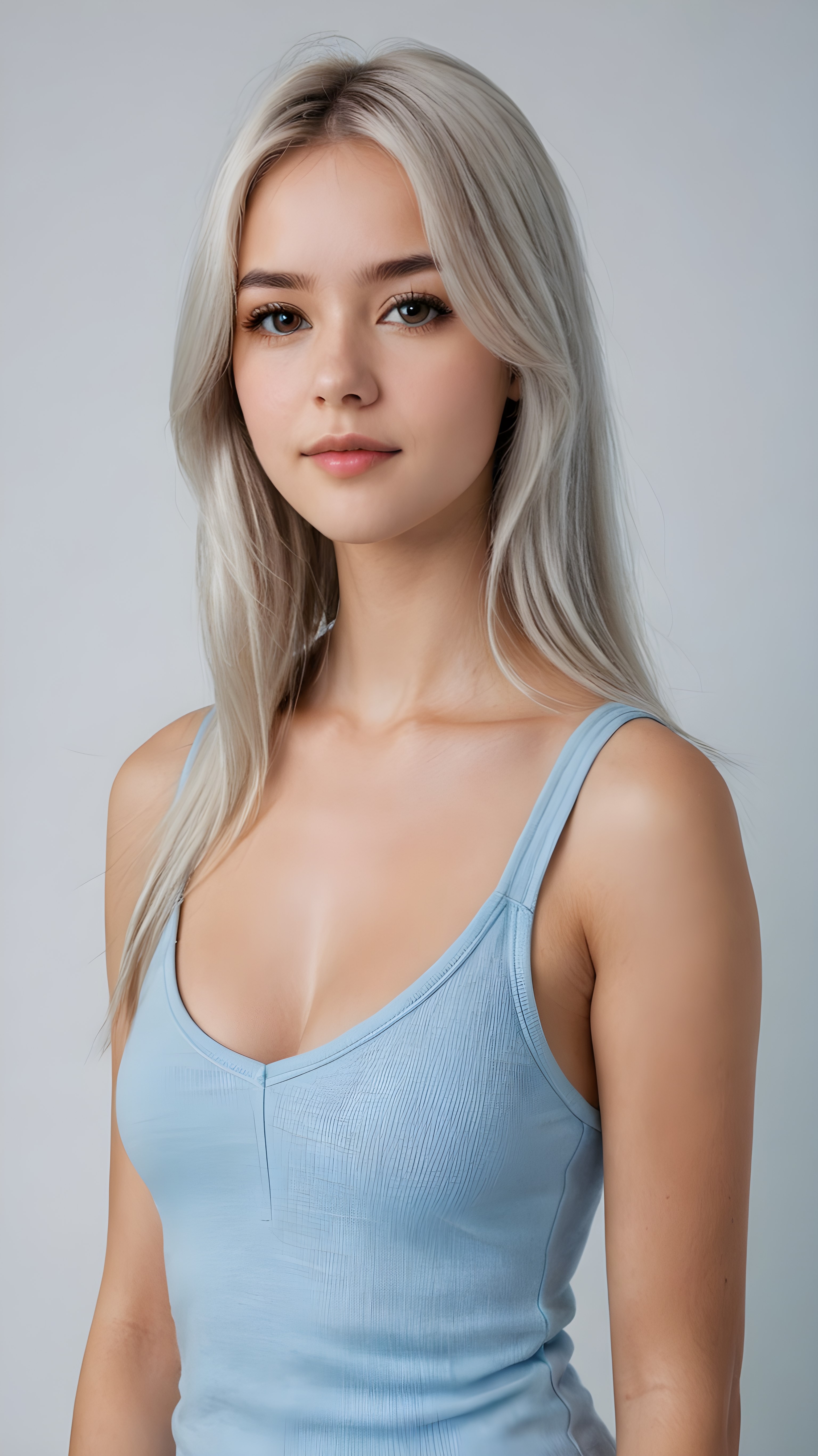 a ((detailed and realistic portrait)) of (((cute and gorgeous))) ((long, straight platinum white jet hair)) ((stunning)) a beautifully ((teen girl)), bangs cut frame her face, angelic round face, ((brown eye)) looks at the camera, perfect curved body, (wears a super short tight (light blue tank top, deep v-neck, open front made of super fine wool), white background, side view, ((no background)), cinematic dimmed light