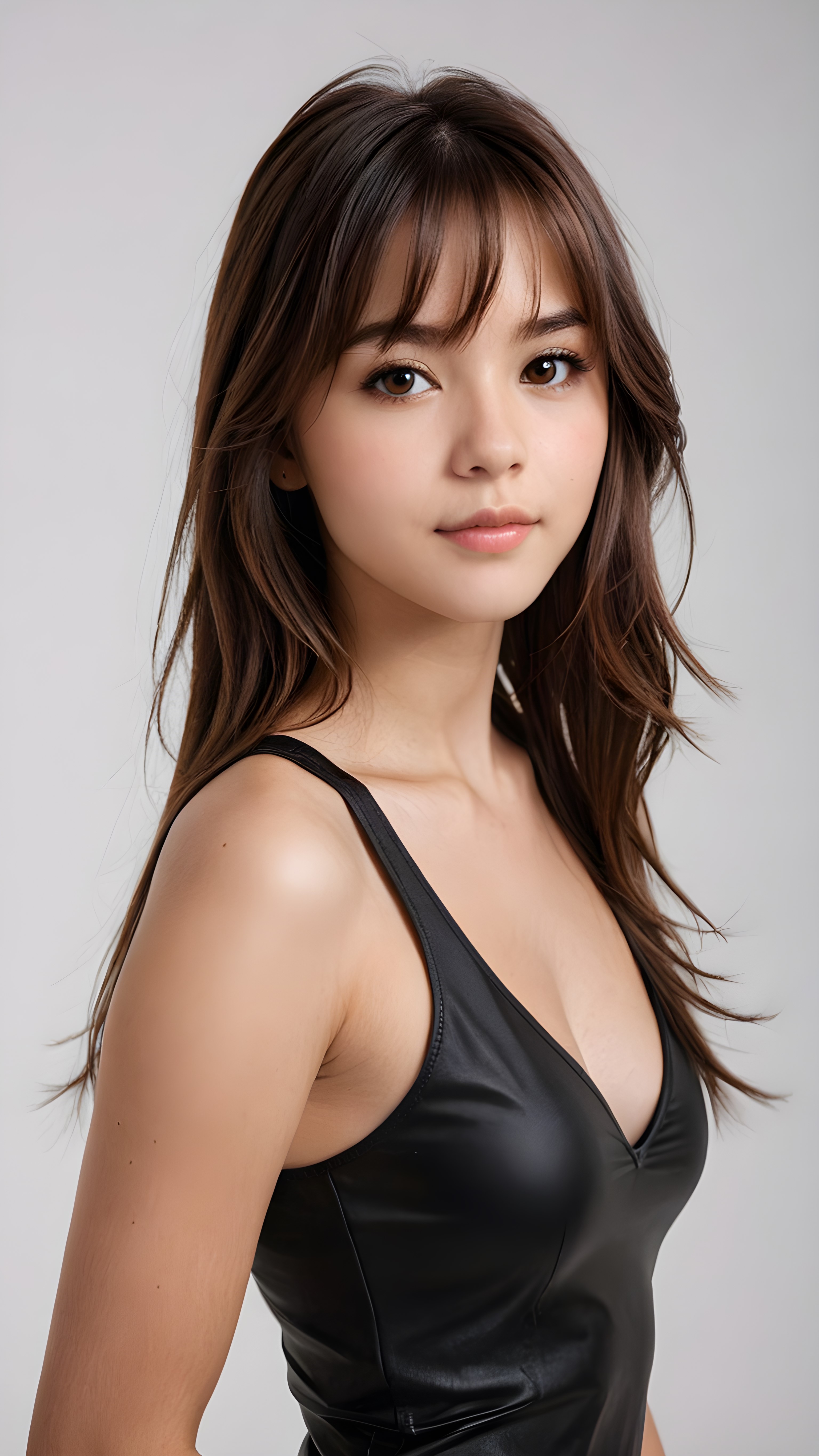 a ((detailed and realistic portrait)) of (((cute and gorgeous))) ((long, straight brown jet hair)) ((stunning)) a beautifully ((teen girl)), 15 years old, bangs cut, angelic round face, ((brown eye)) looks at the camera, perfect curved body, (wears a super short tight (black tank top, deep v-neck) made of plain latex), white background, side view, ((no background)), cinematic dimmed light, ((view from above))