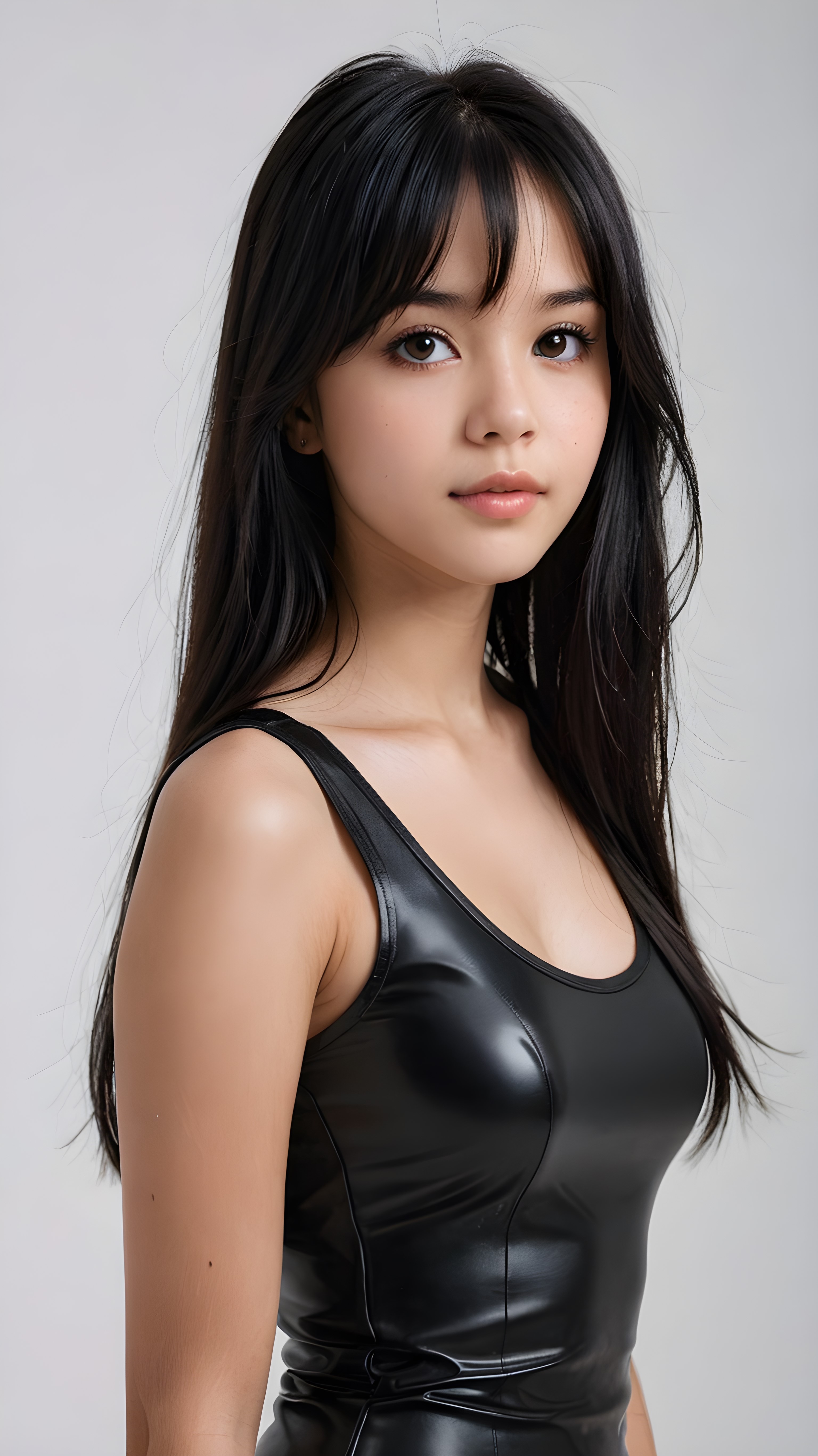 ((detailed, realistic)) ((portrait)) of (((cute and gorgeous))) ((long, straight black hair)) ((stunning)) a beautifully ((teen girl)), 15 years old, bangs cut, angelic round face, ((black eye)) looks at the camera, perfect curved body, (wears a super short tight (black tank top) made of latex), white background, side view, ((no background)), cinematic dimmed light