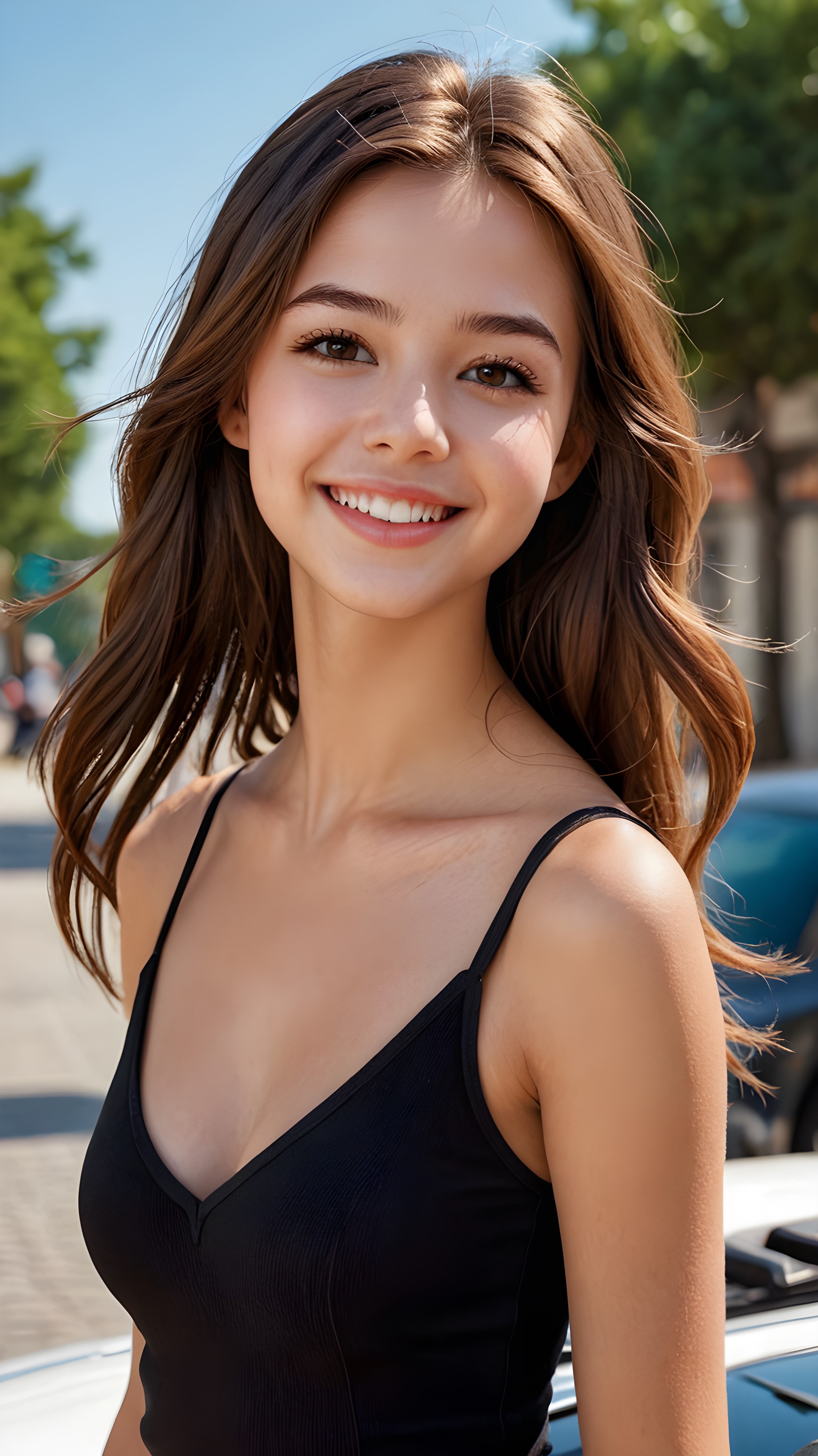 realistic very high quality hyper-detailed intricate details high-resolution ultra-high detail image of a cute and gorgeous ((long, straight brown jet hair)) teen girl with a ((round face)), natural (almond skin) and (detailed, realistic (pale brown eyes))), perfectly detailed ((natural looking lips)), in a ((perfect white teeth smile)), almond-shaped eyes. She wears a ((short tight (black tank top, deep v-neck)), ((no background)) and ((her wings are slightly curved)), cinematic dimmed light