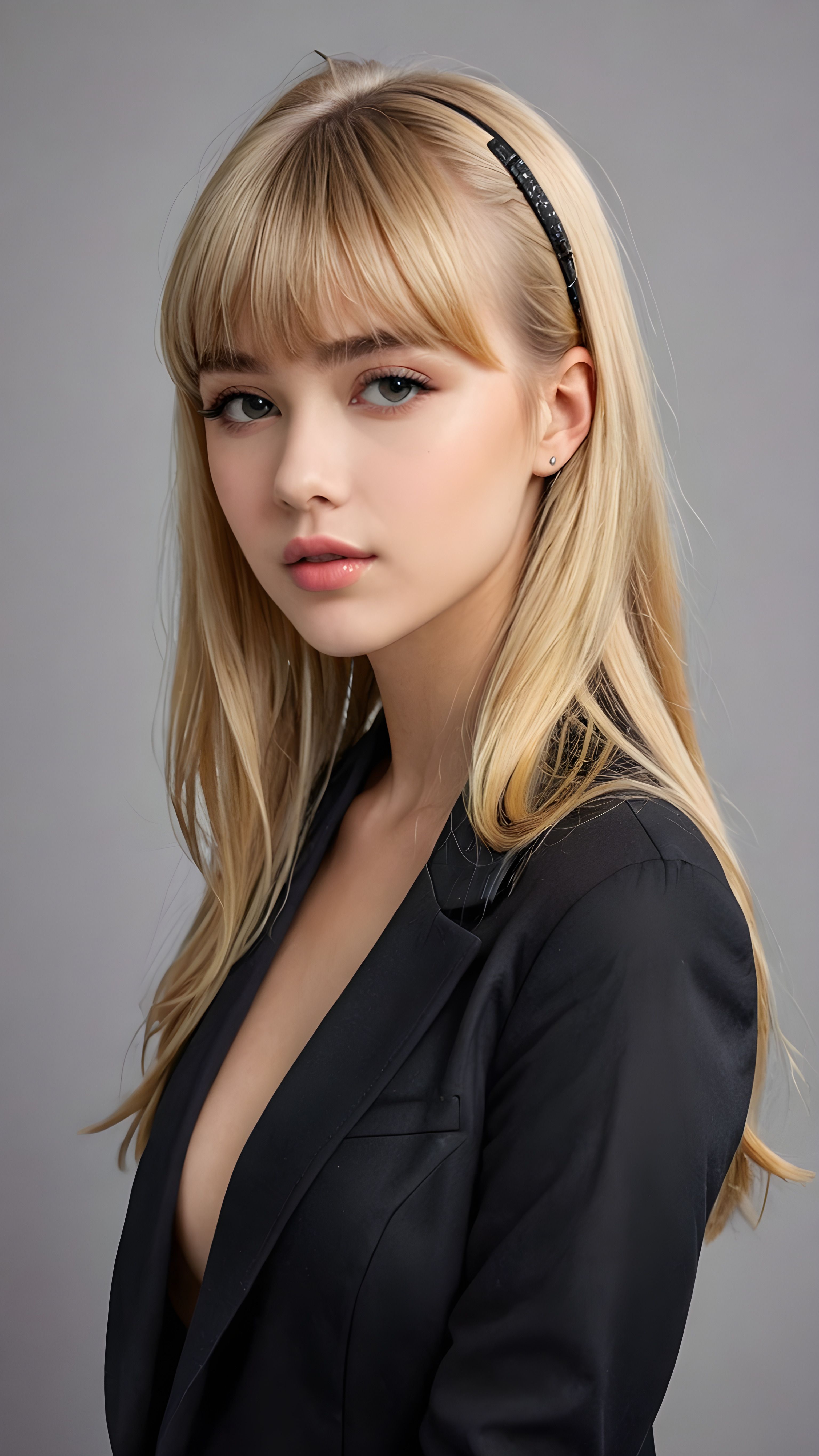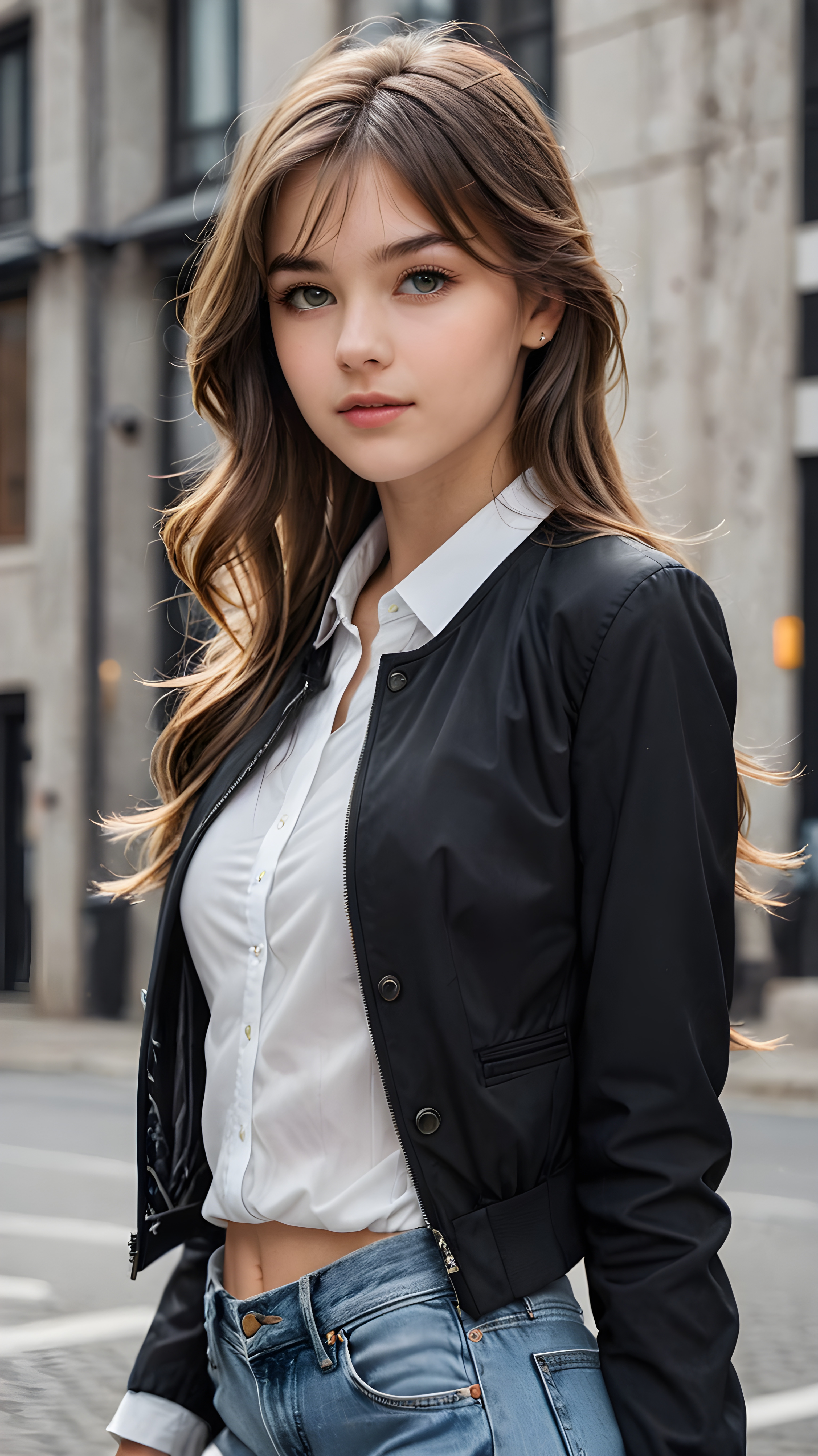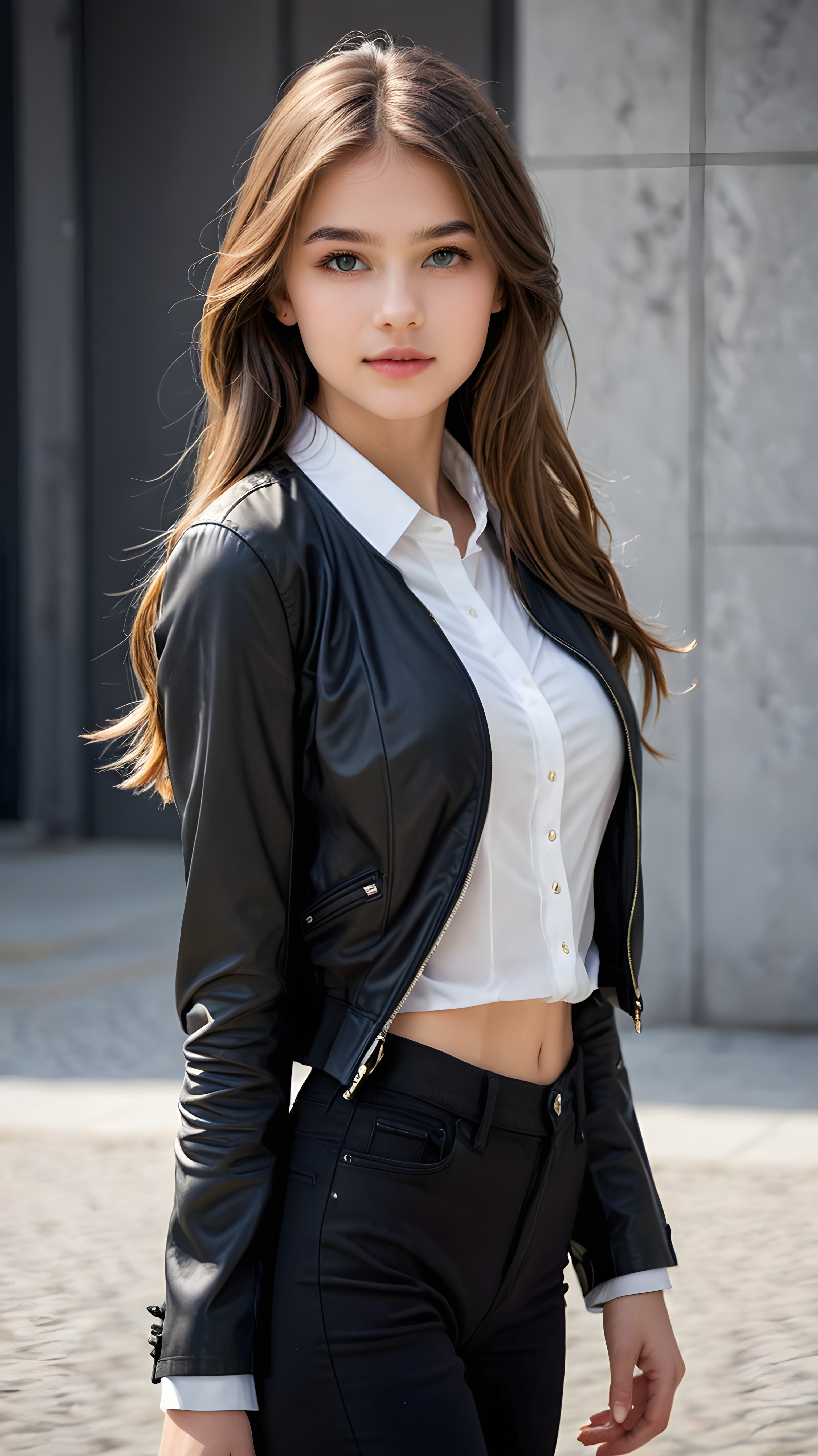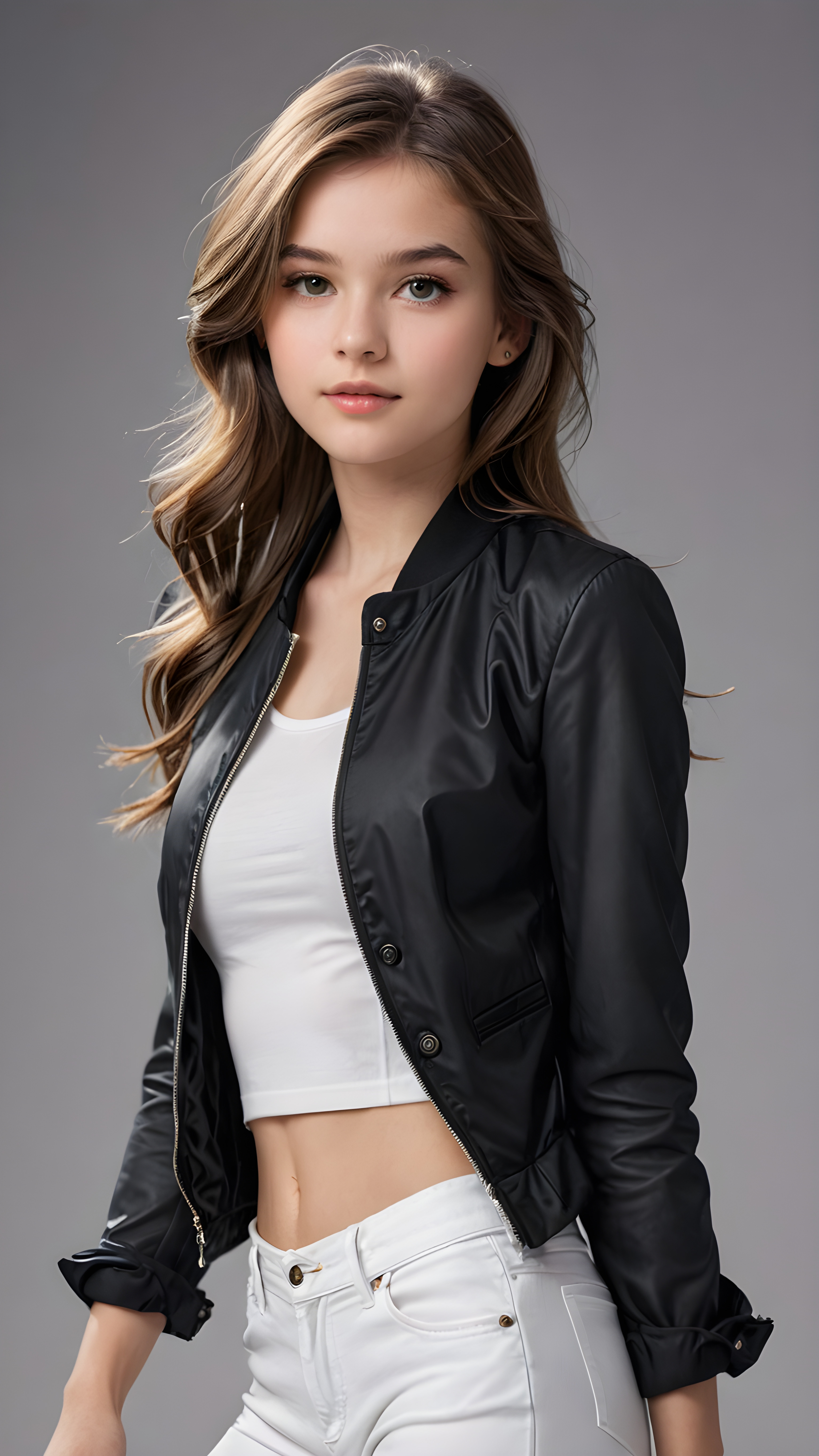 a beautifully drawn (((figure))), representing a (((young beautiful teen girl))), with a perfectly proportions body, ((slender waist)), ((beautifully curved hips)), ((delicate jawline)), and ((beautiful grey eyes)), with luxuriously long, ((straight hair)) styled in a playful side-swept bangs that softly falls down her back, paired with a whimsically styled, ((black cropped jacket)) and a ((white shirt)), all against a backdrop of a (abstract grey background)