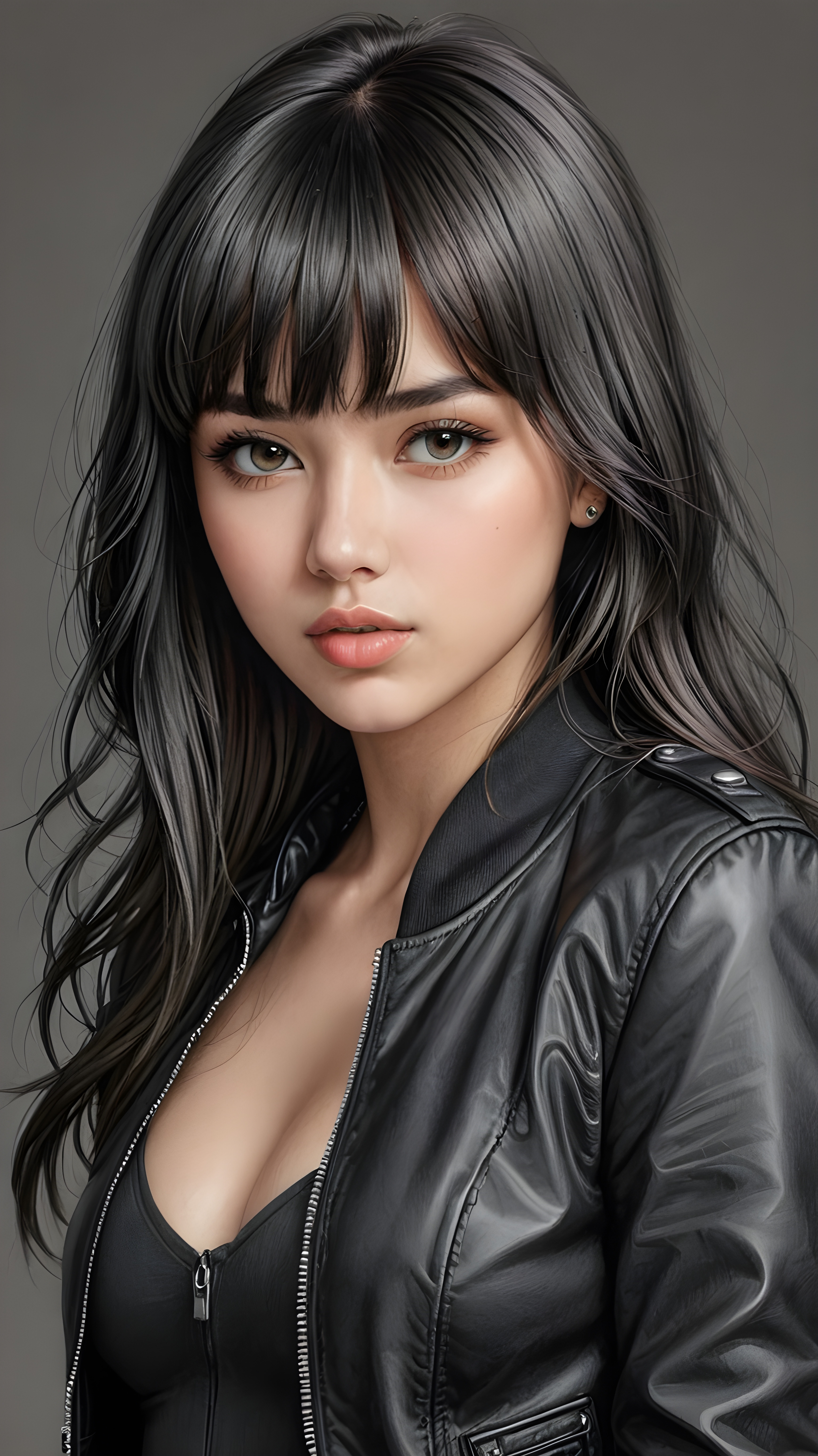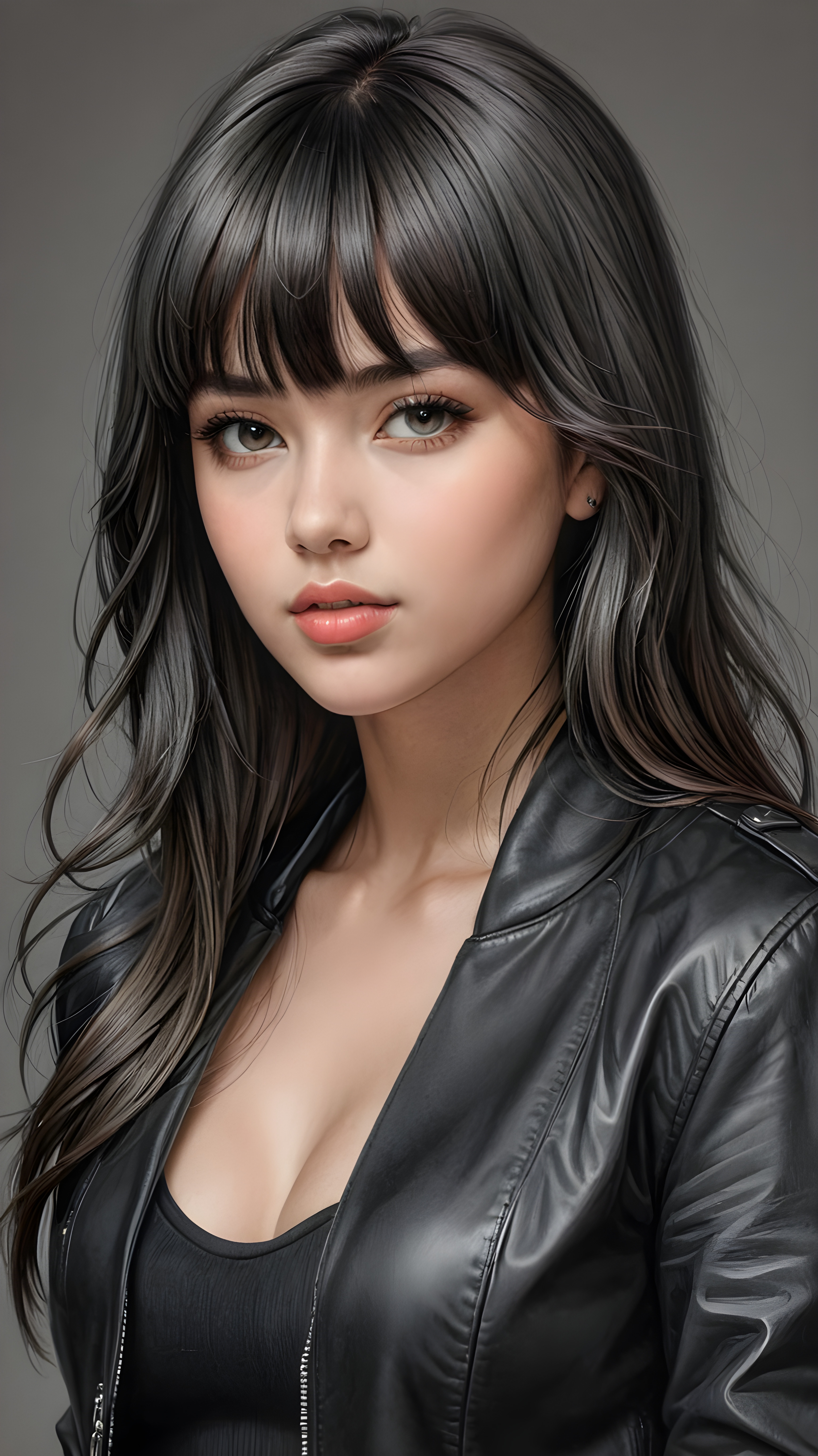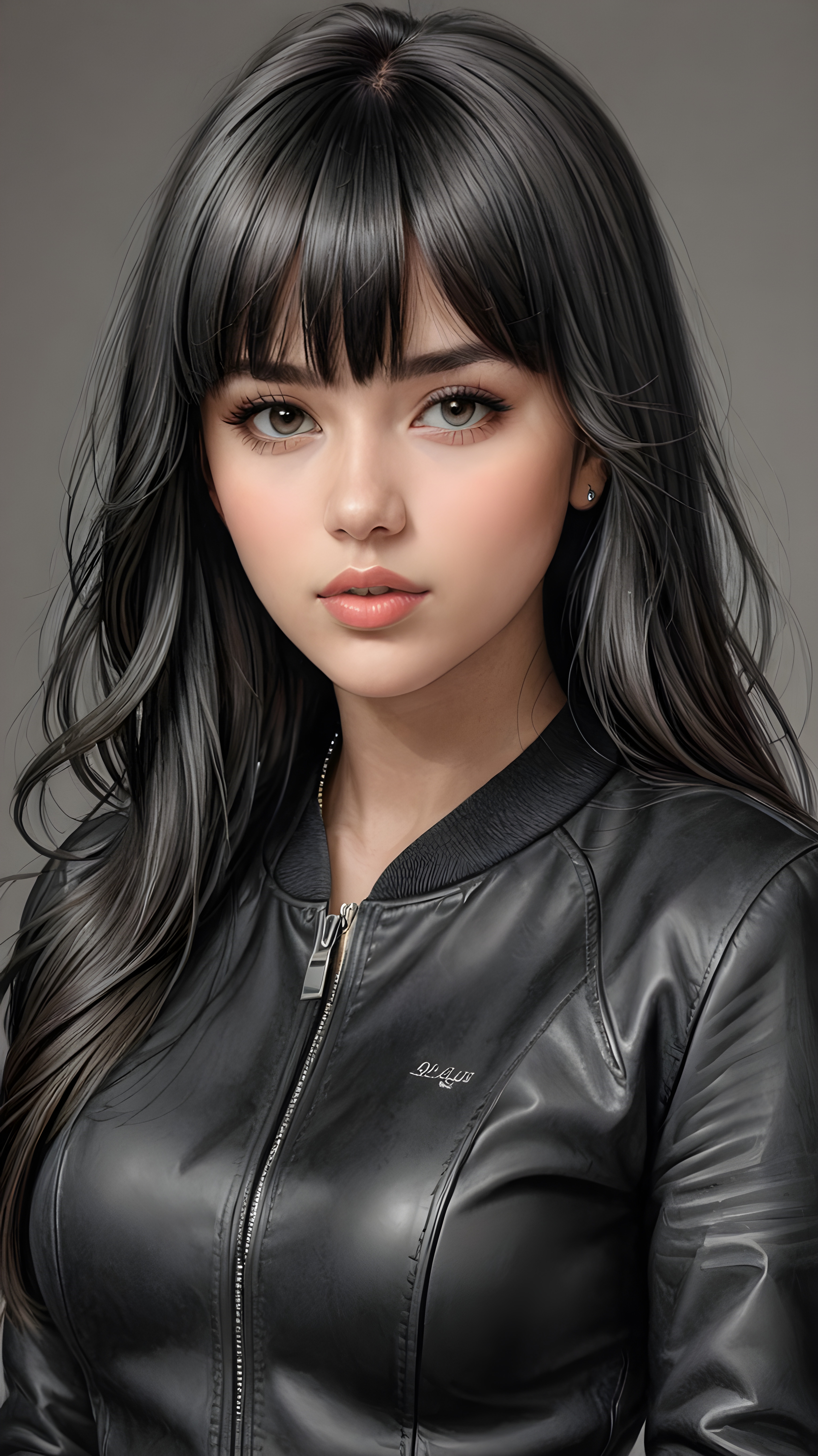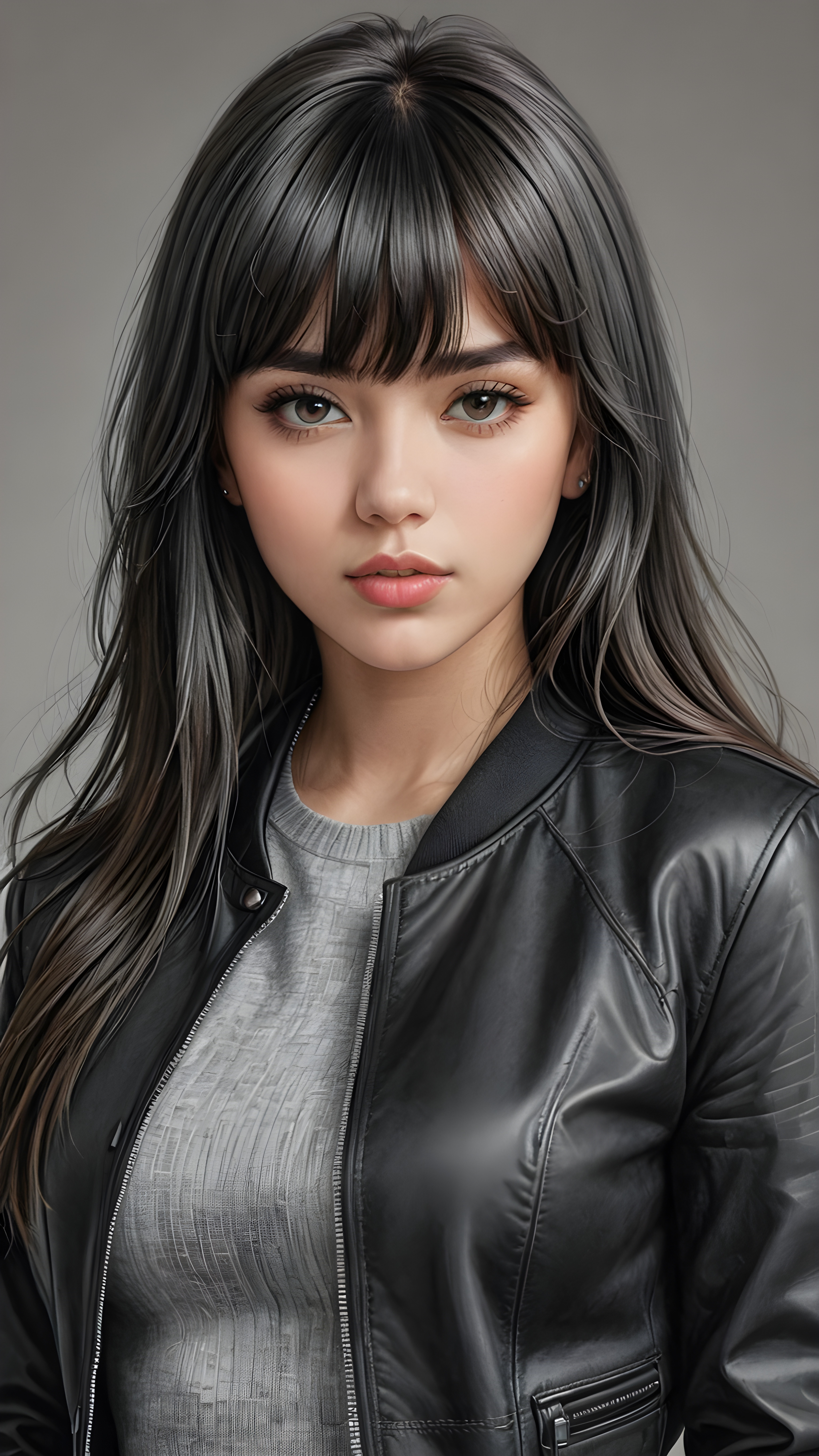 a young beautiful teen girl, perfect curved body, realistic detailed hair, fit body, full lips, crop black jacket, ((straight hair, bangs cut), ((stunning)) ((gorgeous)) ((detailed upper body portrait)), ((grey background)) ((a charcoal pencil drawing by hand))