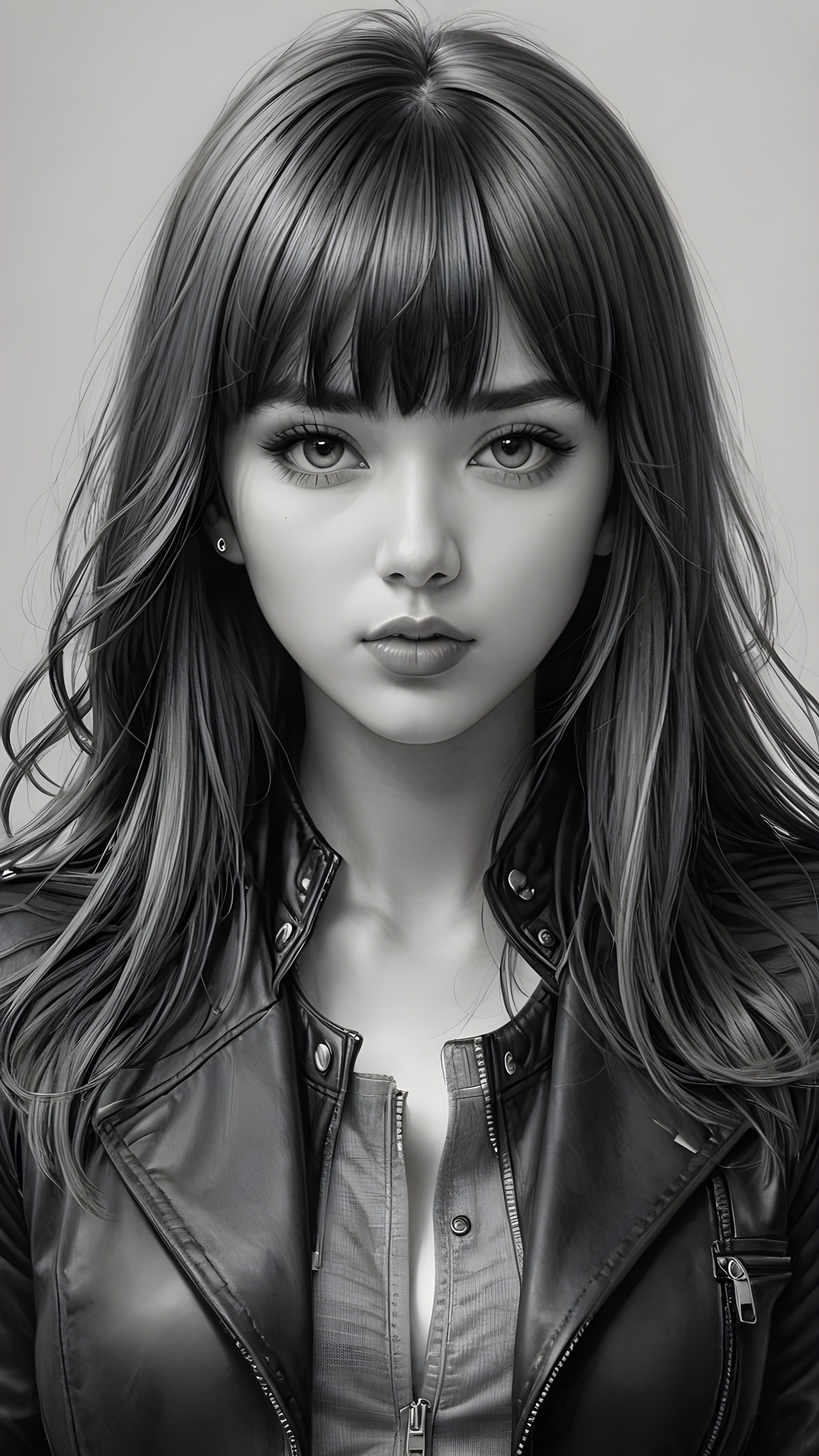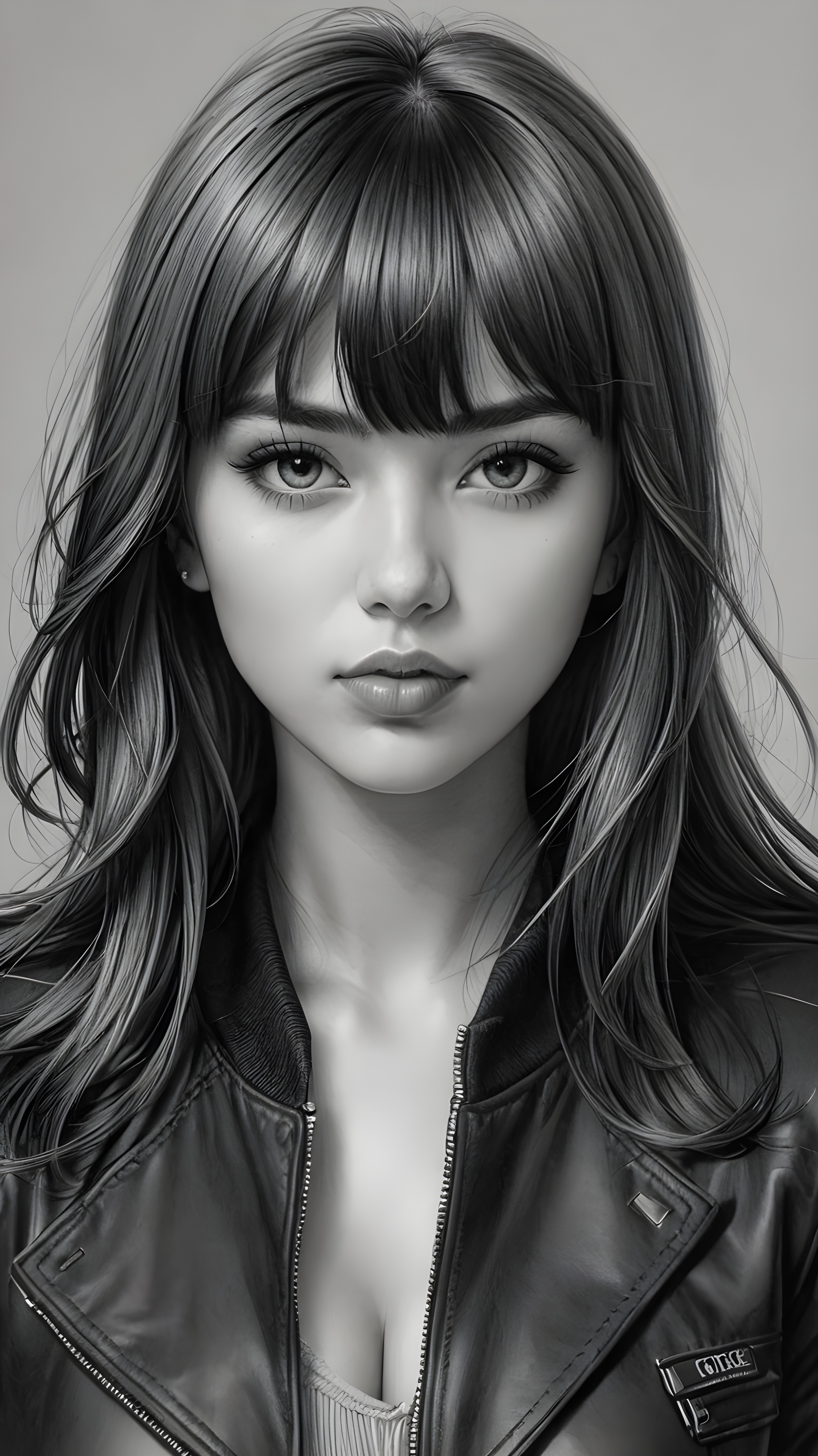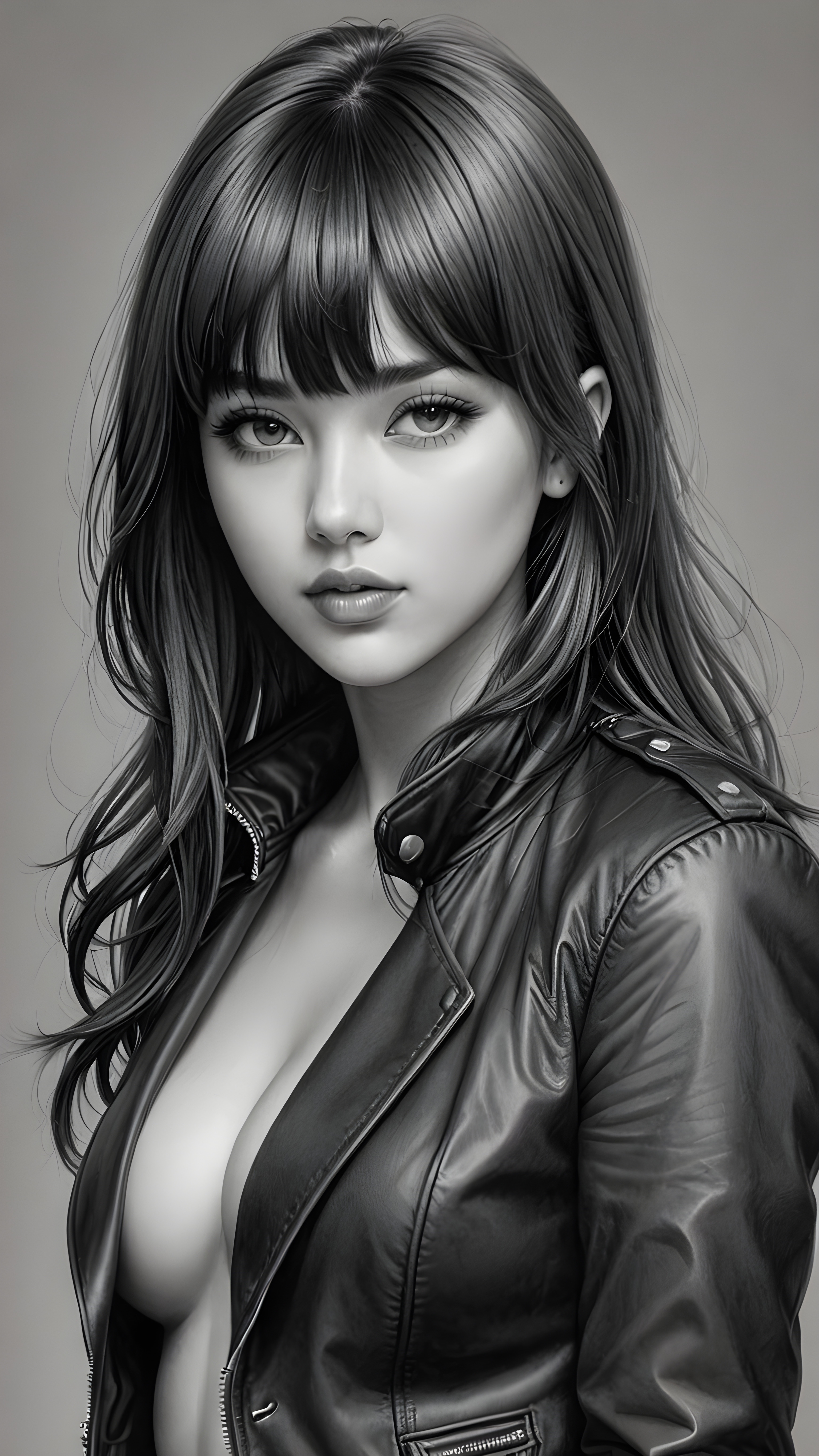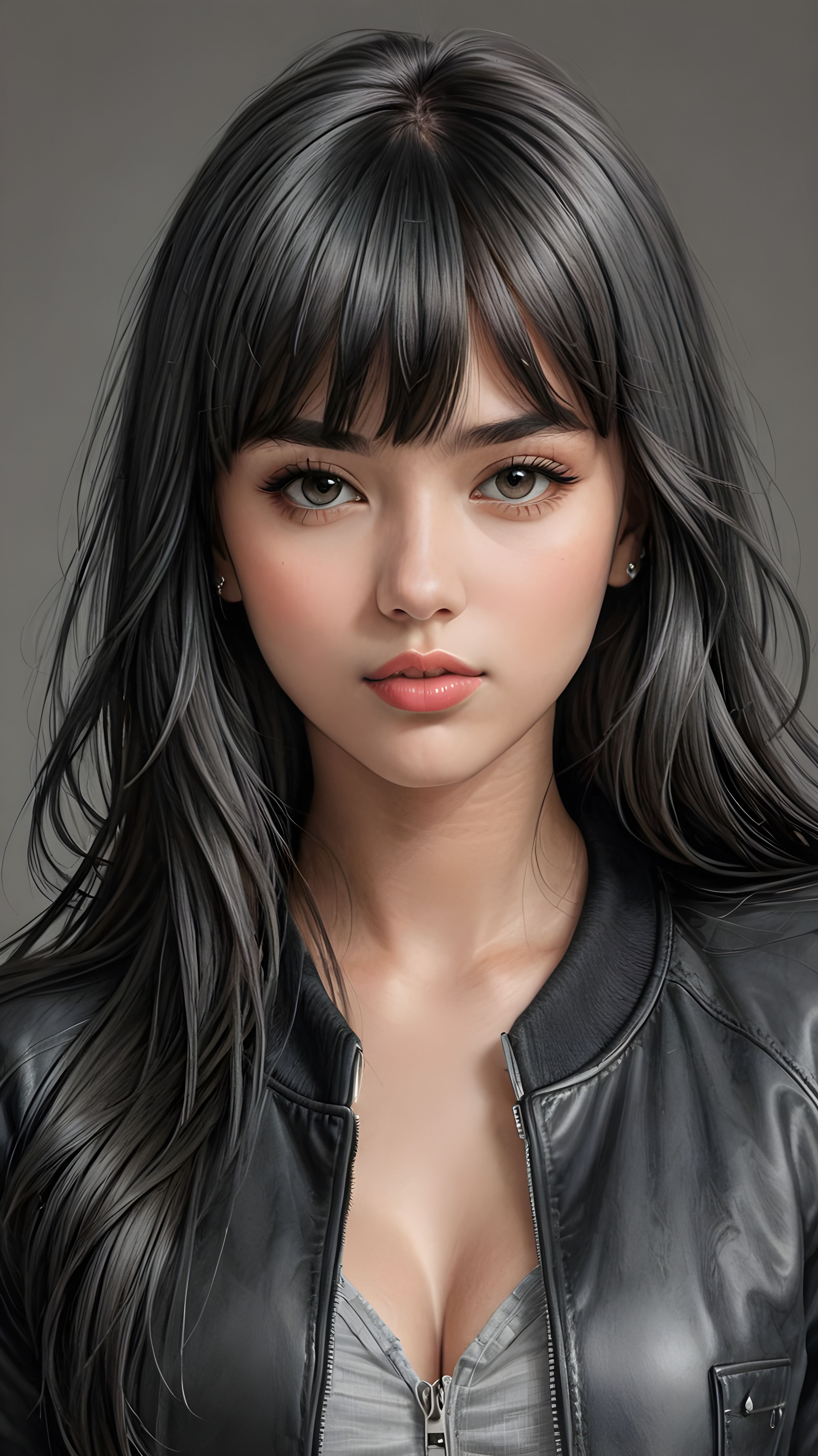 a young beautiful teen girl, perfect curved body, realistic detailed hair, fit body, full lips, crop black jacket, ((straight hair, bangs cut), ((stunning)) ((gorgeous)) ((detailed upper body portrait)), ((grey background)) ((a charcoal pencil drawing by hand))