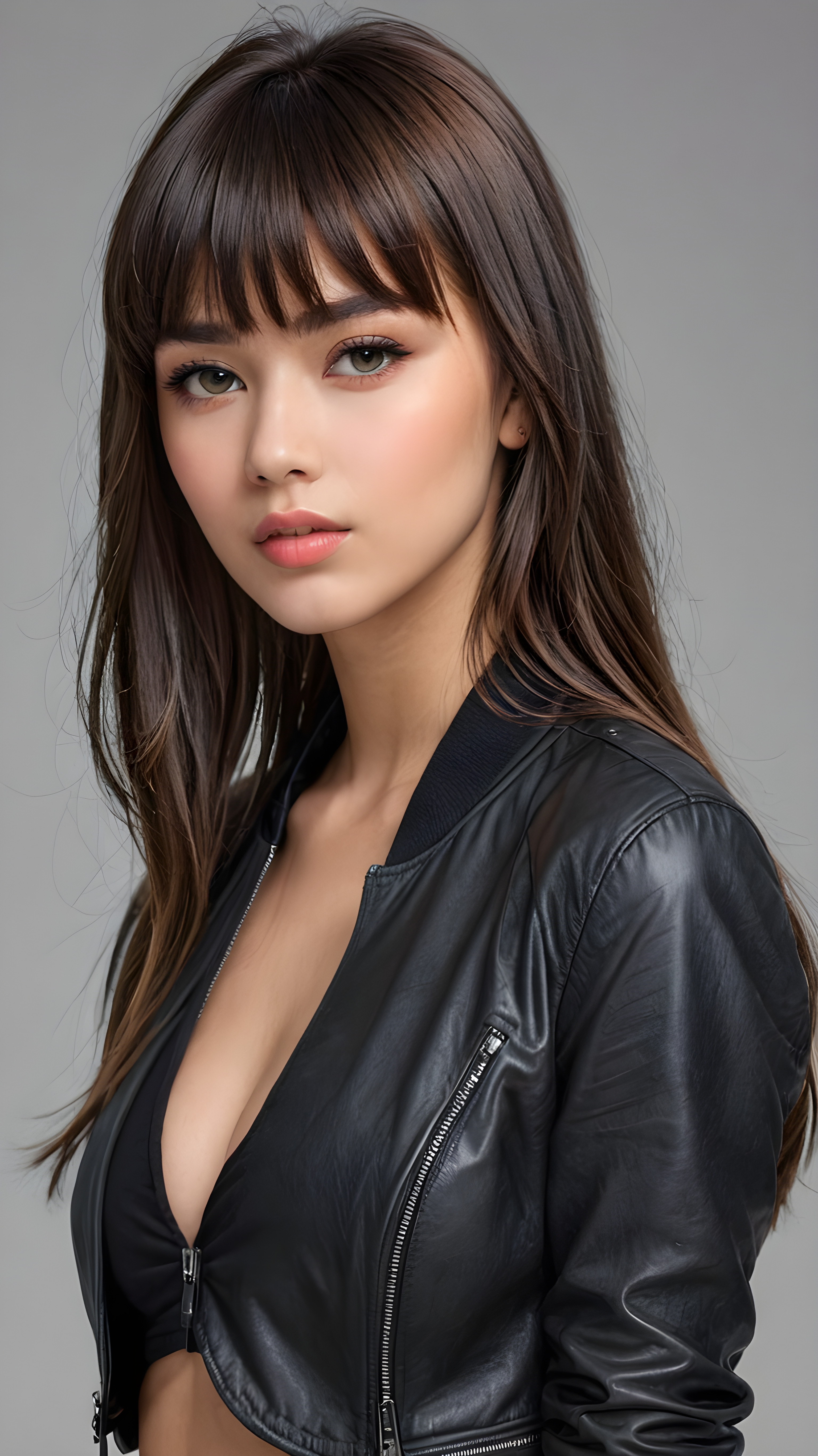 a young beautiful teen girl, perfect curved body, full lips, crop black jacket, ((straight hair, bangs cut), ((stunning)) ((gorgeous)), ((grey background)) ((a figure drawing))
