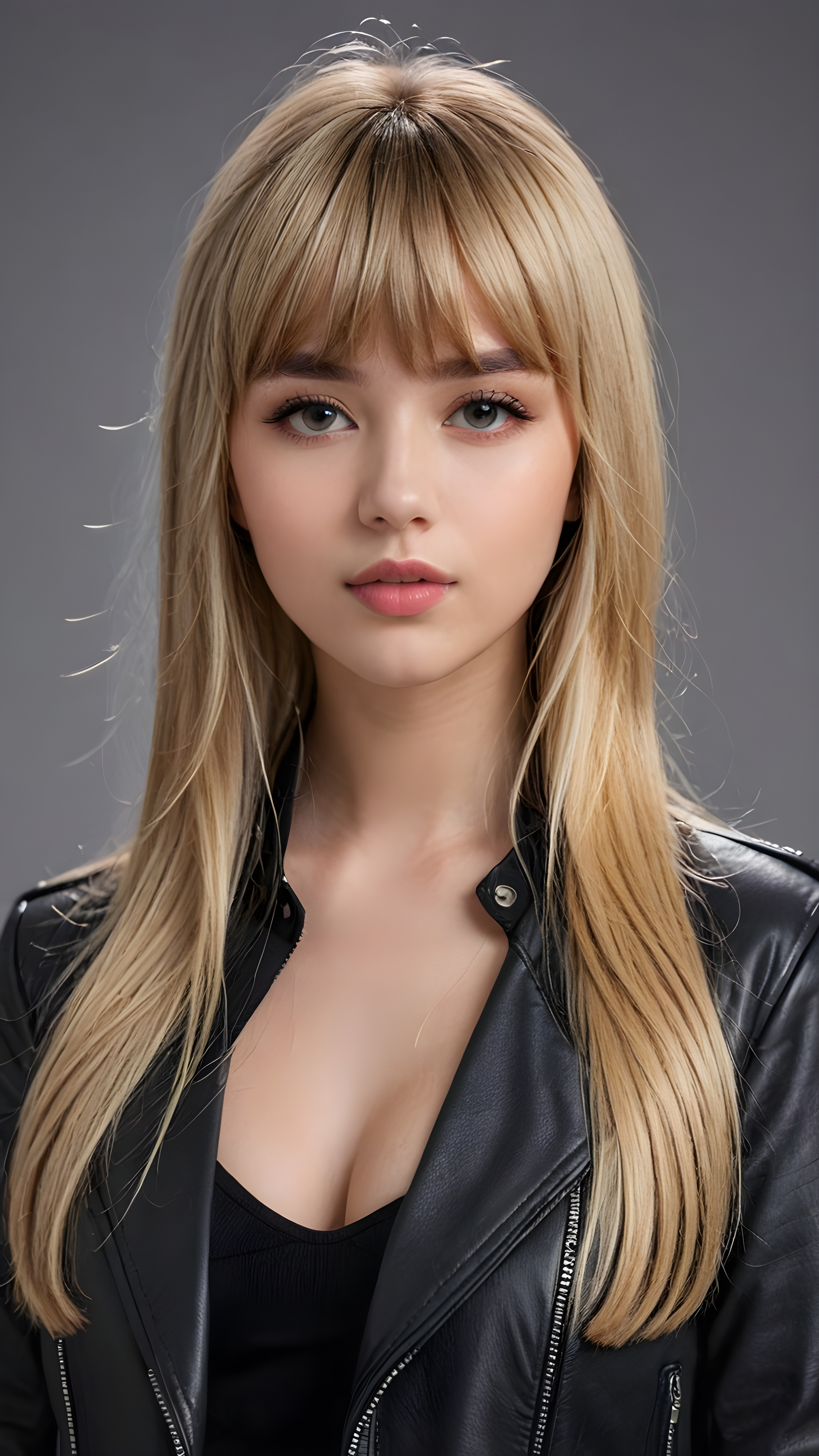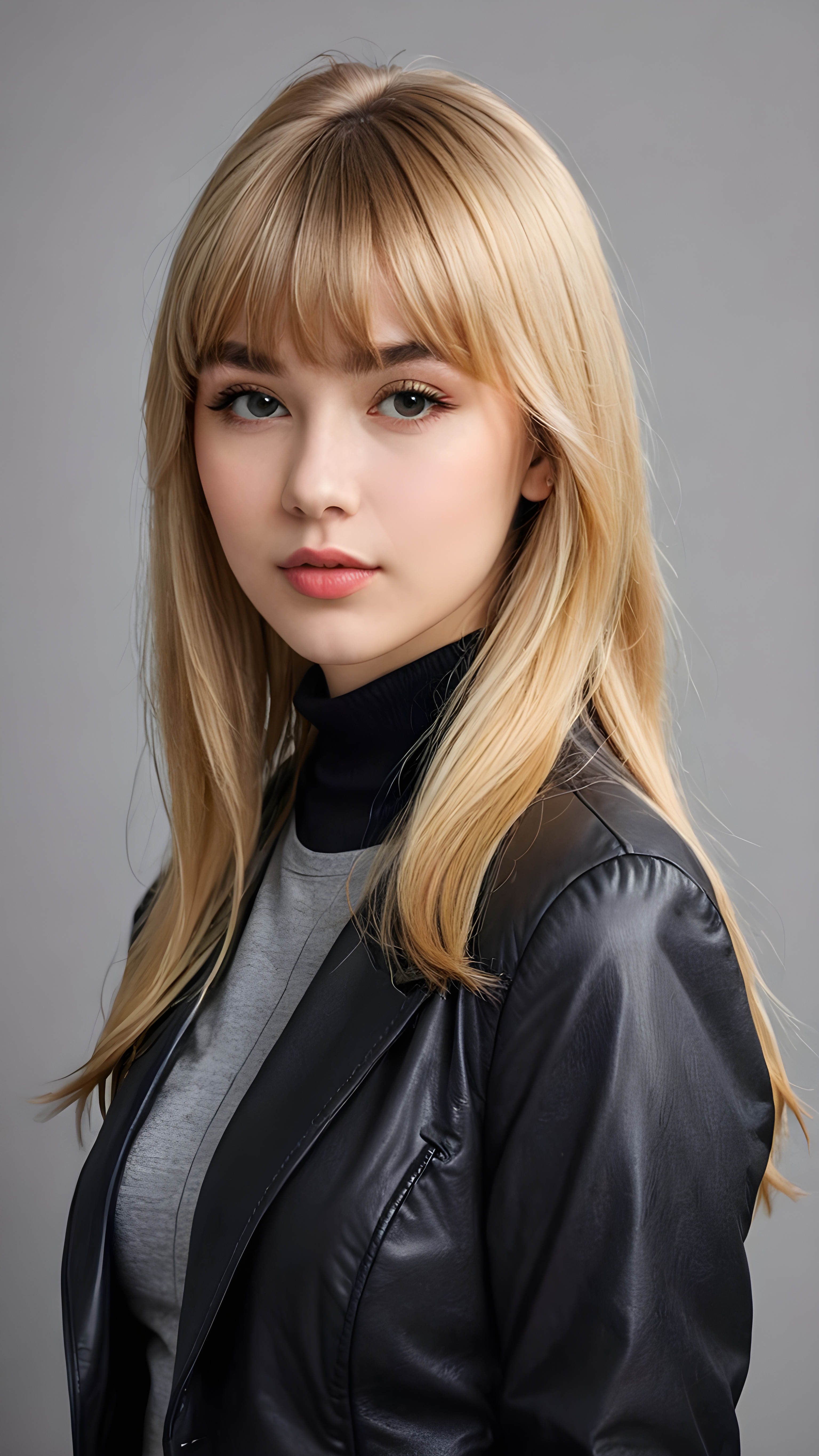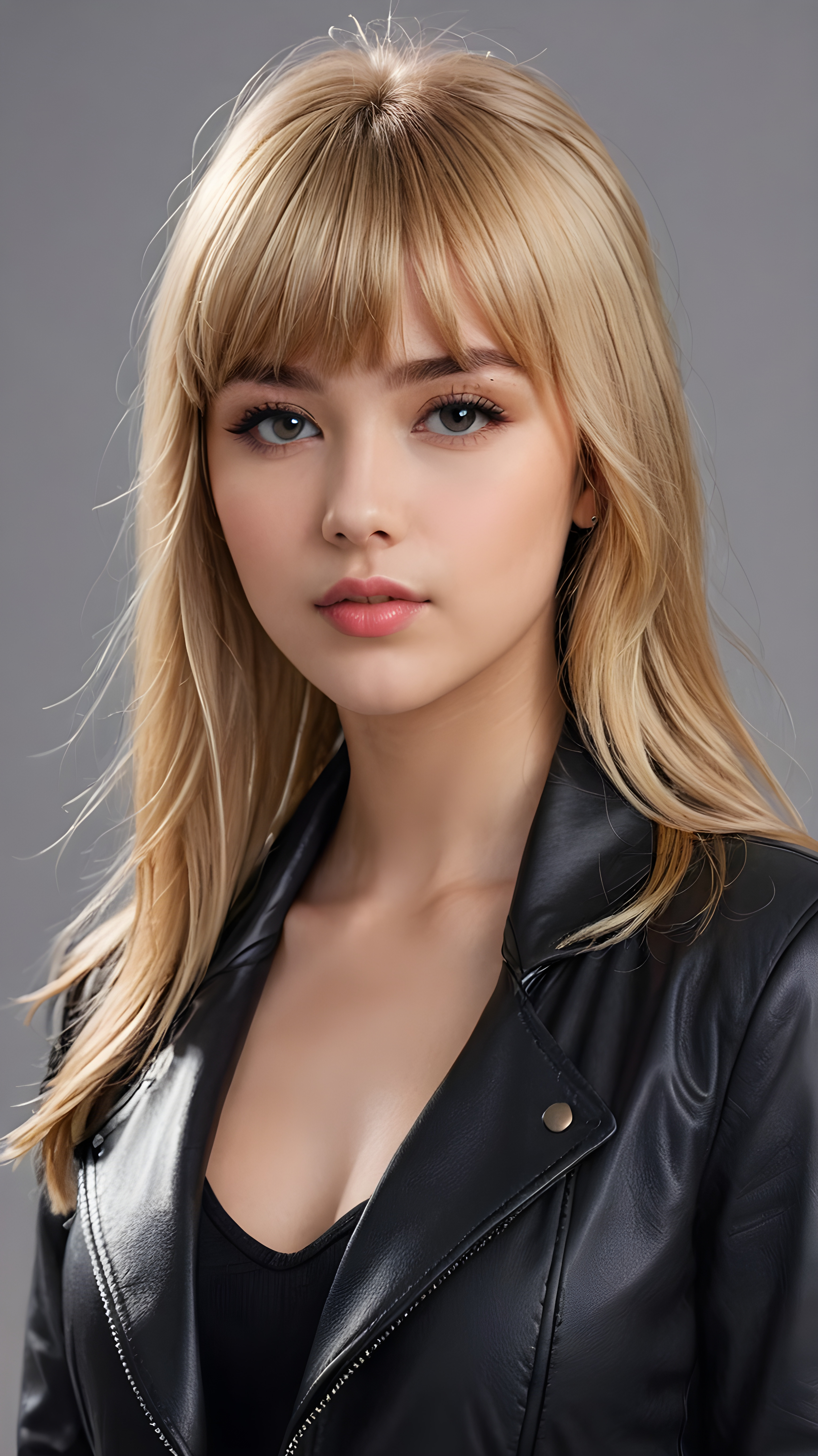 a young beautiful cute petite teen girl, perfect curved body, full lips, wears a black jacket, ((straight blond hair, bangs cut), ((stunning)) ((gorgeous)), ((grey background)) ((a drawing from points))