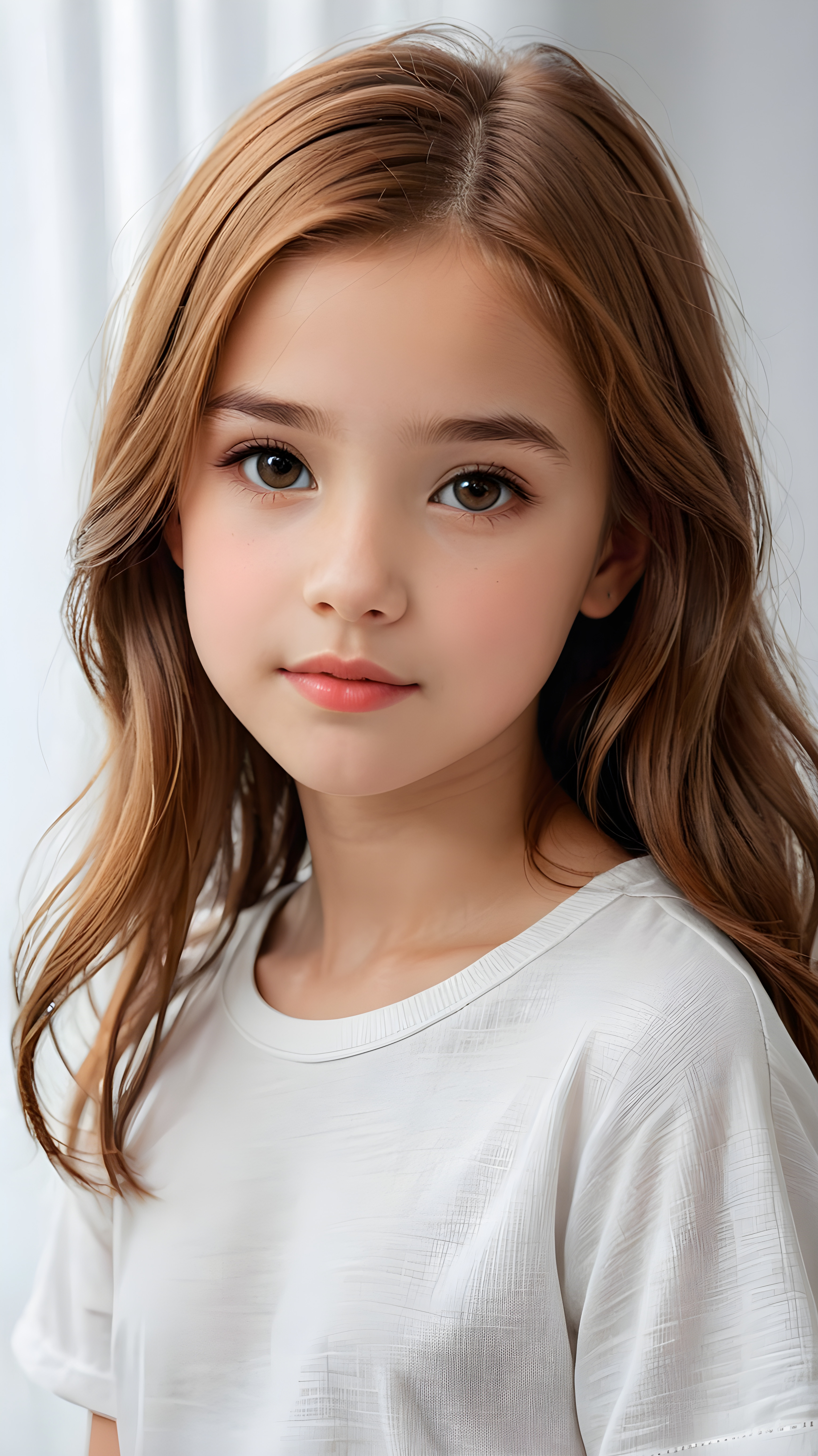 show me a realistic and detailed photo from a thoughtful (((cute and petite girl, 12 years old))) with long, soft, red straight hair, round face, soft lips and grey eyes that give off a romantic glow, the girl wears a white t-shirt