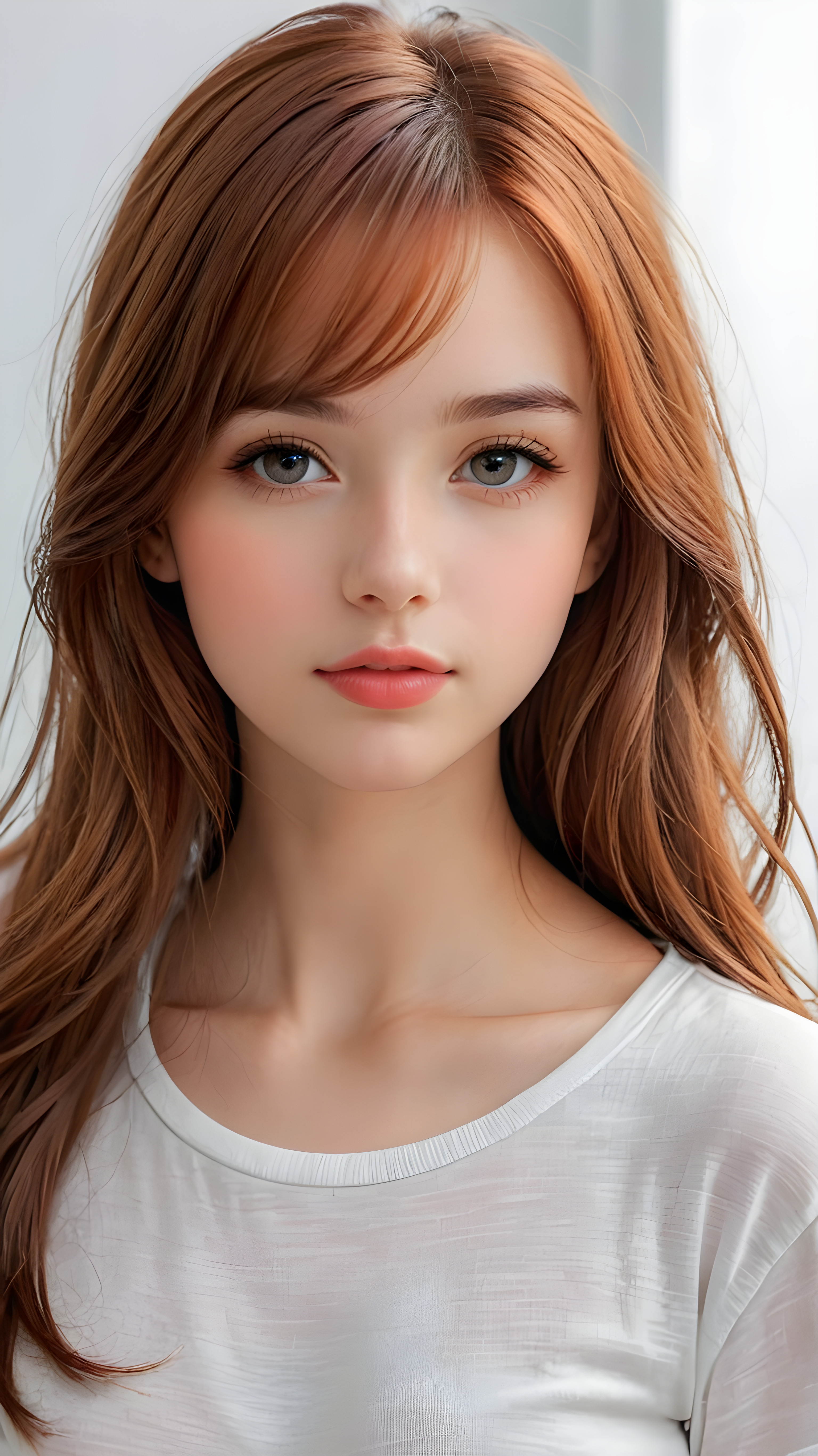 show me a realistic and detailed photo from a thoughtful (((cute and petite girl))) with long, soft, red straight hair, soft lips and grey eyes that give off a romantic glow, the girl wears a white t-shirt