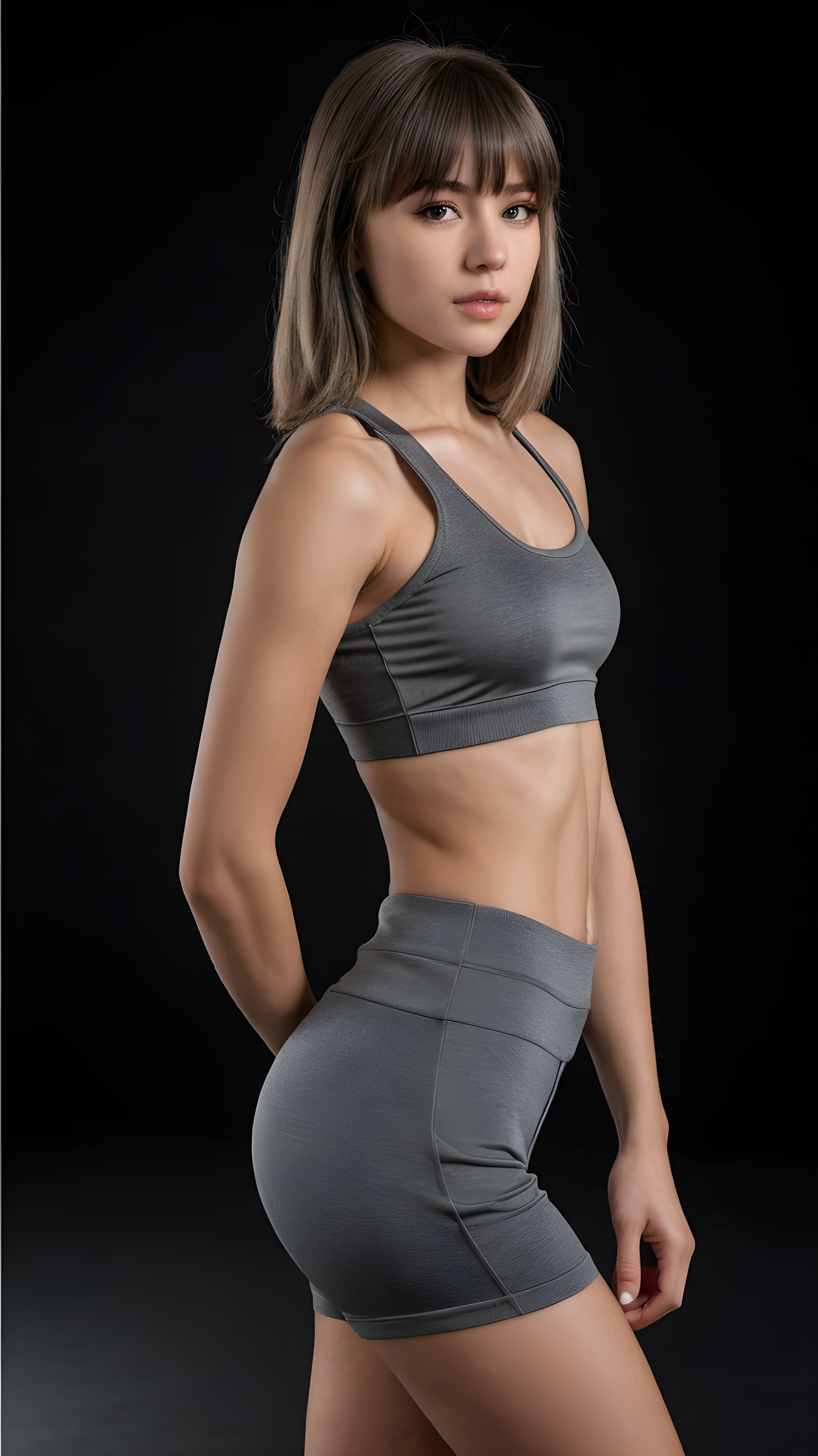 a young beautiful teen girl, perfect curved body, fit body, weak, dimmed light, ((straight hair, bangs cut), ((stunning)) ((gorgeous)), ((black background)), ((grey short and tight sport crop top)) ((grey short pants)) ((side view))