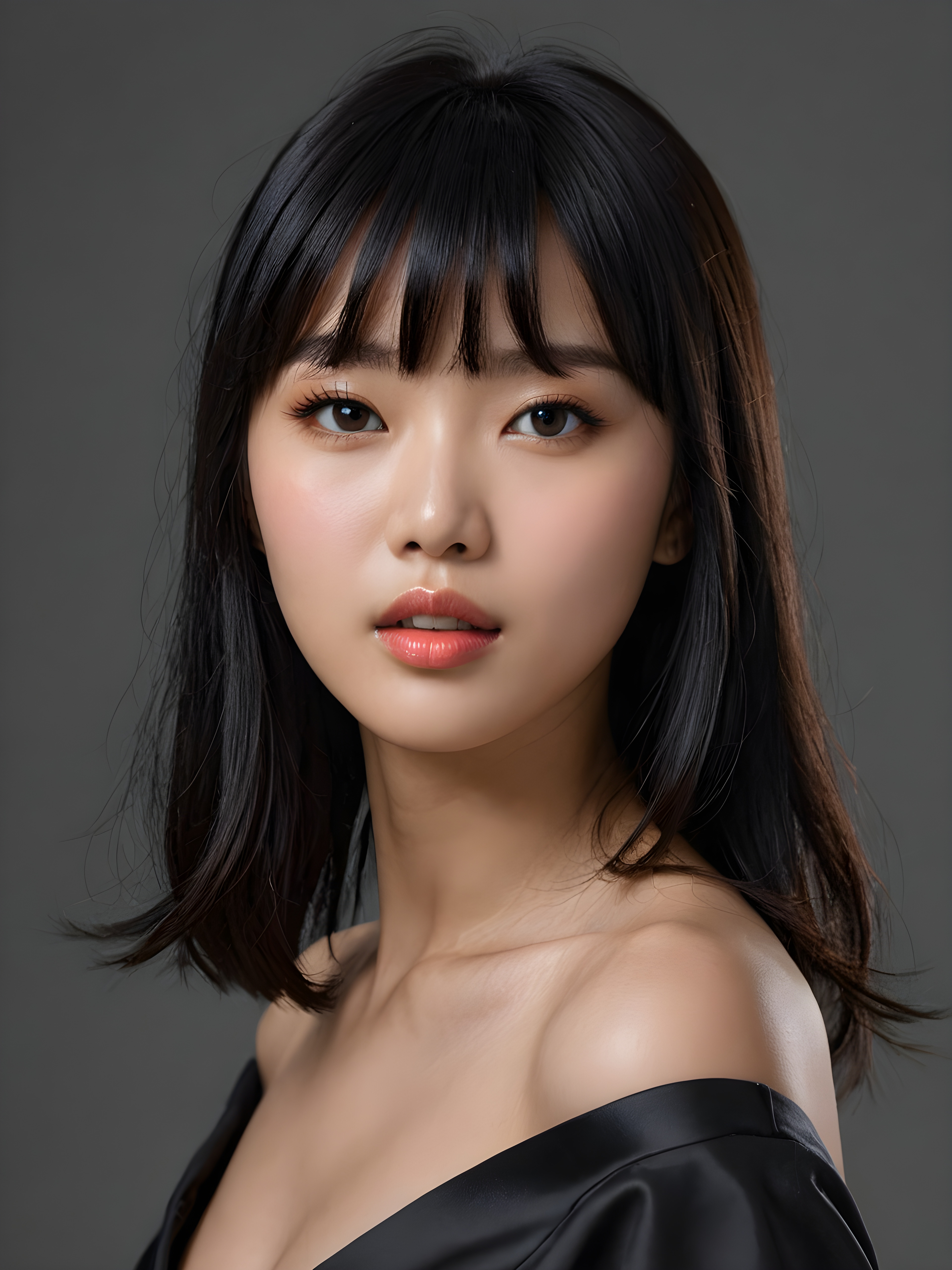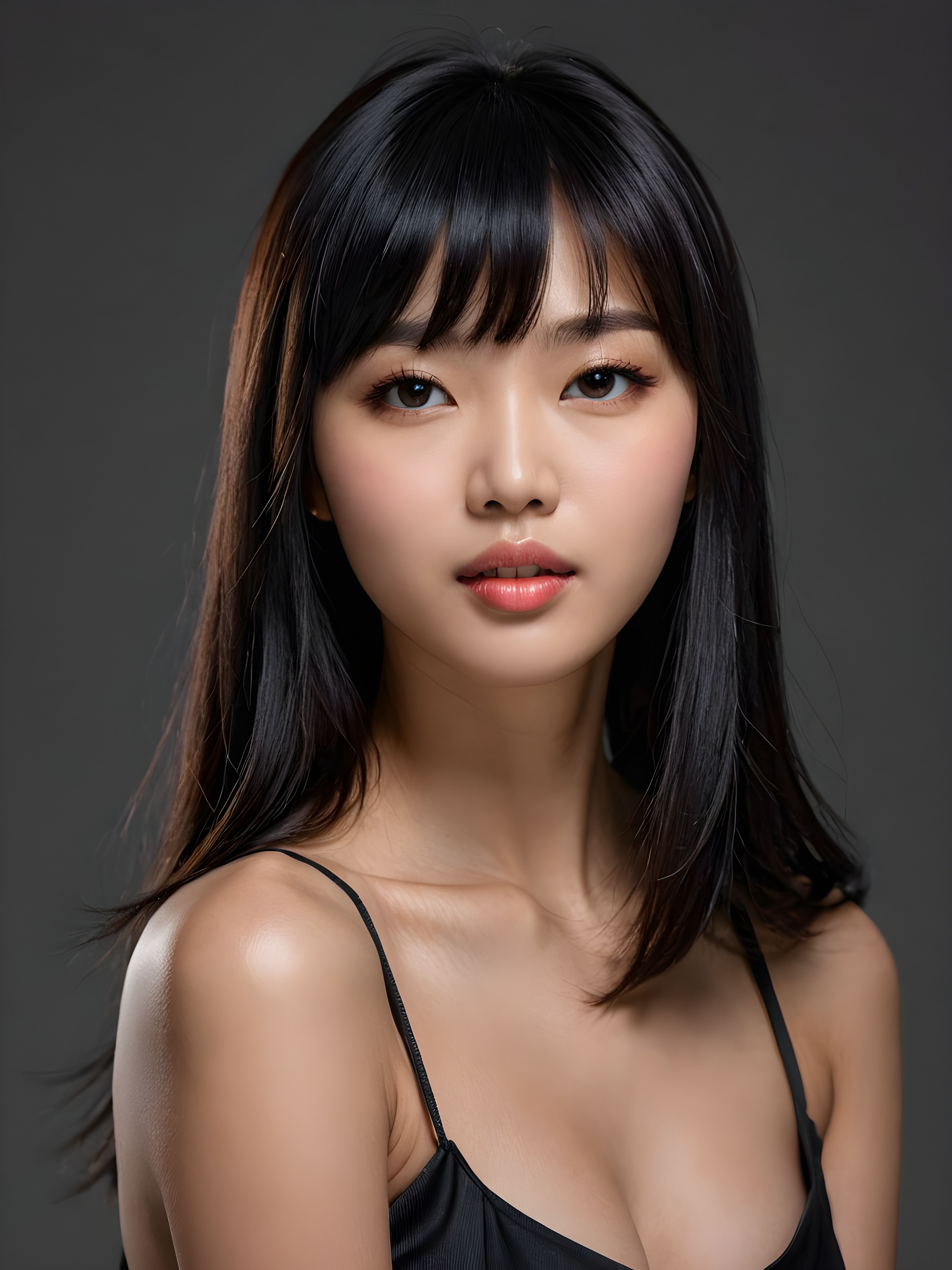 a young, fascinating Korean girl, shiny, jet black hair in bangs cut, full lips, lightly dressed, mouth slightly open with a seductive look, ((stunning)) ((gorgeous)), ((grey background))