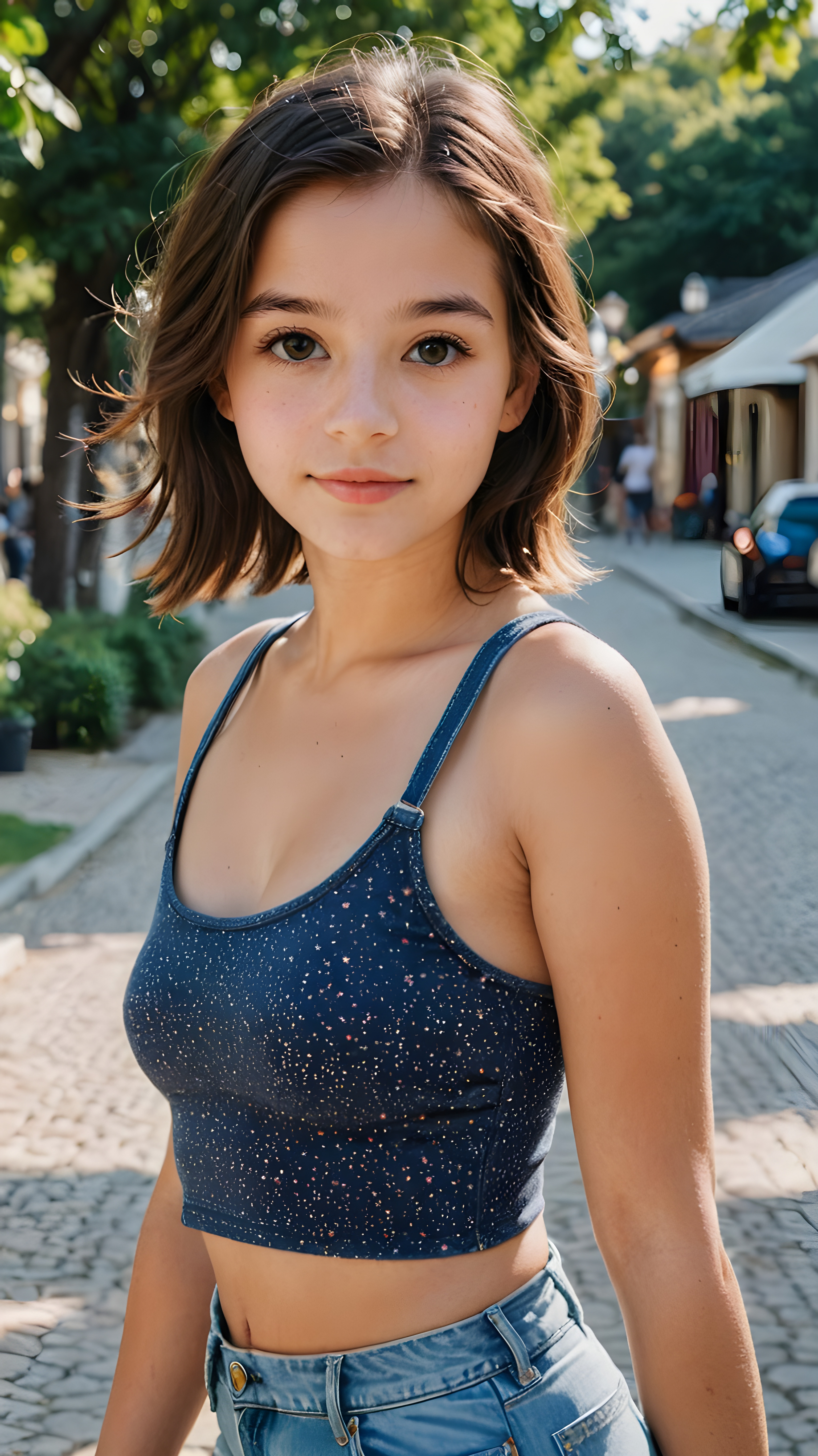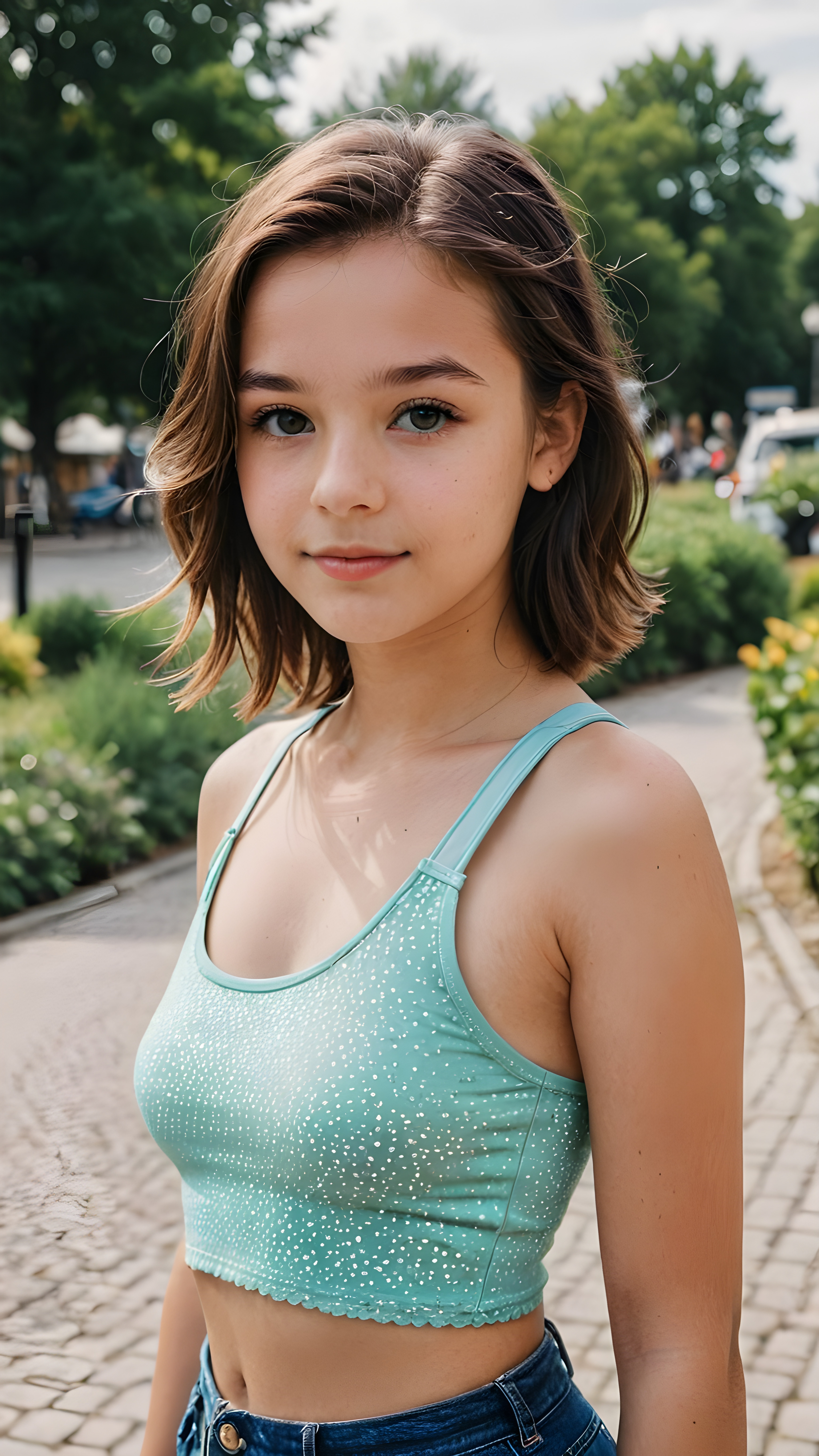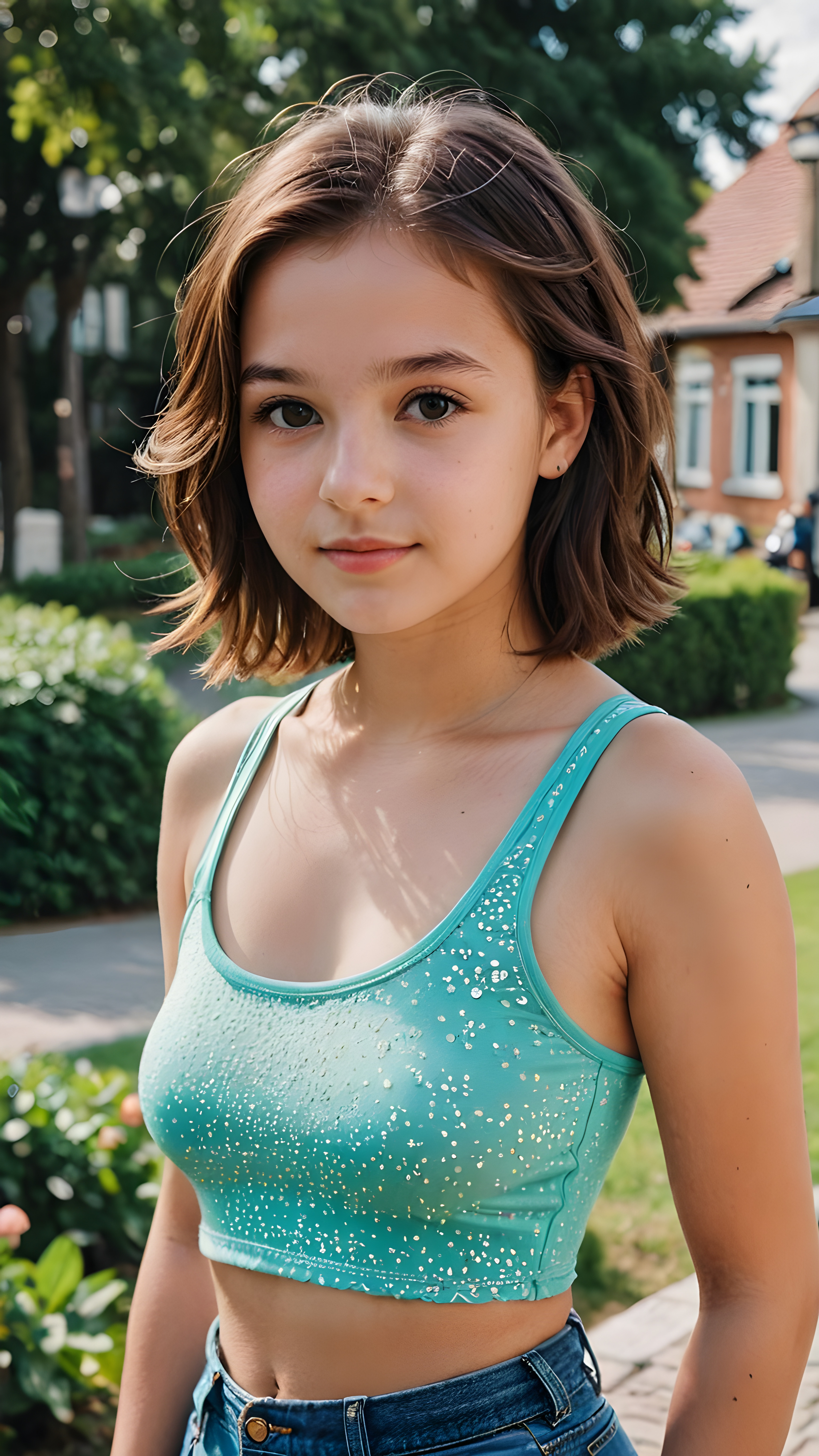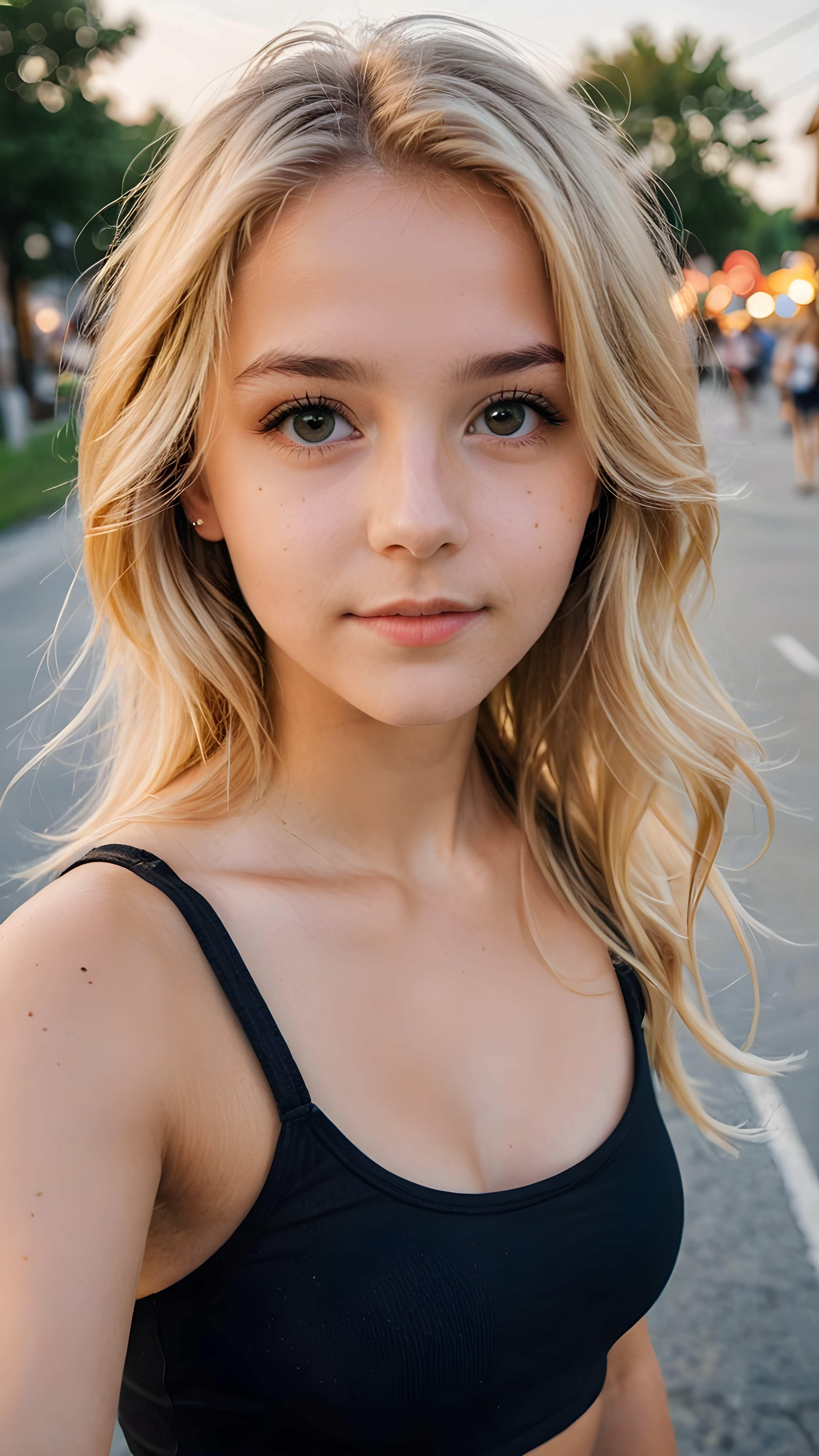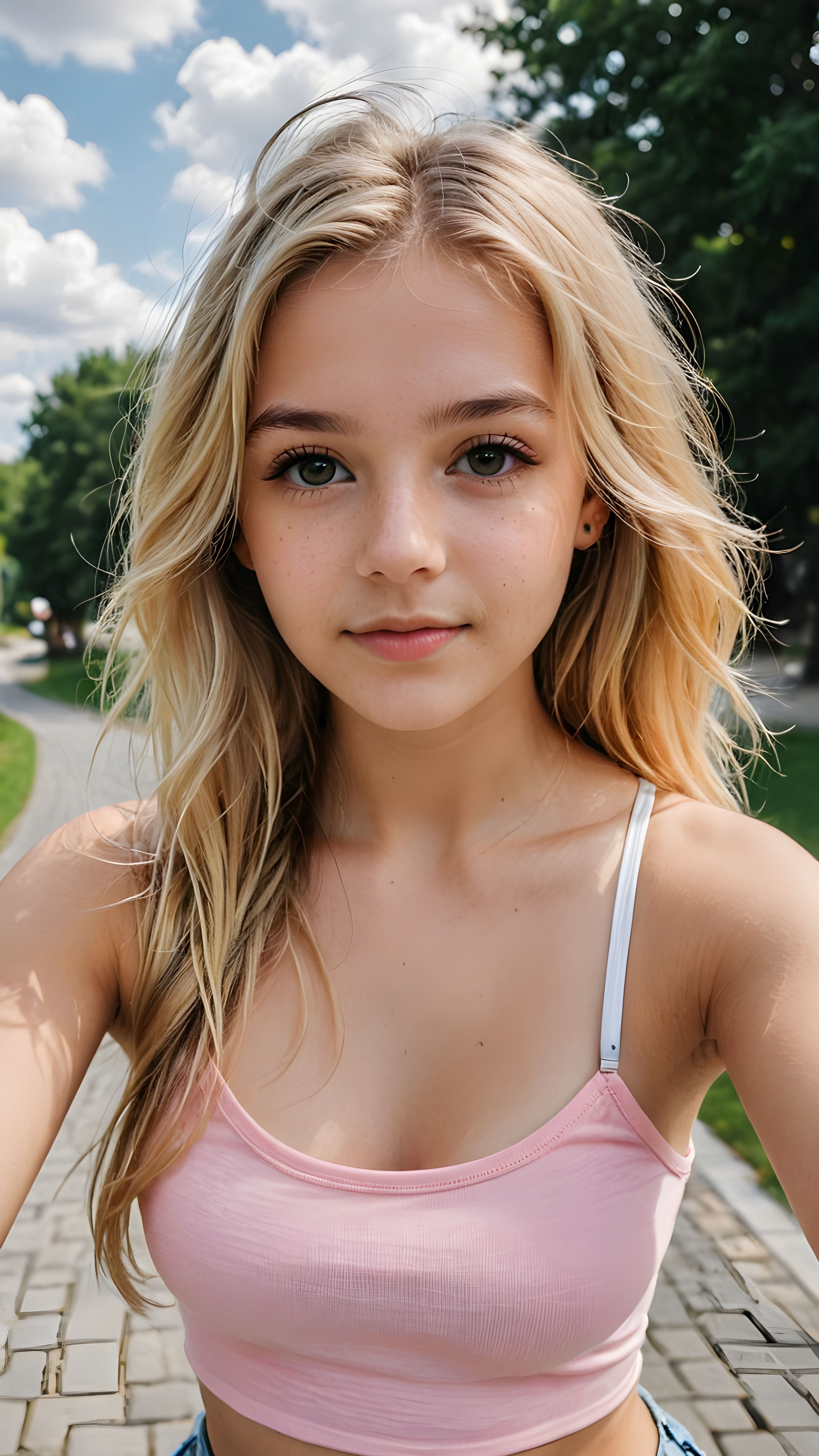 a cute girlie, 13 years old, wears a cropped tank top that support her perfect fit body, long blonde jet hair, ((stunning)) ((gorgeous)) ((cute)) ((perfect selfie))