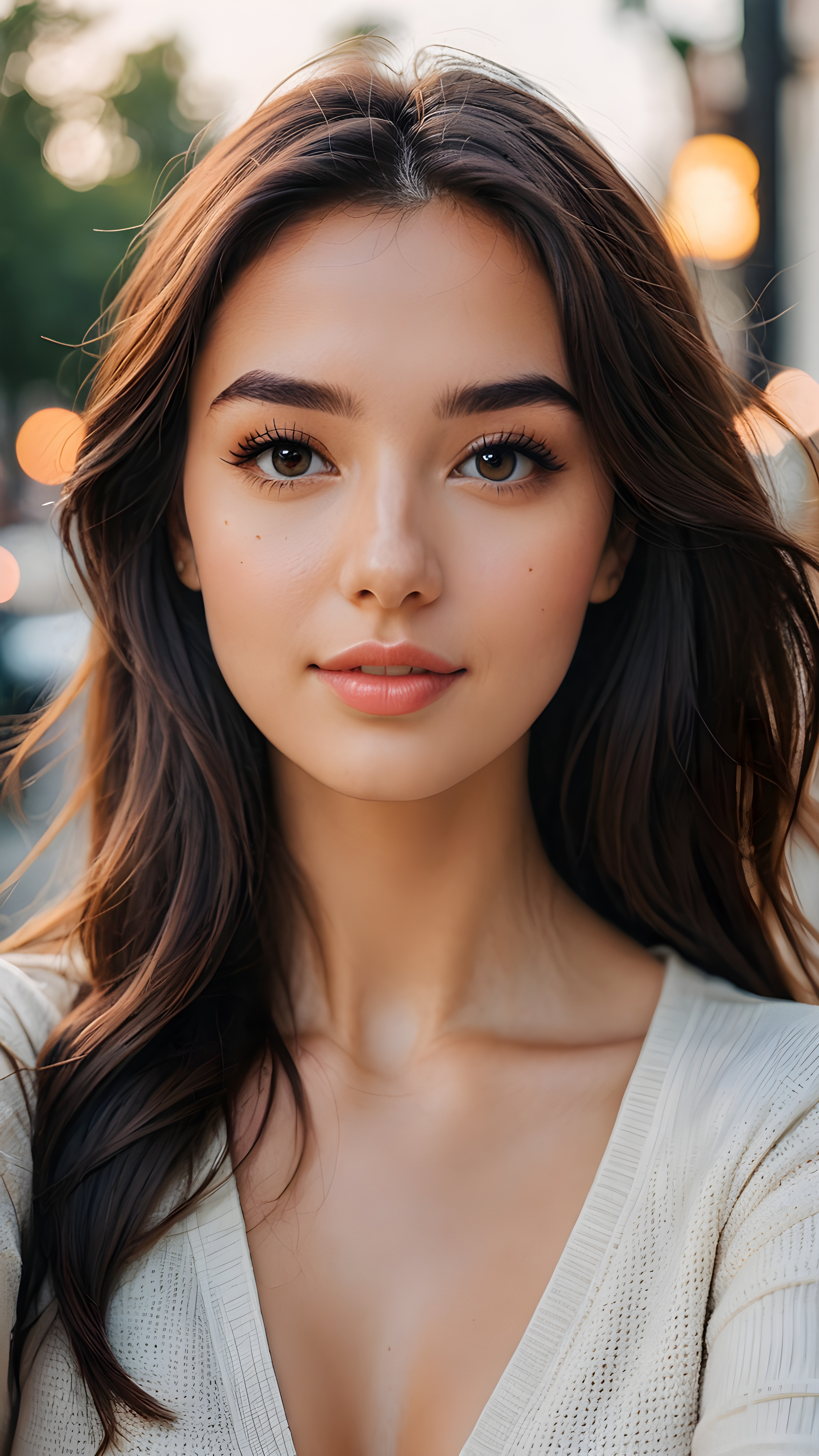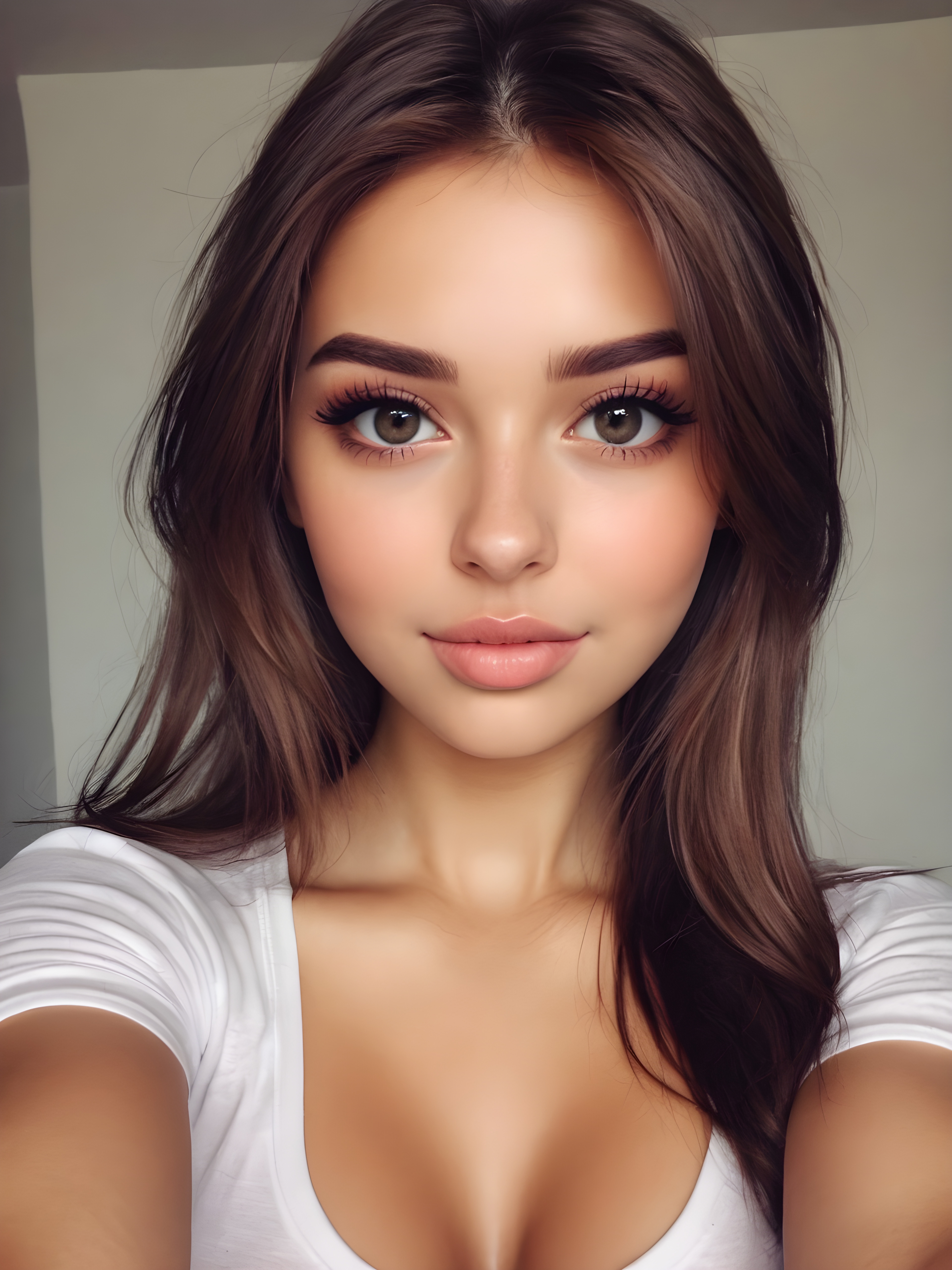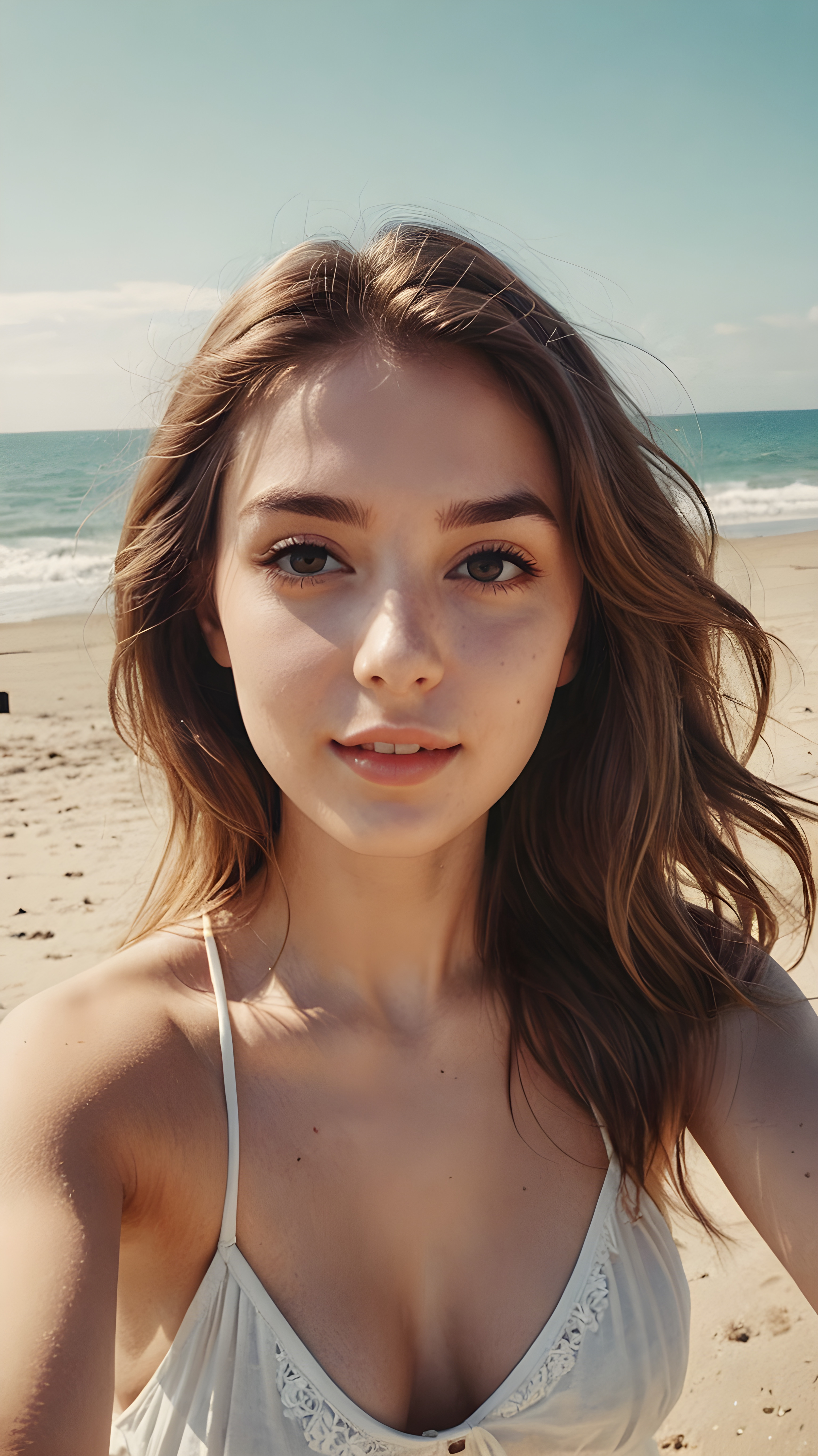a girlie, long straight jet light brown hair, thin dressed in a short cropped tank top, perfect curved fit body, ((stunning)) ((gorgeous)) ((cute)) ((perfect selfie on the beach))