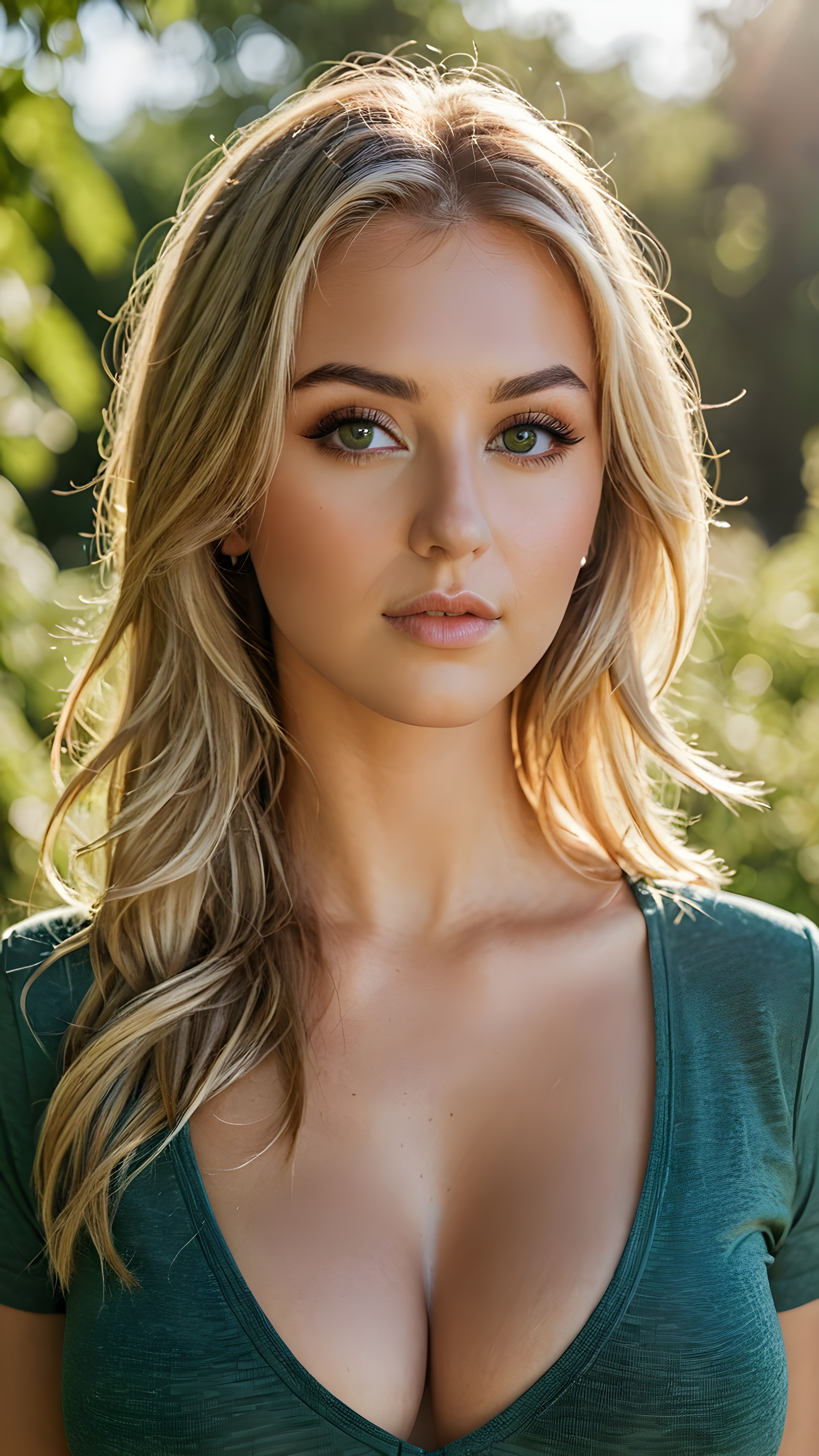a ((high resolution)) photo, capturing a (((3/4 shot))) of a (((young busty girl))), long straight summer blonde hair, with ((intricate details around her eyes)), dressed in ((sexy thin t-shirt, deep v-neck, open front)), in a (subtly detailed, yet vividly realistic colors). Her ((skin glows)) against the ((sunny green)) backdrop, suggesting a whimsically romantic atmosphere