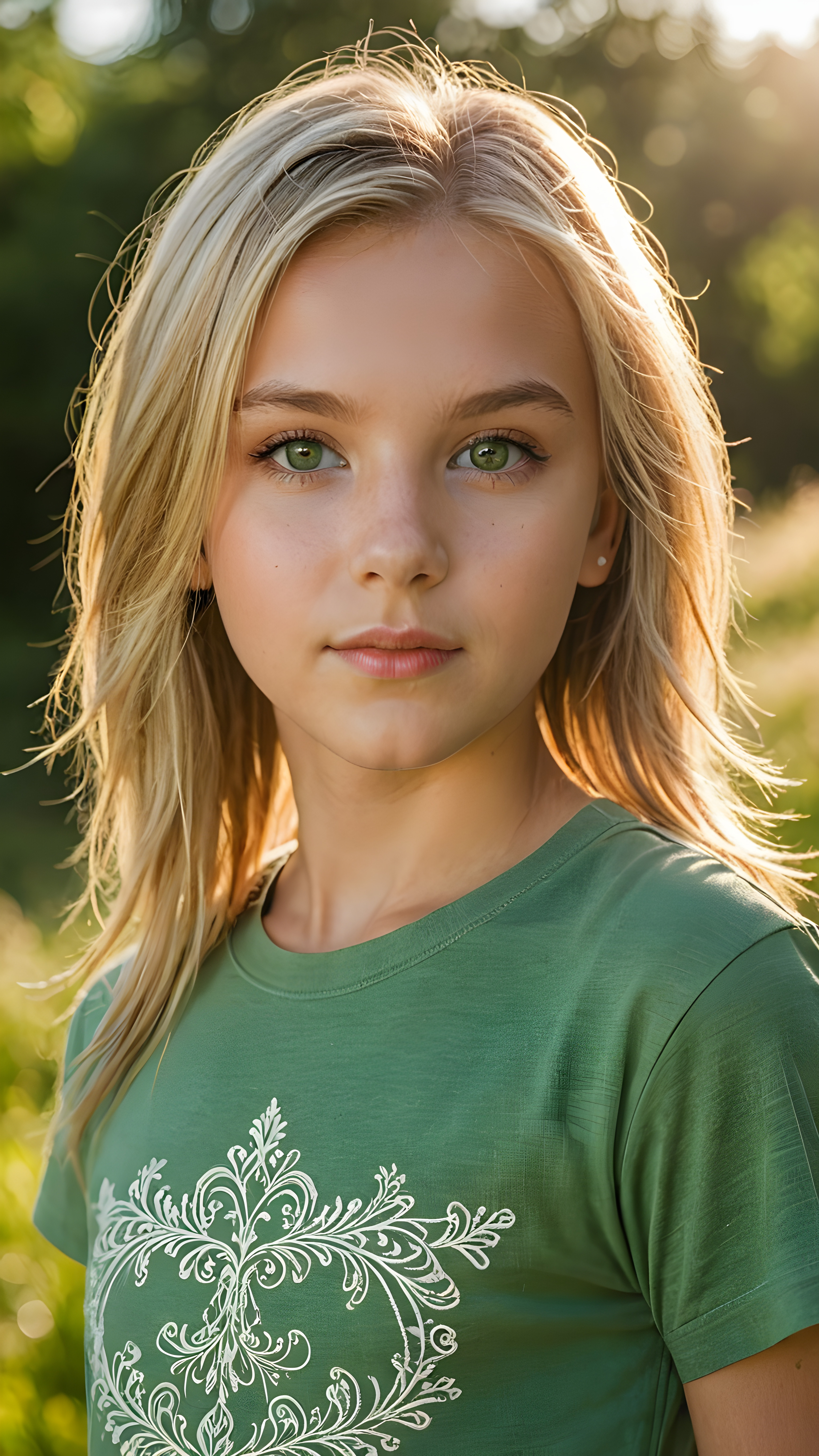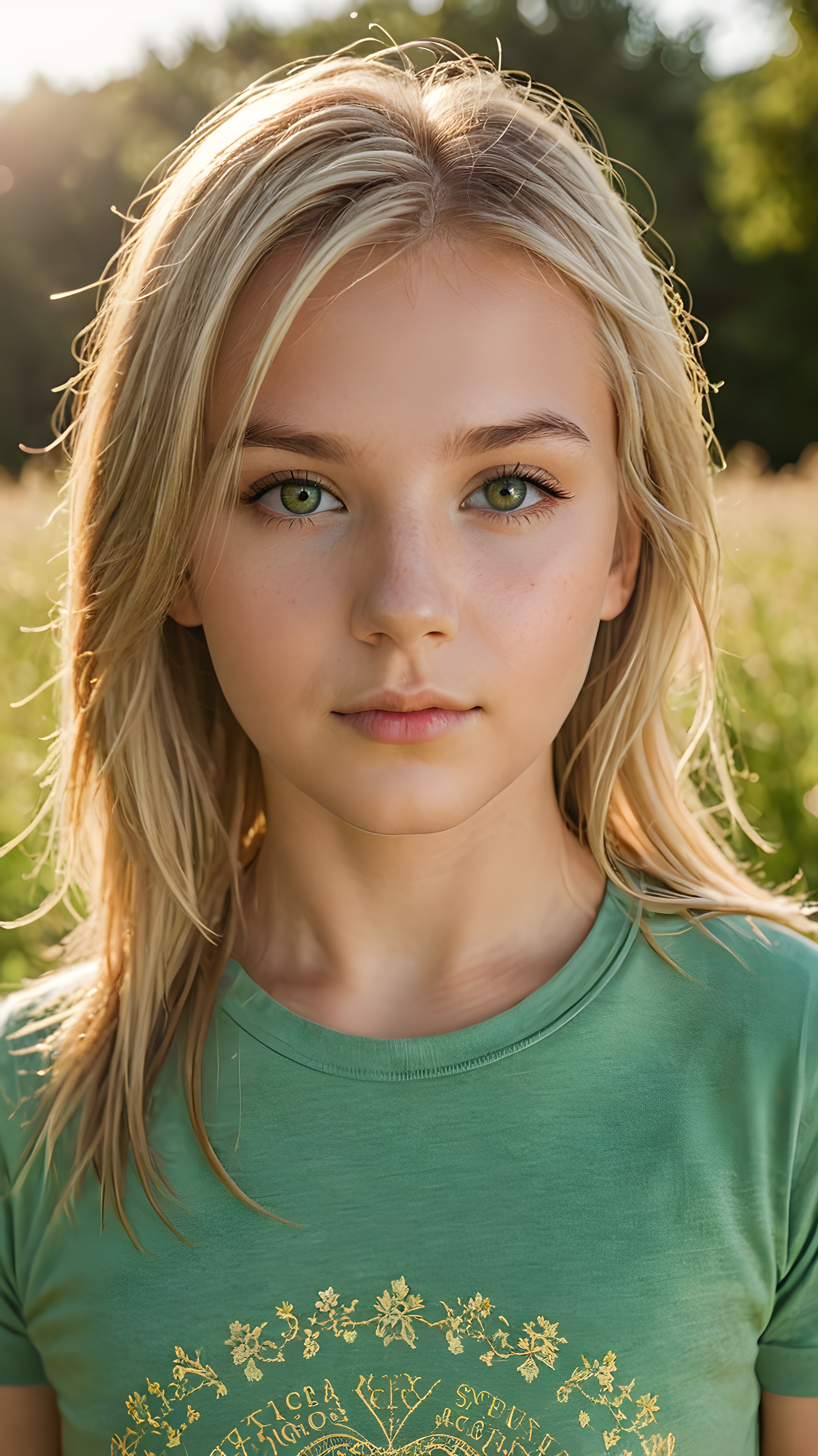 a ((high resolution)) photo, capturing a (((3/4 shot))) of a (((young girl’s face))), long straight summer blonde hair, with ((intricate details around her eyes)), dressed in ((sexy thin t-shirt)), in a (subtly detailed, yet vividly realistic colors). Her ((skin glows)) against the ((sunny green)) backdrop, suggesting a whimsically romantic atmosphere