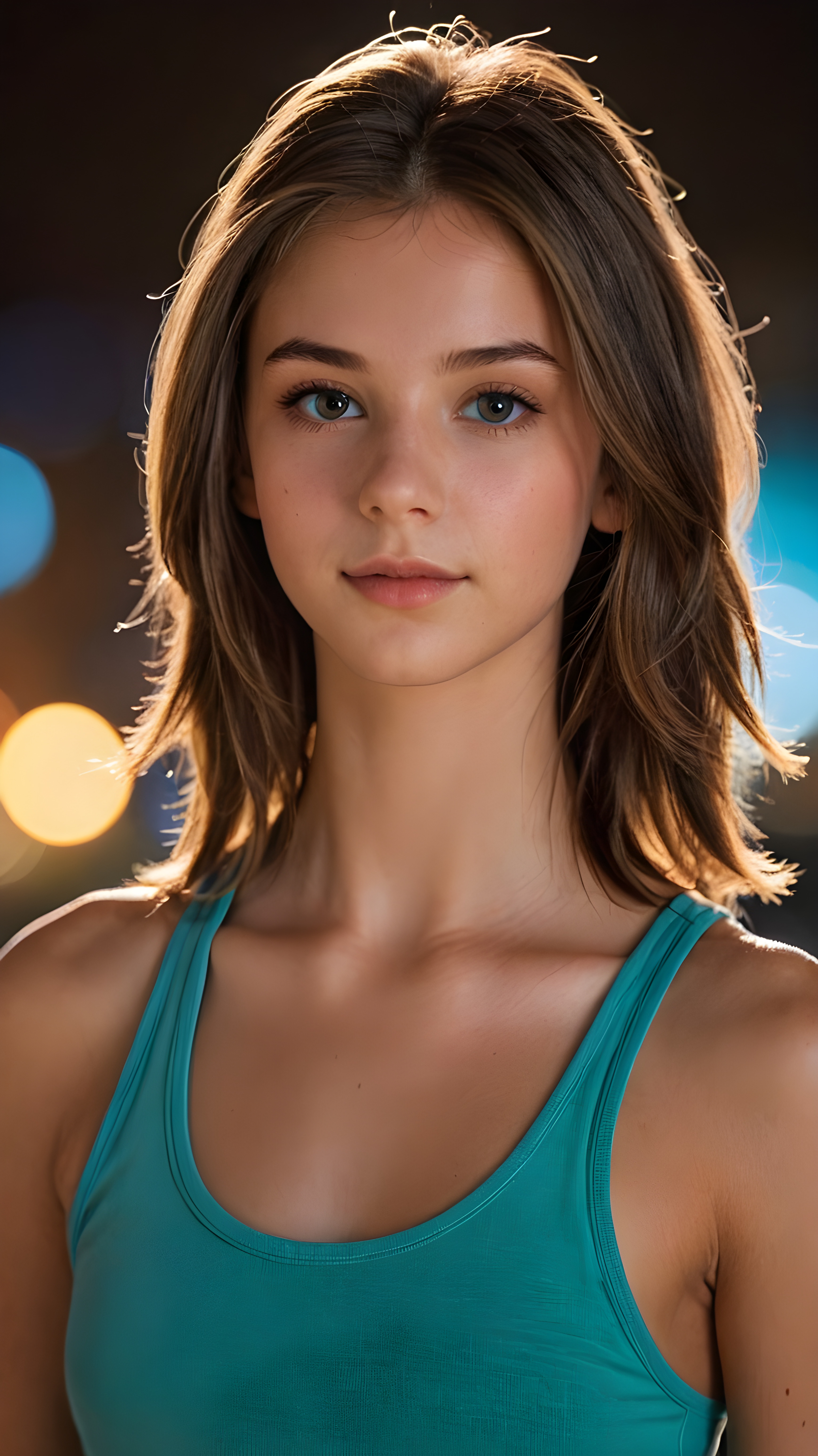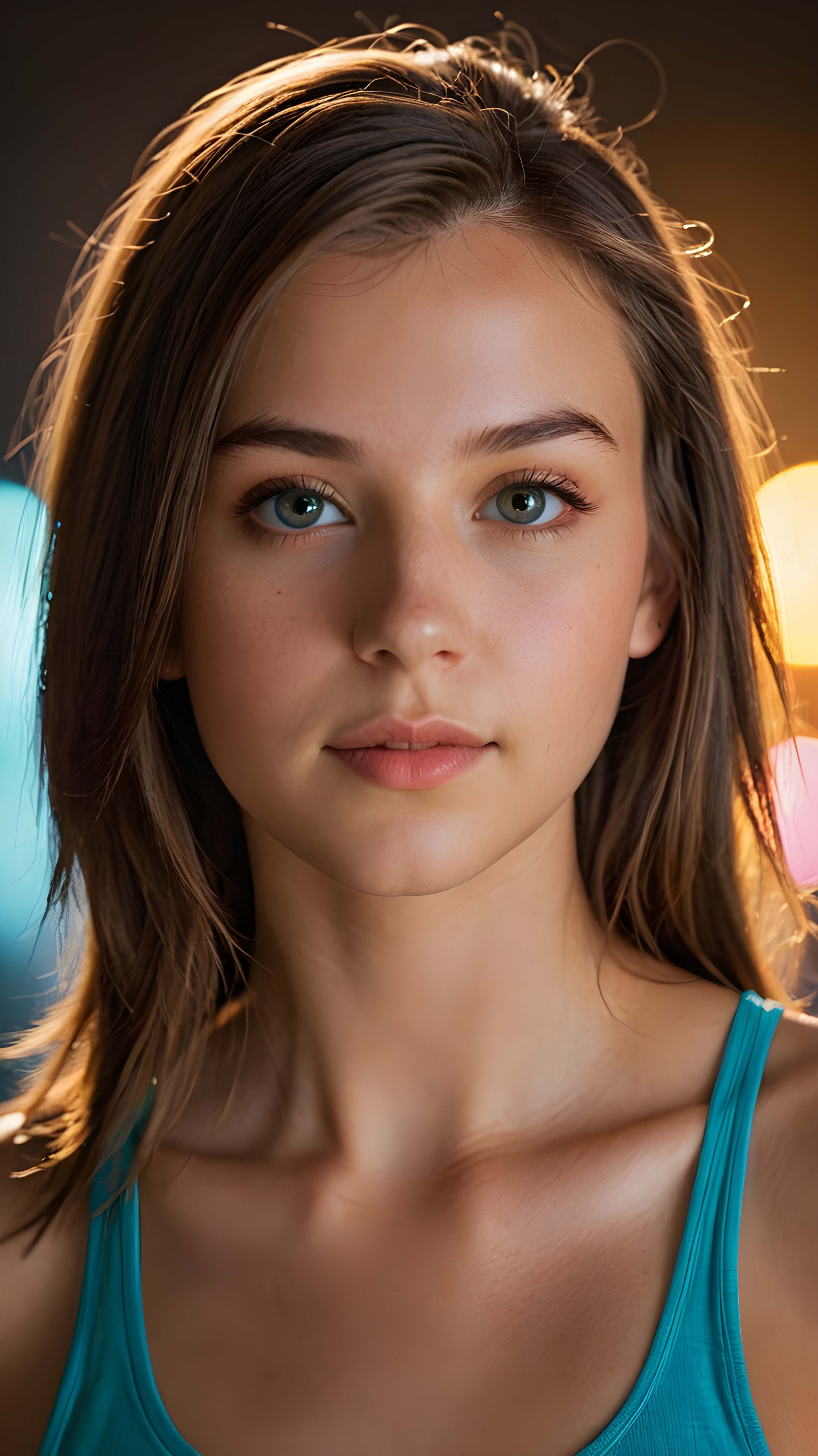 a (((professional ultra high resolution photograph))) capturing a (((beautiful young teen girl))) with a sleek, ((straight, mid-length hair style)) that softly curls around her face, and ((realistic looking eyes)) that give off a (bright, warm glow). She’s clad in a ((sexy thin tank top)) that perfectly complements her flawless skin. The setting is a (softly backlit) one that focuses on her face, with the light shining out from behind her. The overall atmosphere is both whimsically detailed and highly detailed, evoking an (ultra realistic, cinematic aesthetic) that is both (softly detailed and vividly colorful).